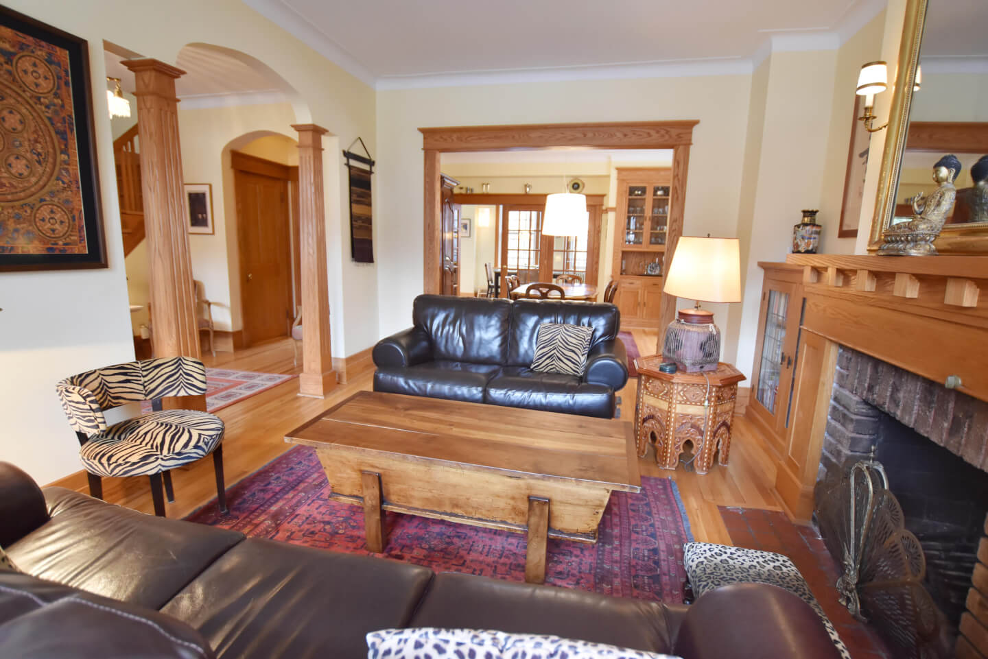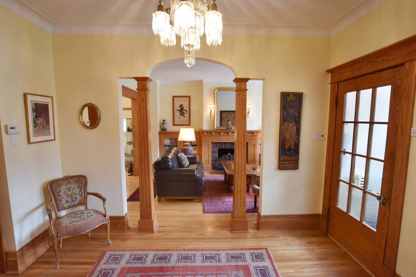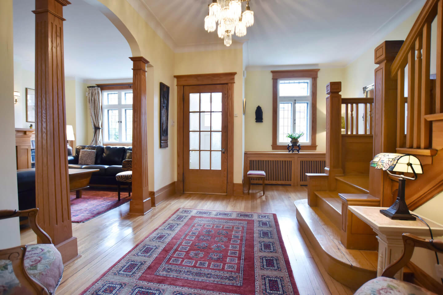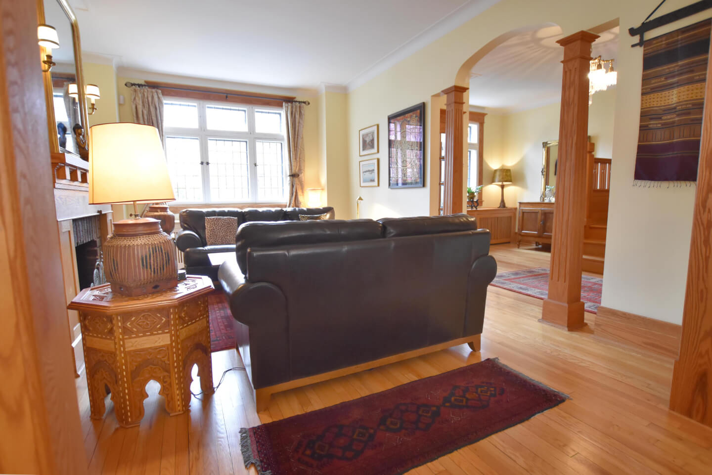 Élégant Salon avec de belles colonnes architecturales, 2 meubles encastrés avec verre plombé de chaque côté de la cheminée. Celui-ci ouvert sur la salle à manger(Foyer non fonctionnel selon la règlementation de la Ville de Montréal)