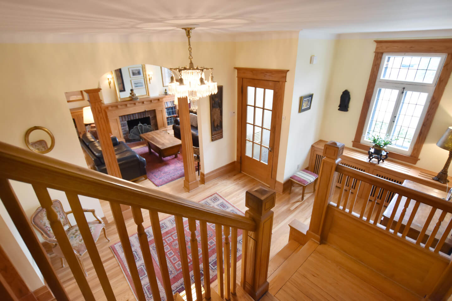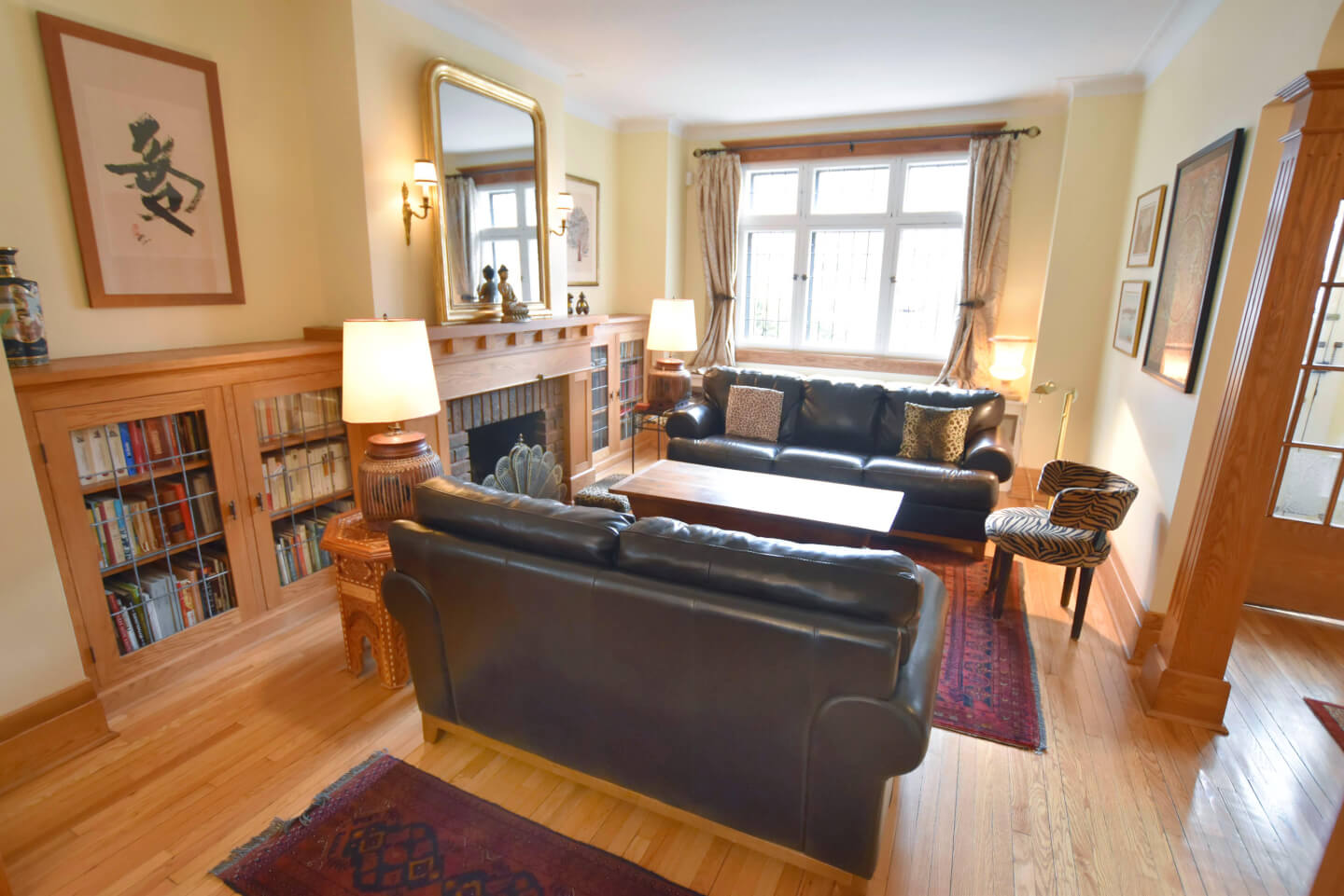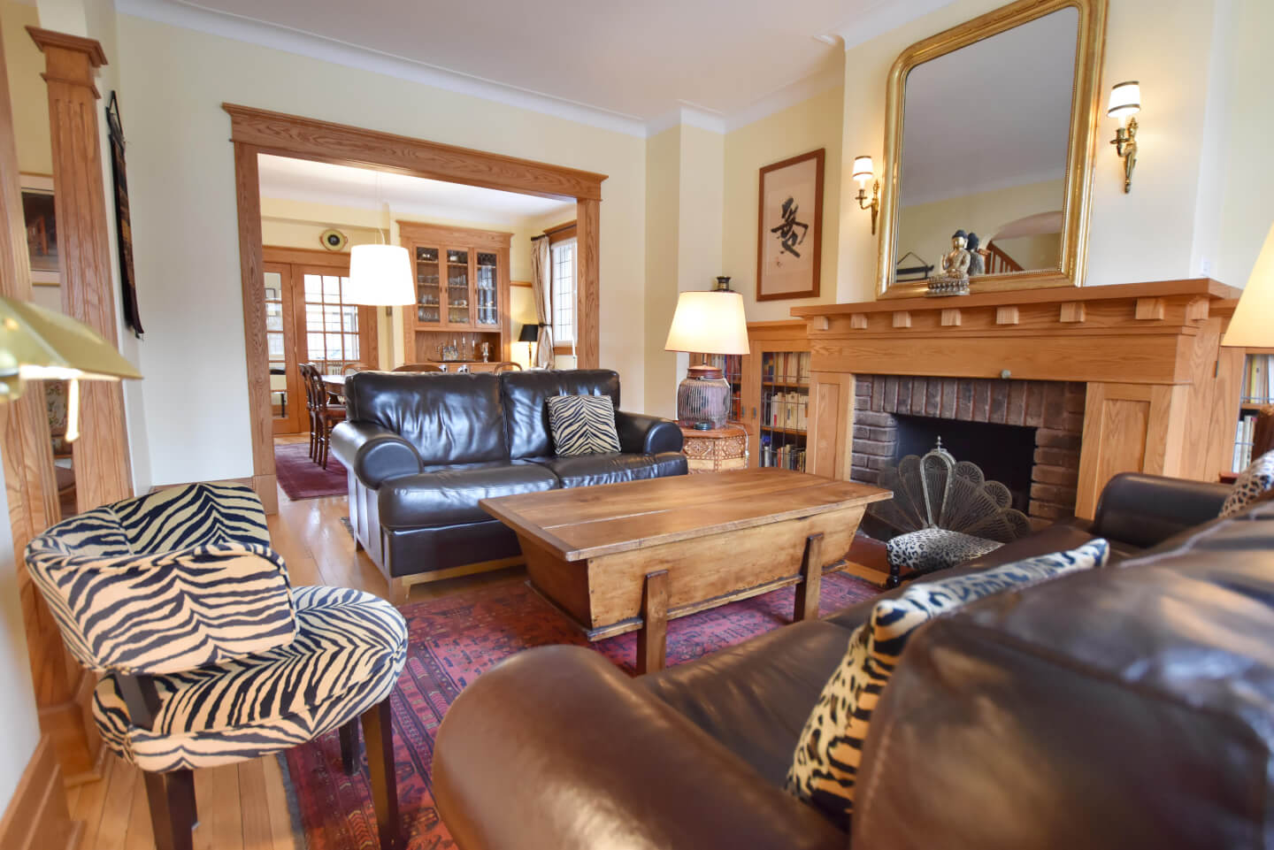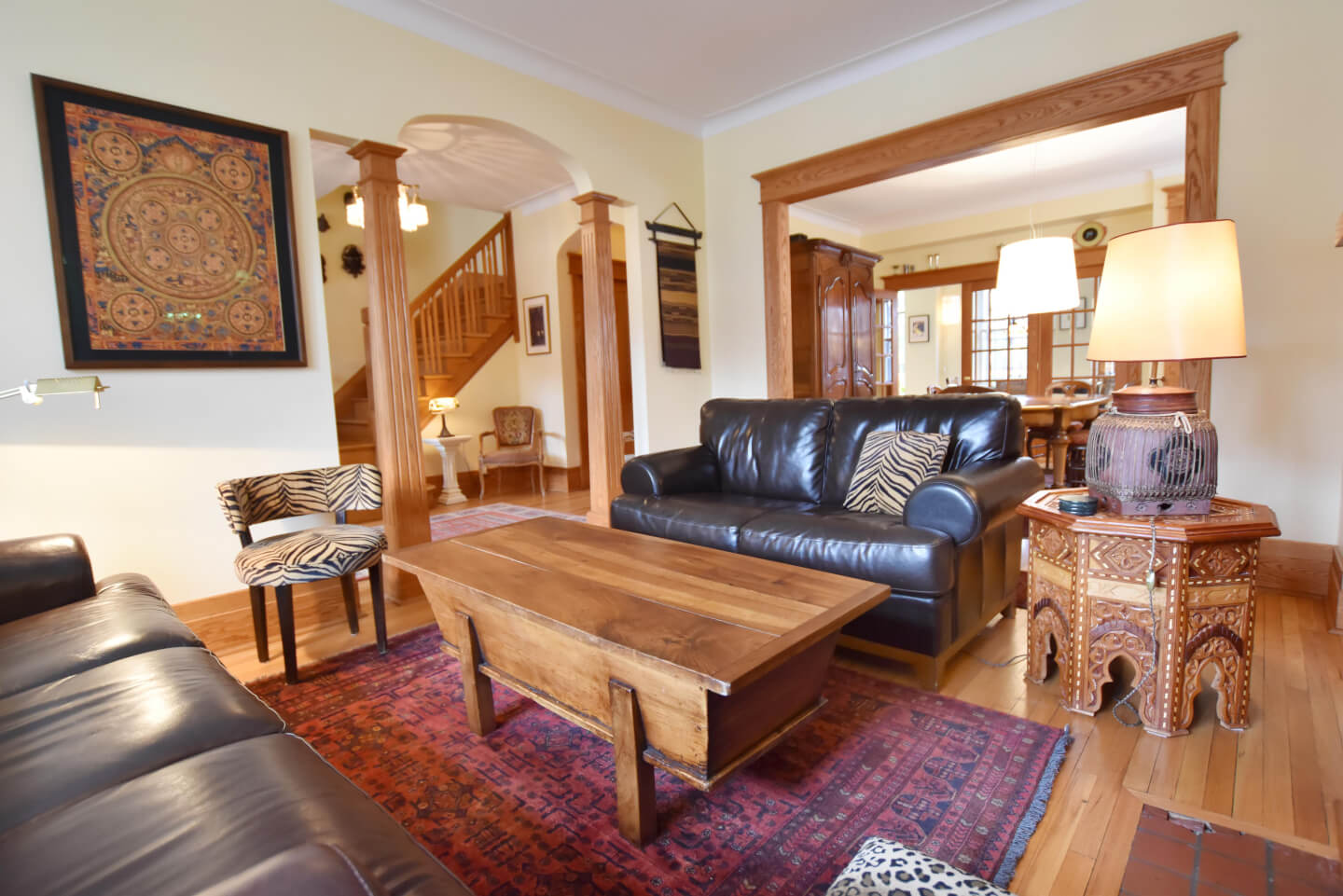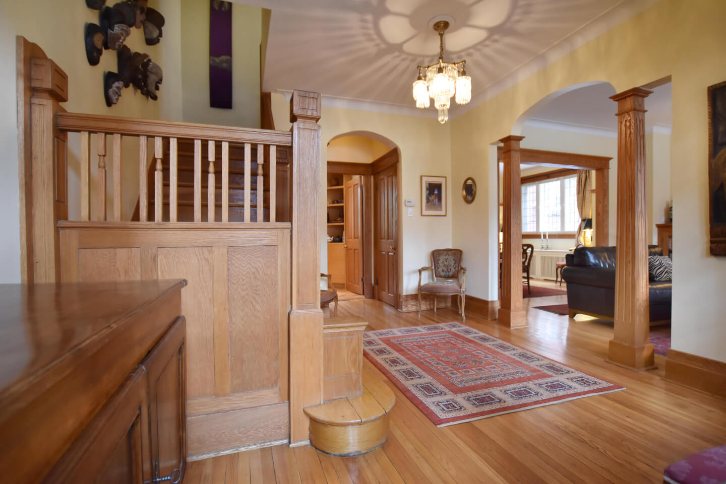 Élégant Salon avec de belles colonnes architecturales, 2 meubles encastrés avec verre plombé de chaque côté de la cheminée. Celui-ci ouvert sur la salle à manger(Foyer non fonctionnel selon la règlementation de la Ville de Montréal)