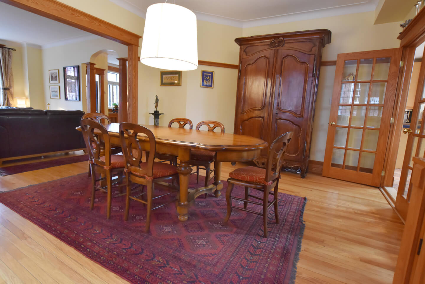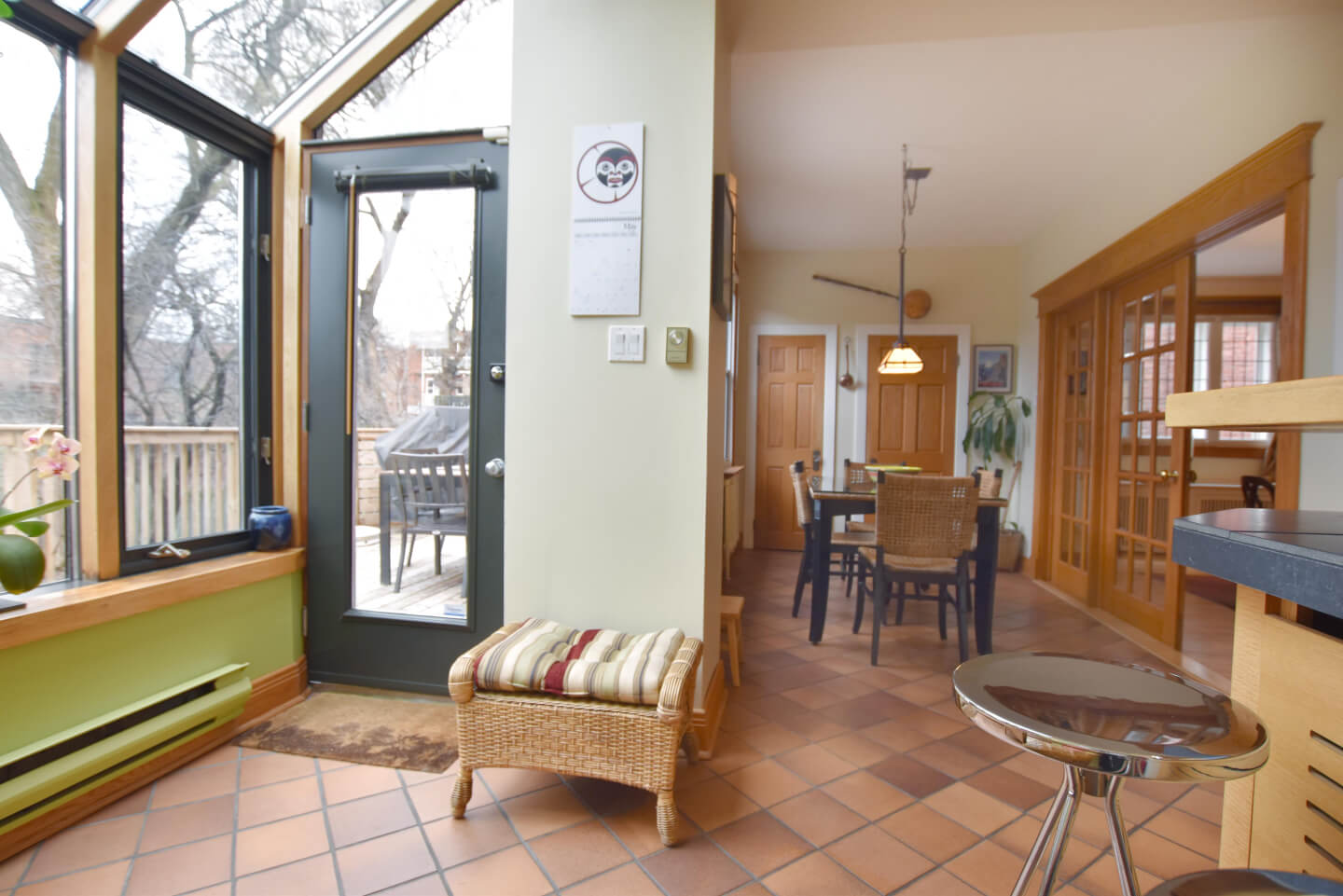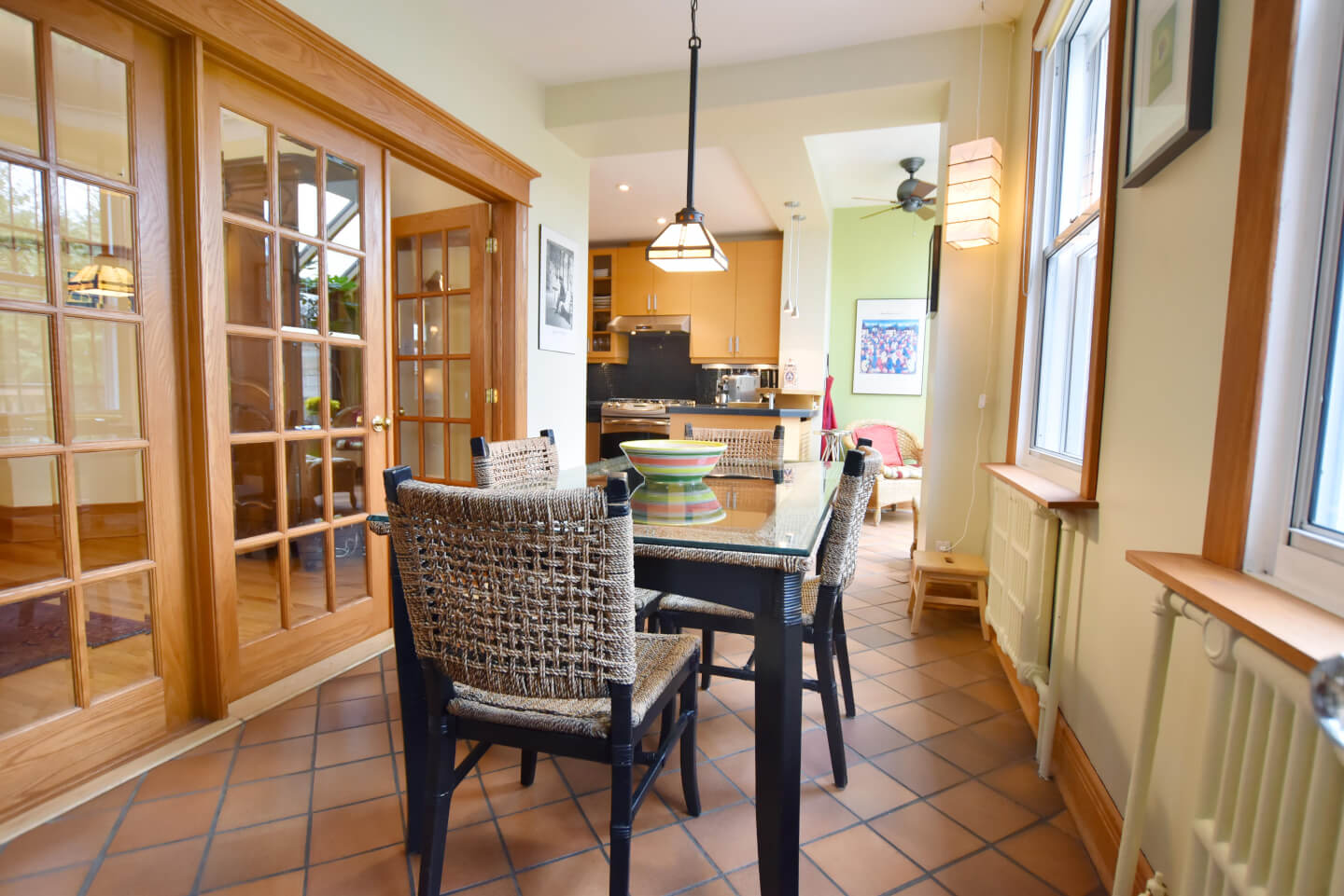 Trois portes françaises au verre biseauté s’ouvrent sur la dinette avec vue sur la terrasse