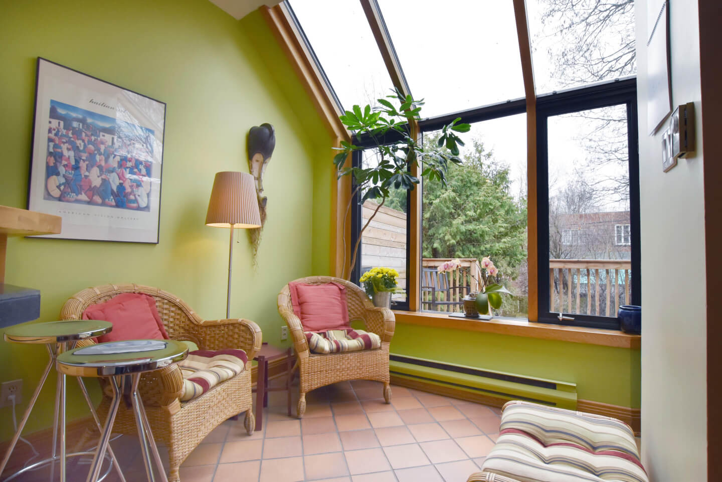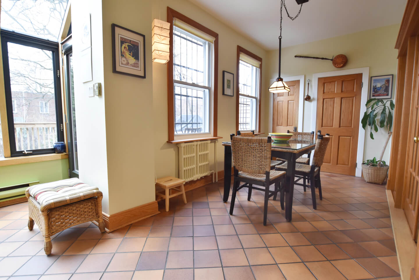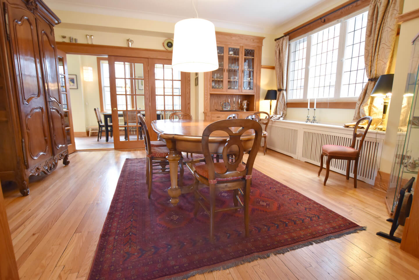 Trois portes françaises au verre biseauté s’ouvrent sur la dinette avec vue sur la terrasse