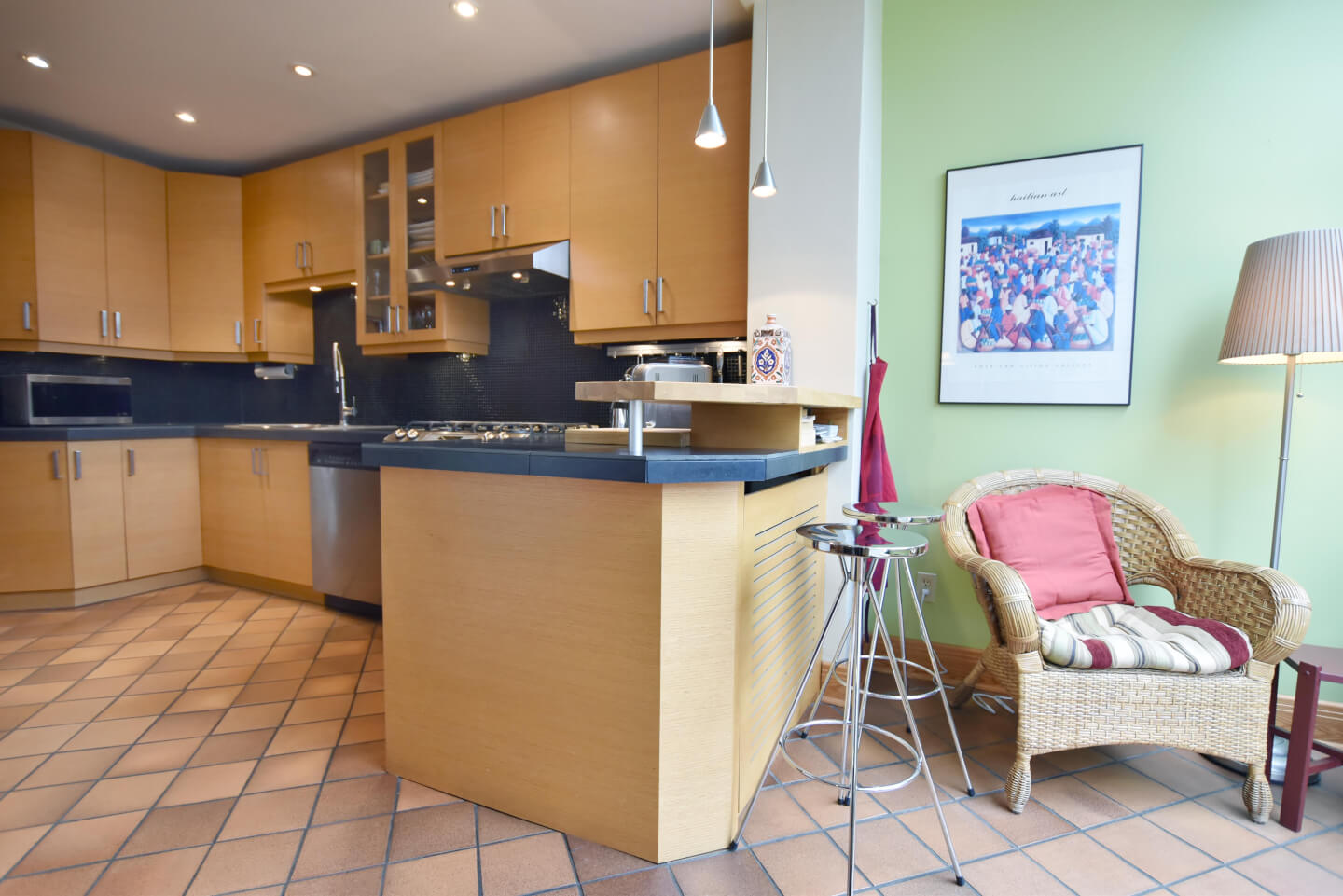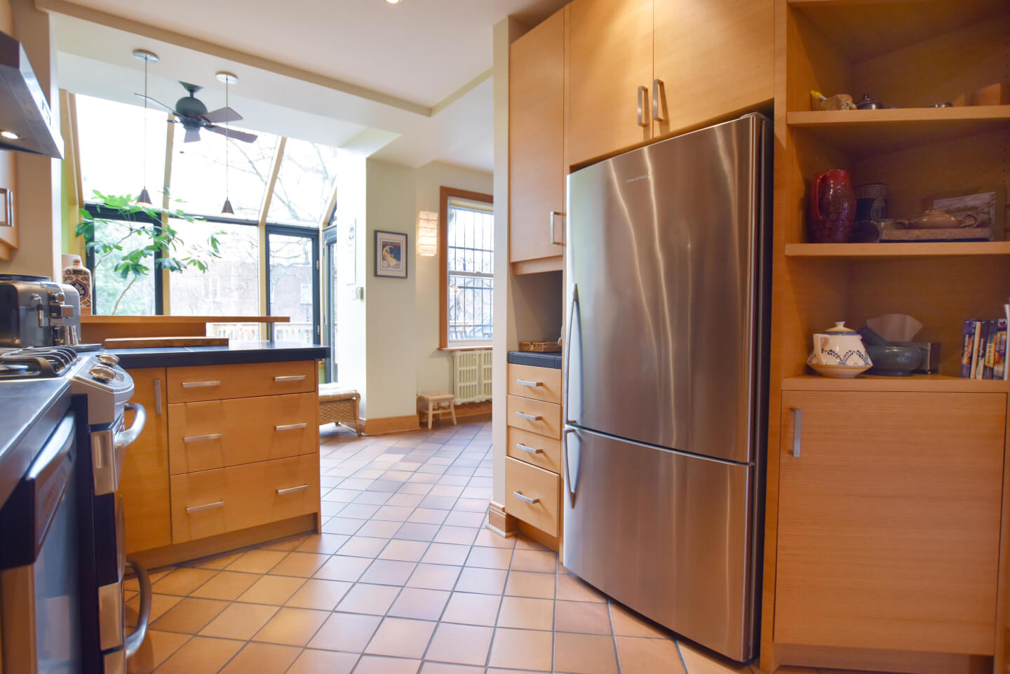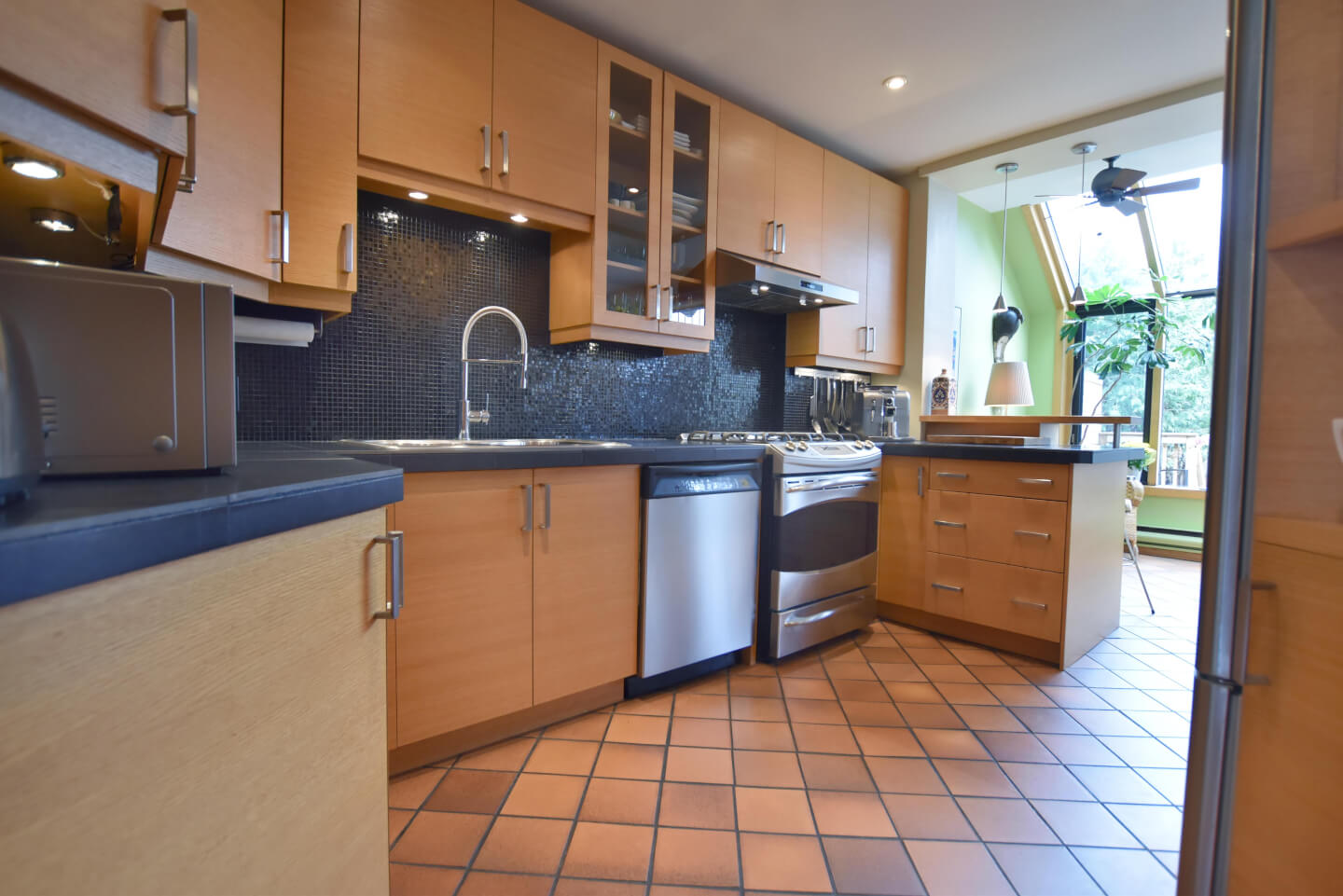 Super lumineuse cuisine rénovée +/- 2006 - mariage harmonieux au style de la maison - coin/comptoir déjeuner, armoires de chêne, comptoir de porcelaine et plancher de céramique