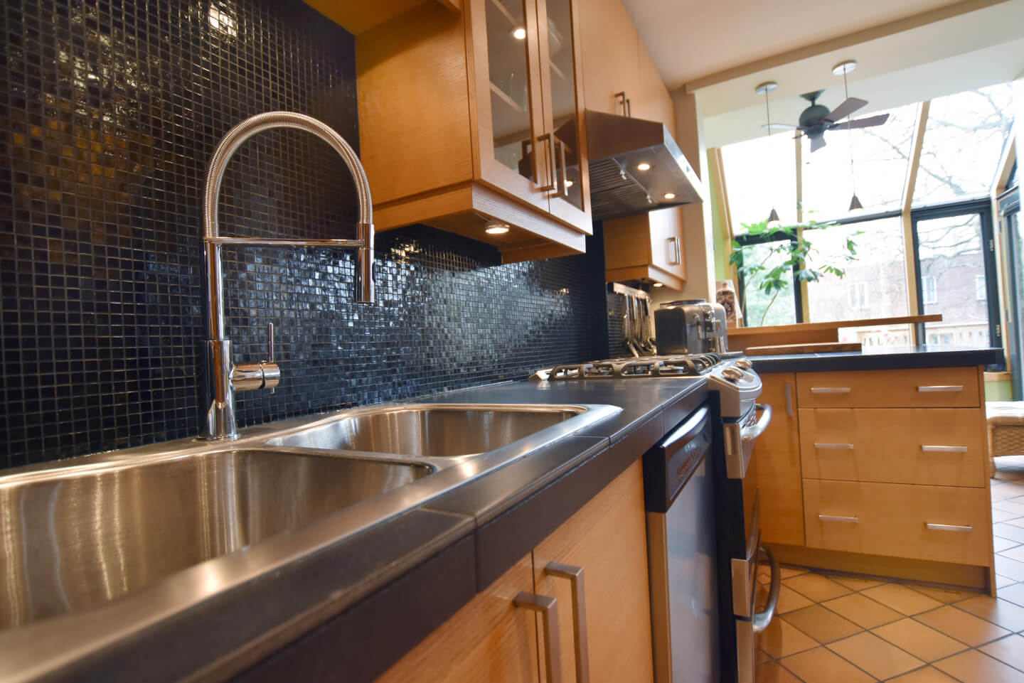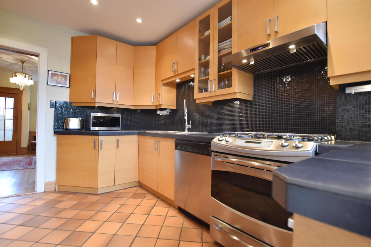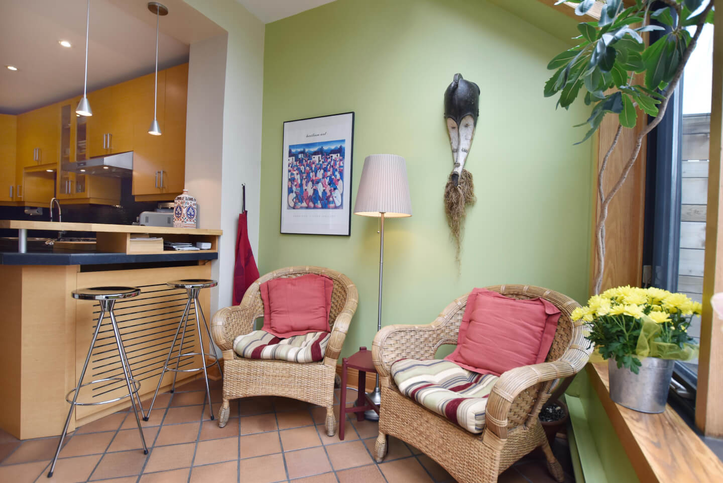 Super lumineuse cuisine rénovée +/- 2006 - mariage harmonieux au style de la maison - coin/comptoir déjeuner, armoires de chêne, comptoir de porcelaine et plancher de céramique