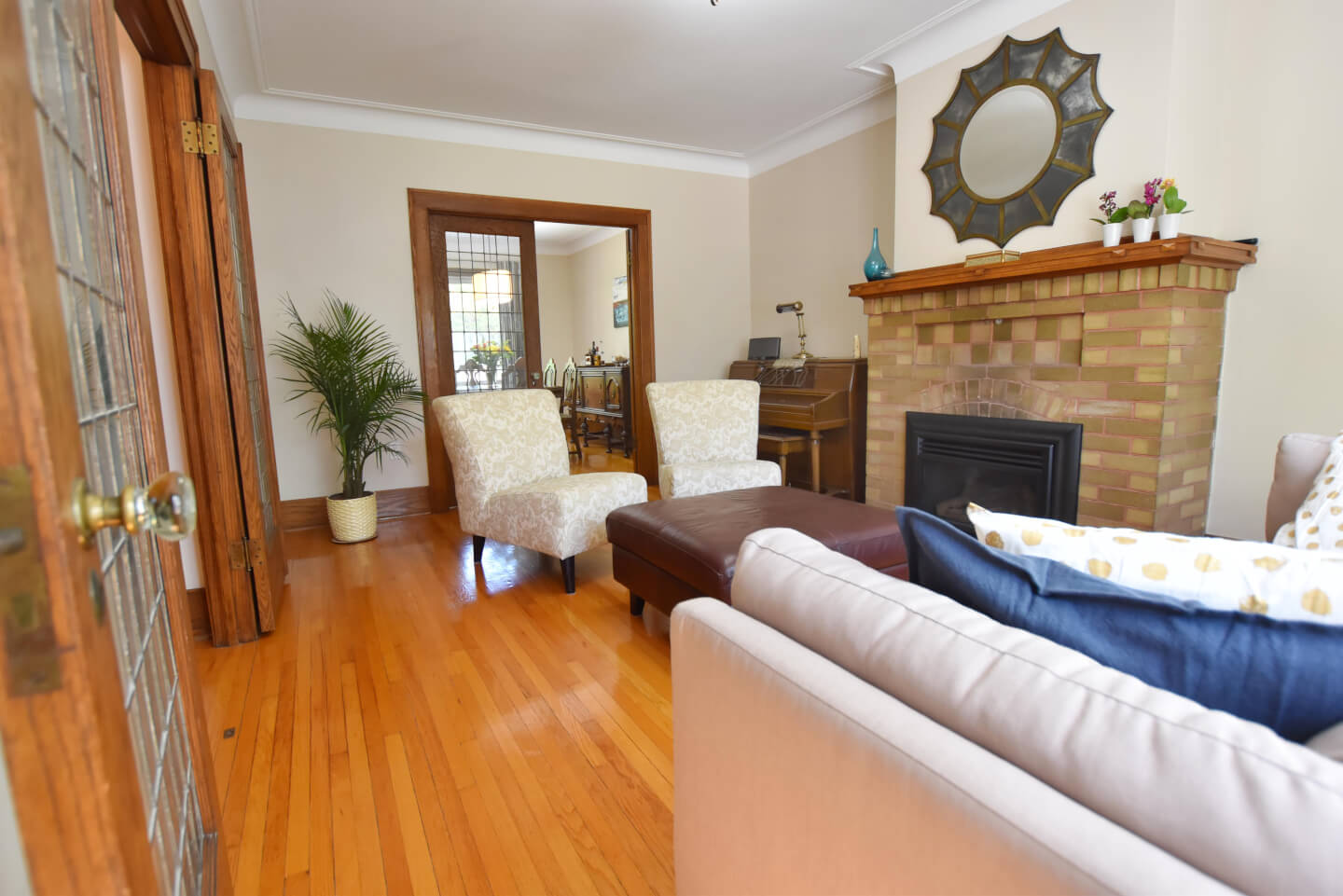Salon avec foyer au gaz et ouvert sur la salle à manger