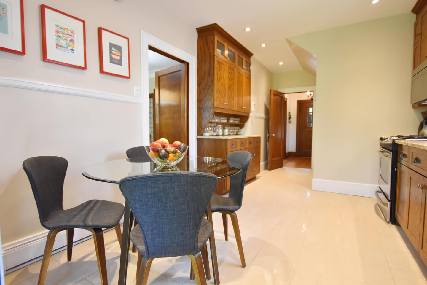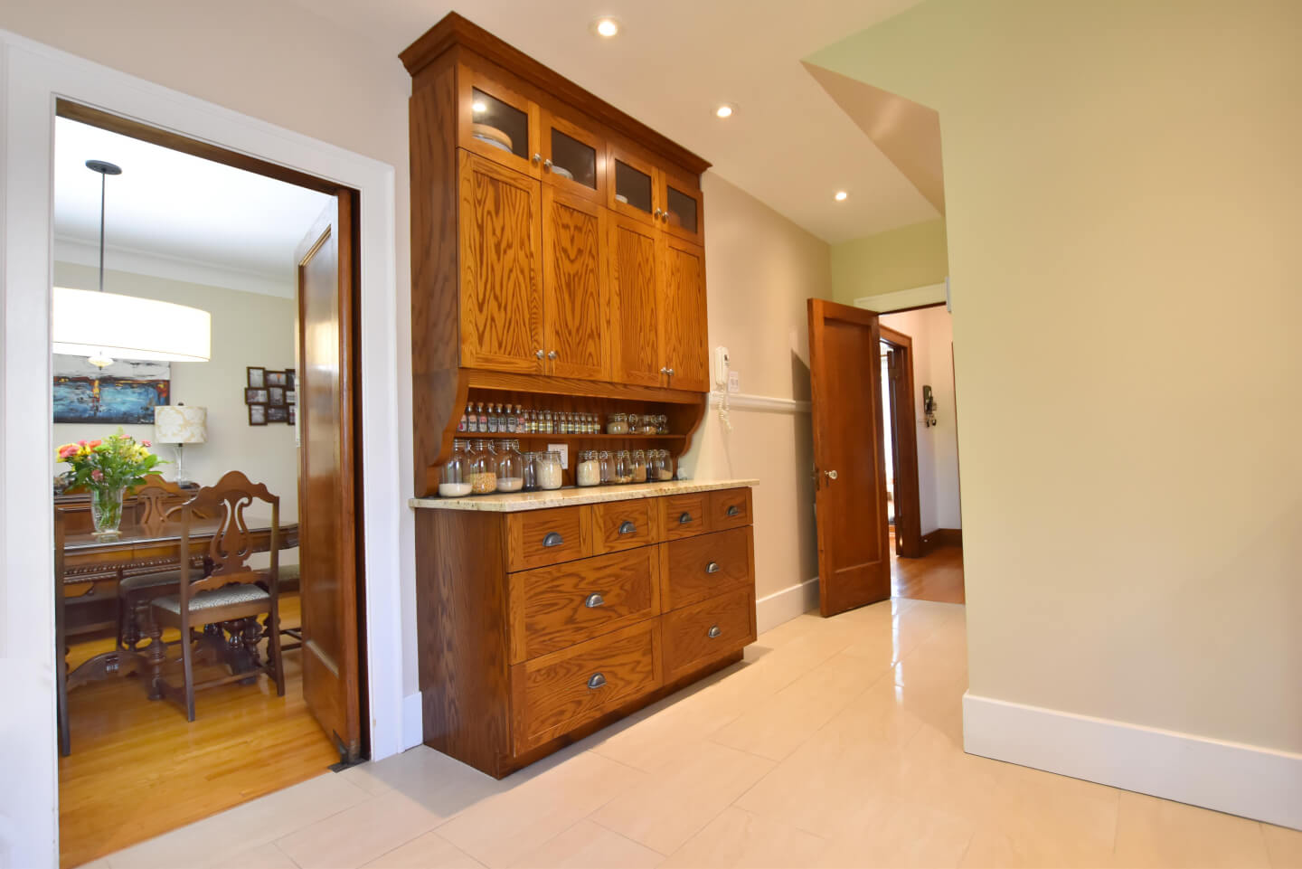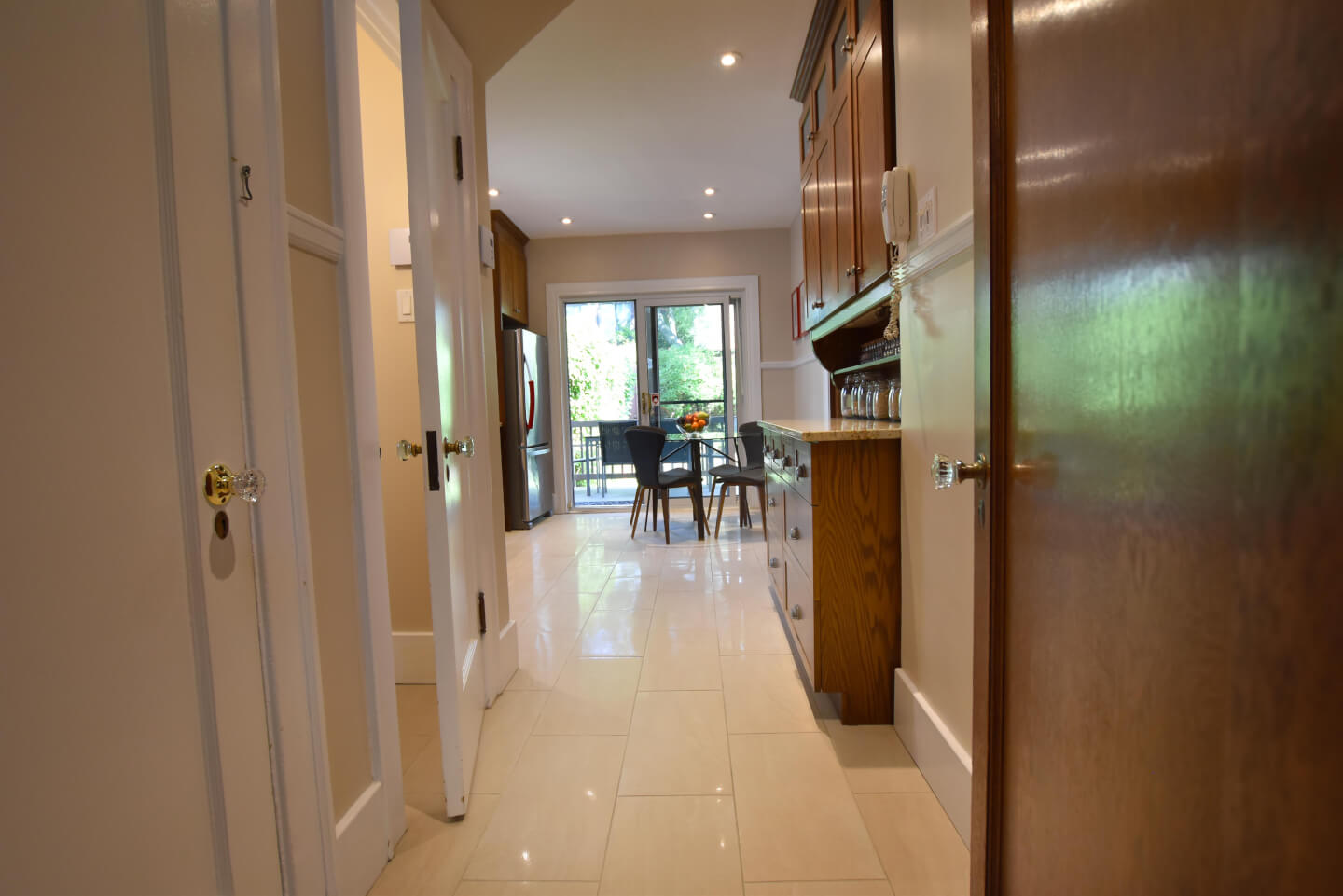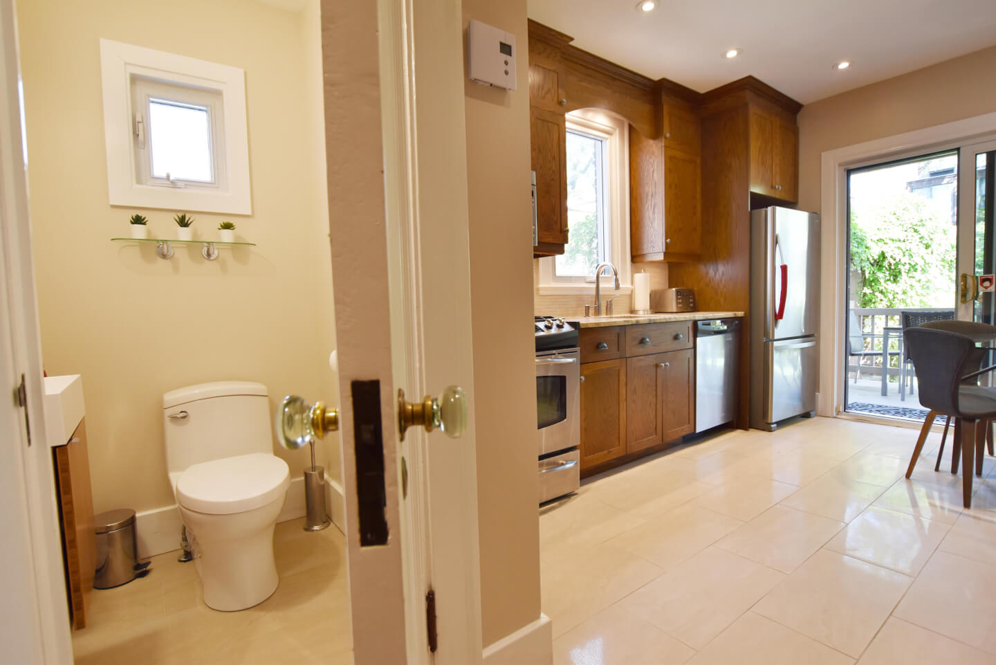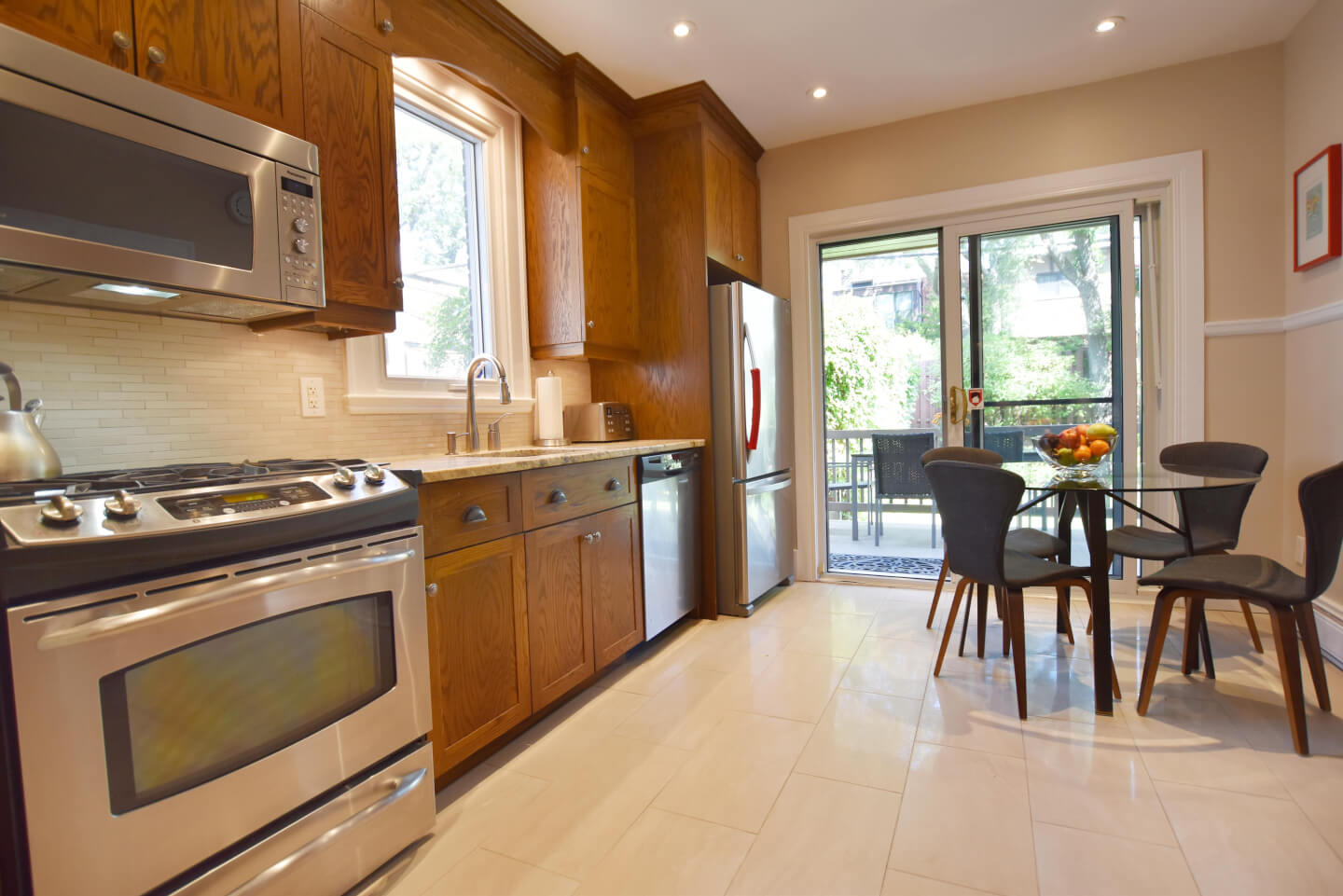 Élégante cuisine 2008, armoire Shaker en chêne, coin repas, comptoir de granite, plancher de céramique 2013 & portes patio menant à la terrasse, patio, jardin et garage