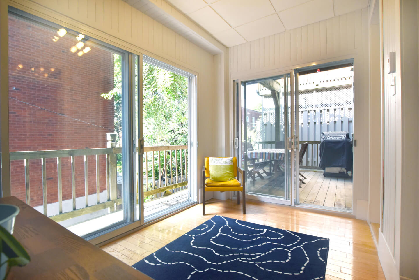 Solarium 4 saisons menant à la terrasse, 2 portes patio