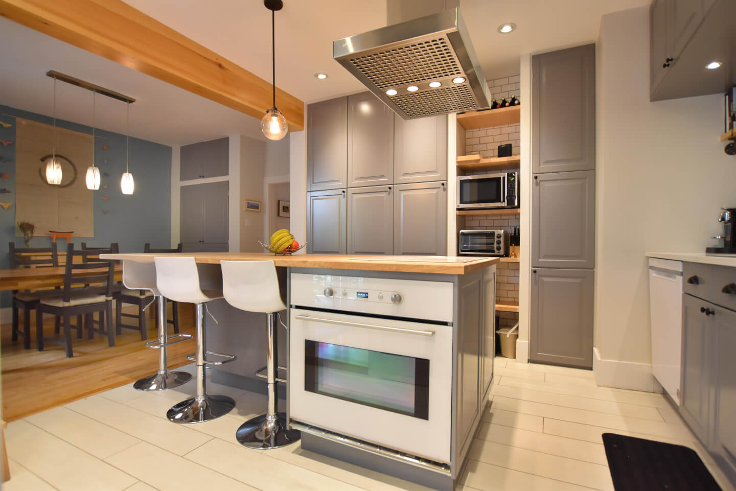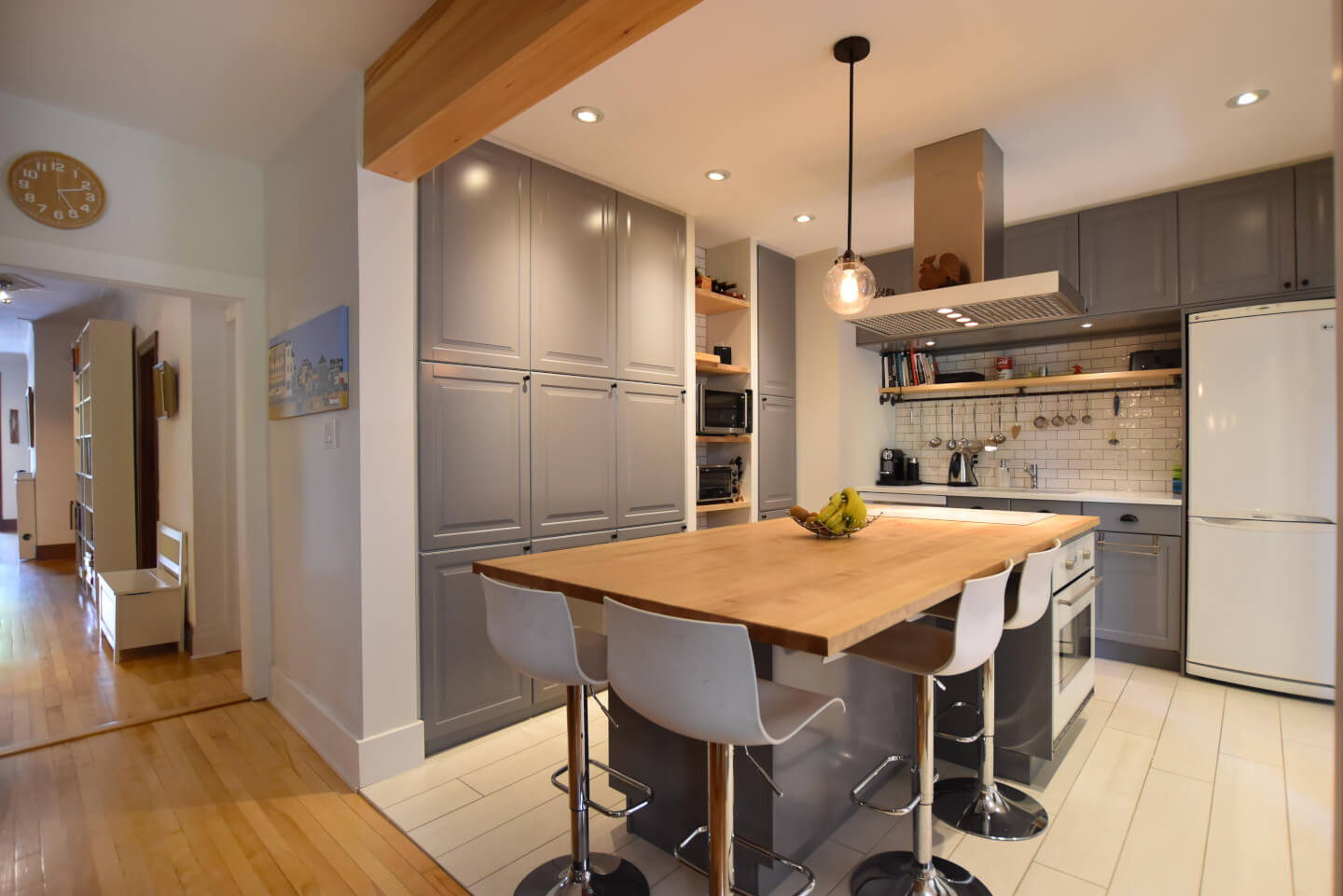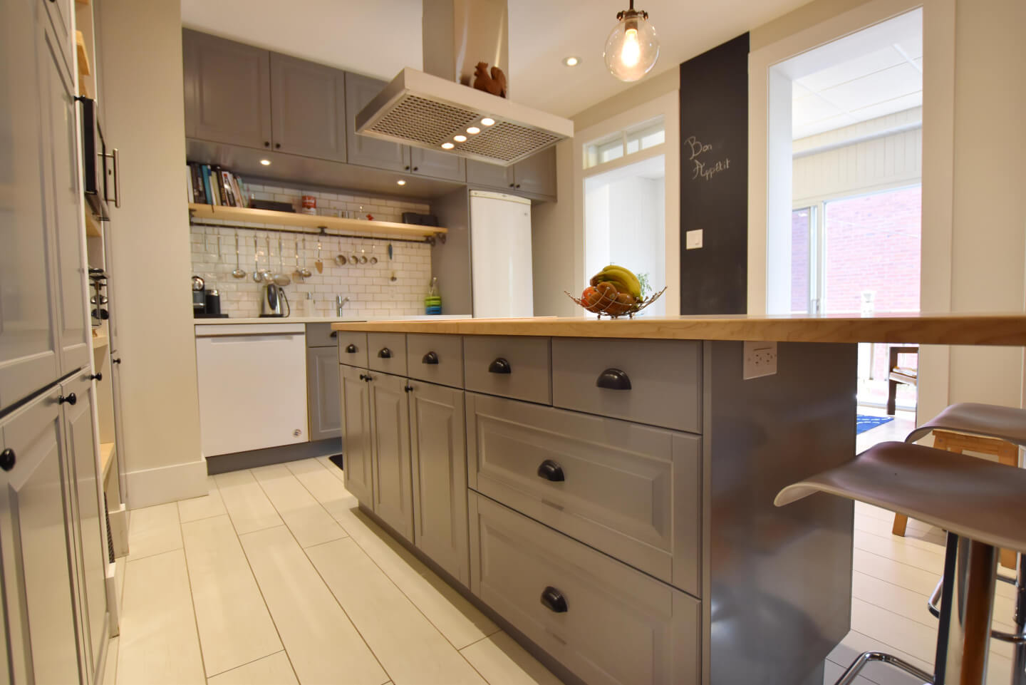 Superbe cuisine, grand îlot central, comptoir déjeuner en bois et les autres en quartz, plancher de céramique