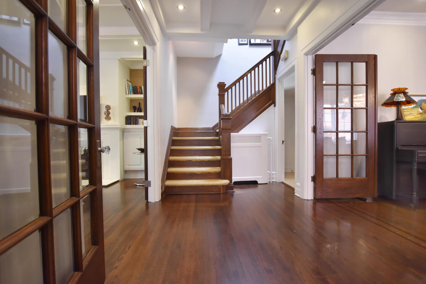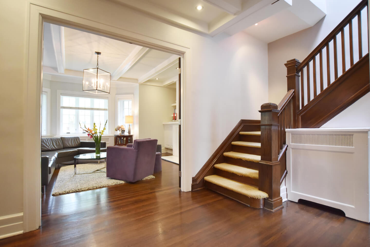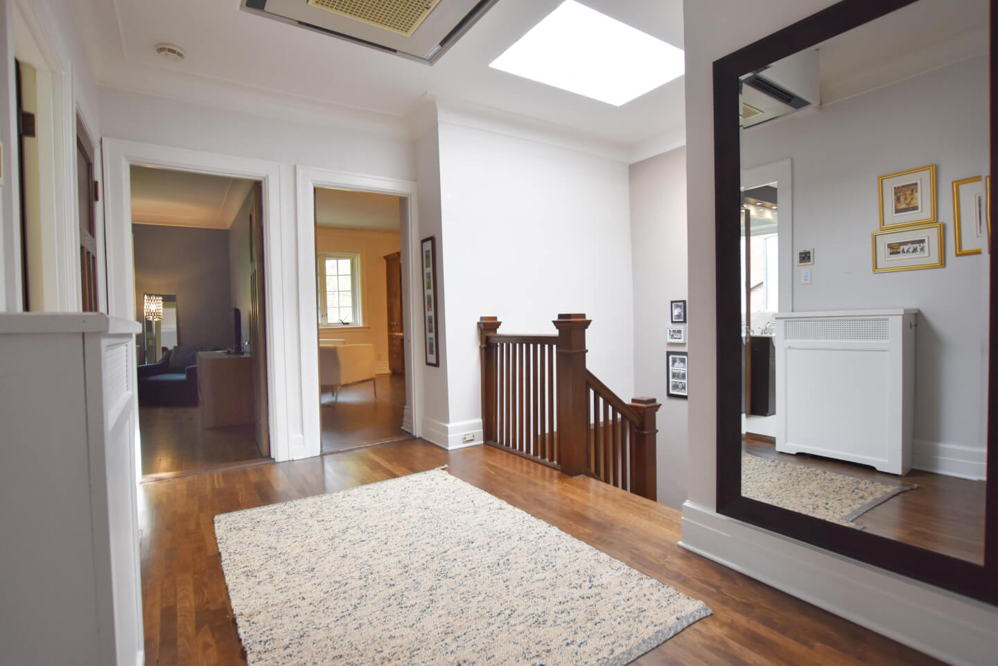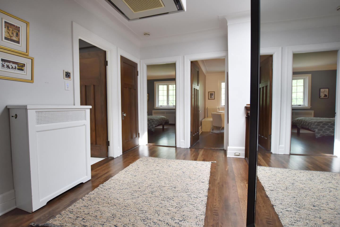 Élégant hall d’entrée à plan croisé, poutres au plafond