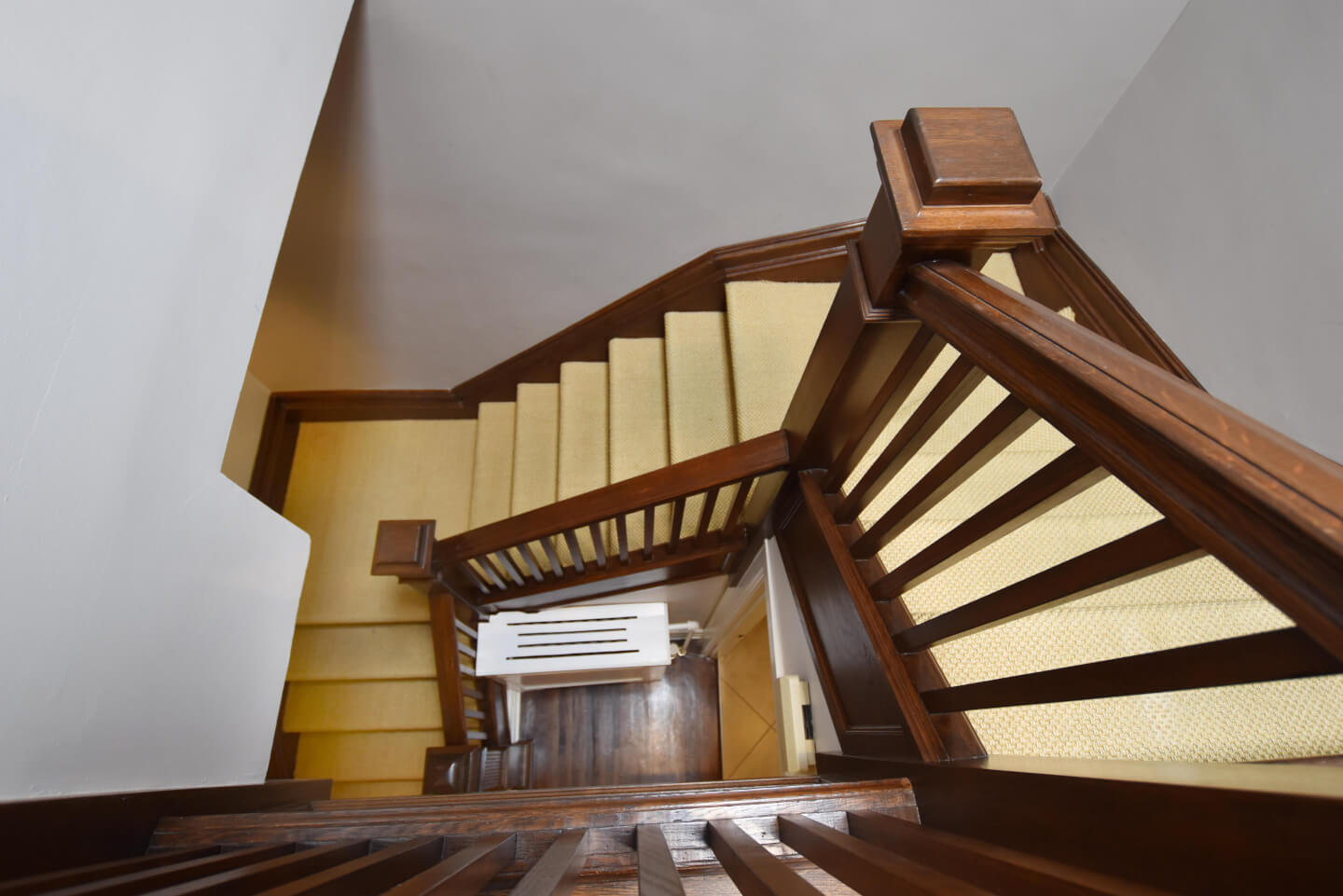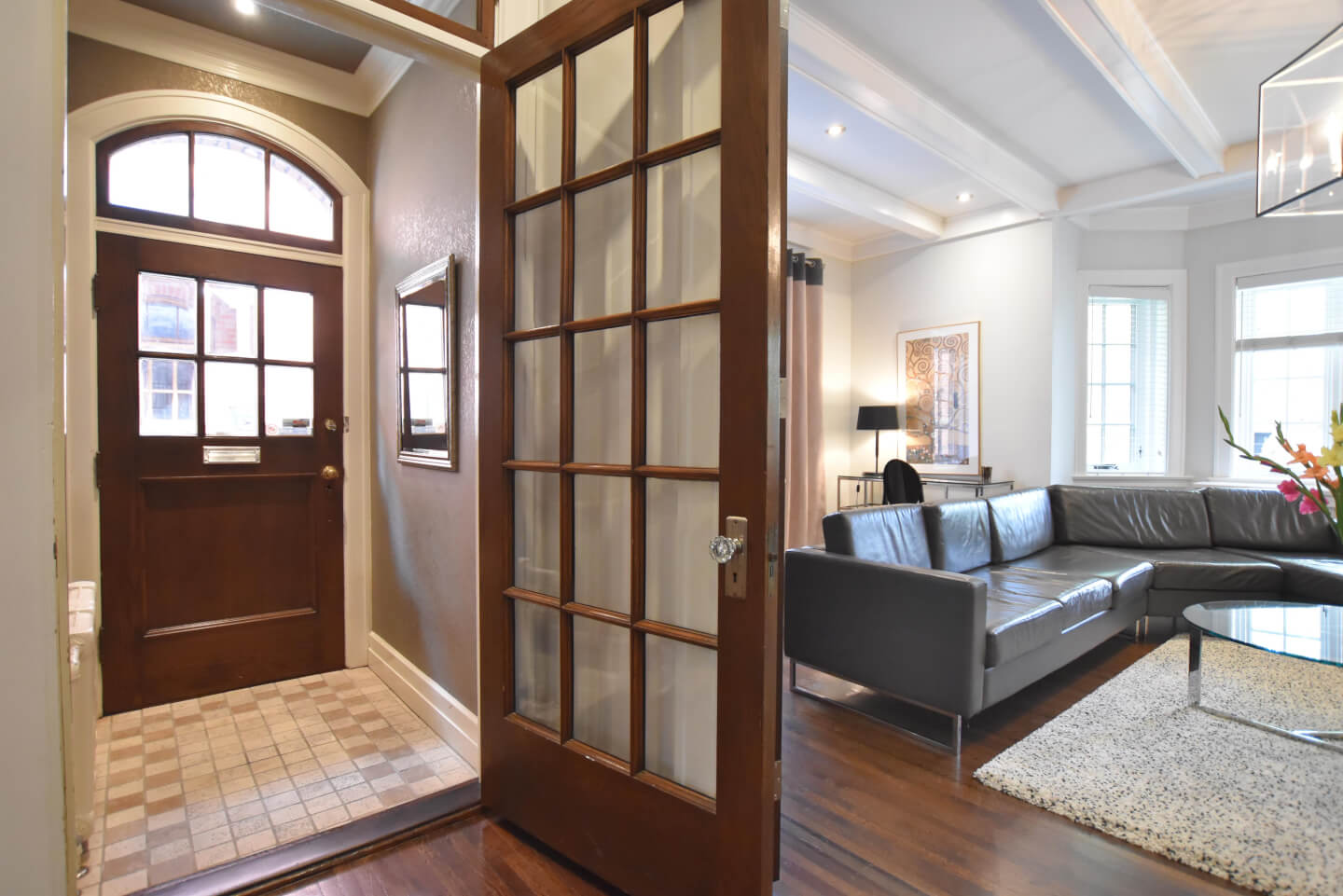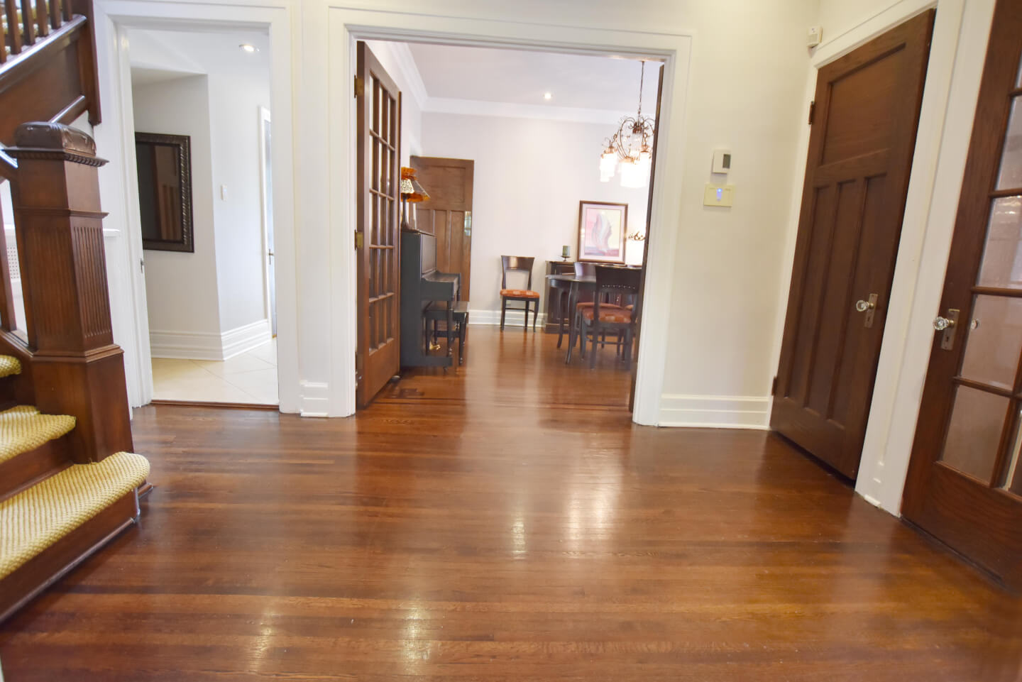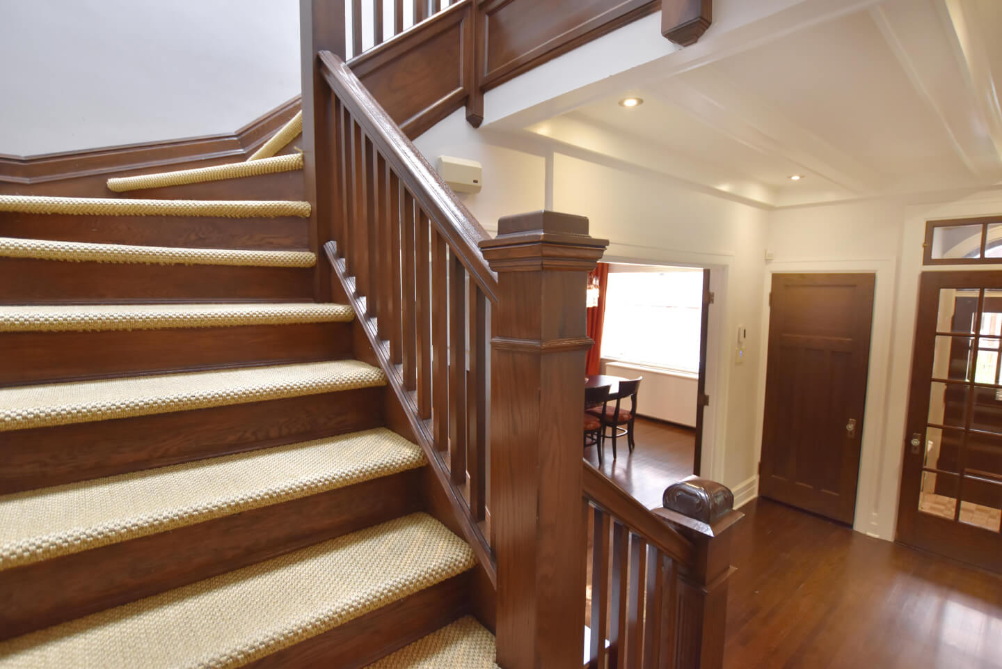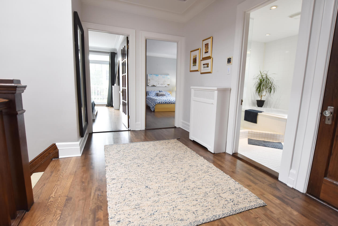 Élégant hall d’entrée à plan croisé, poutres au plafond