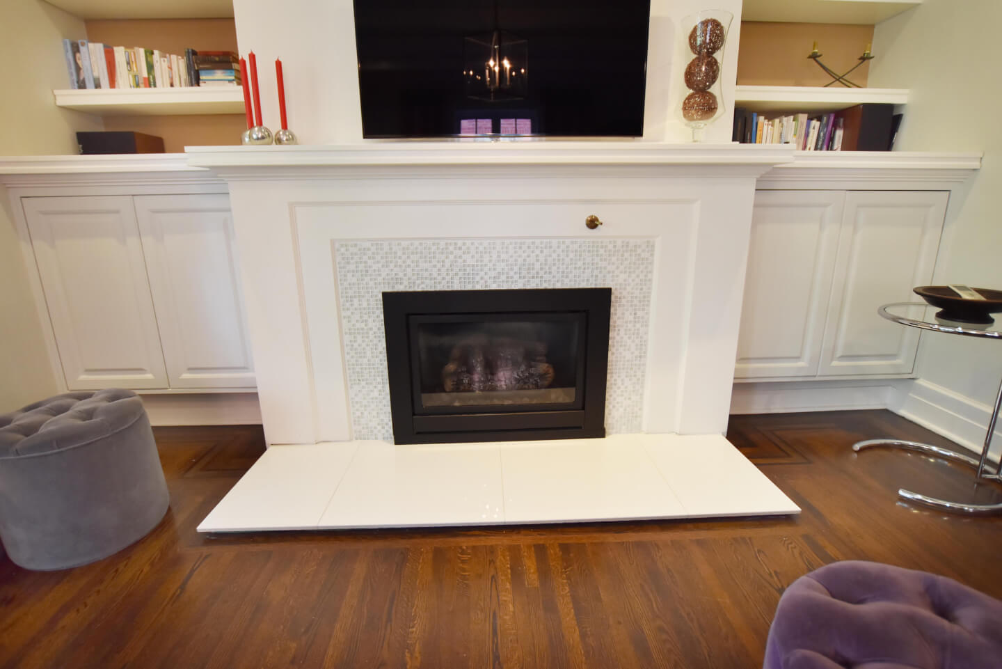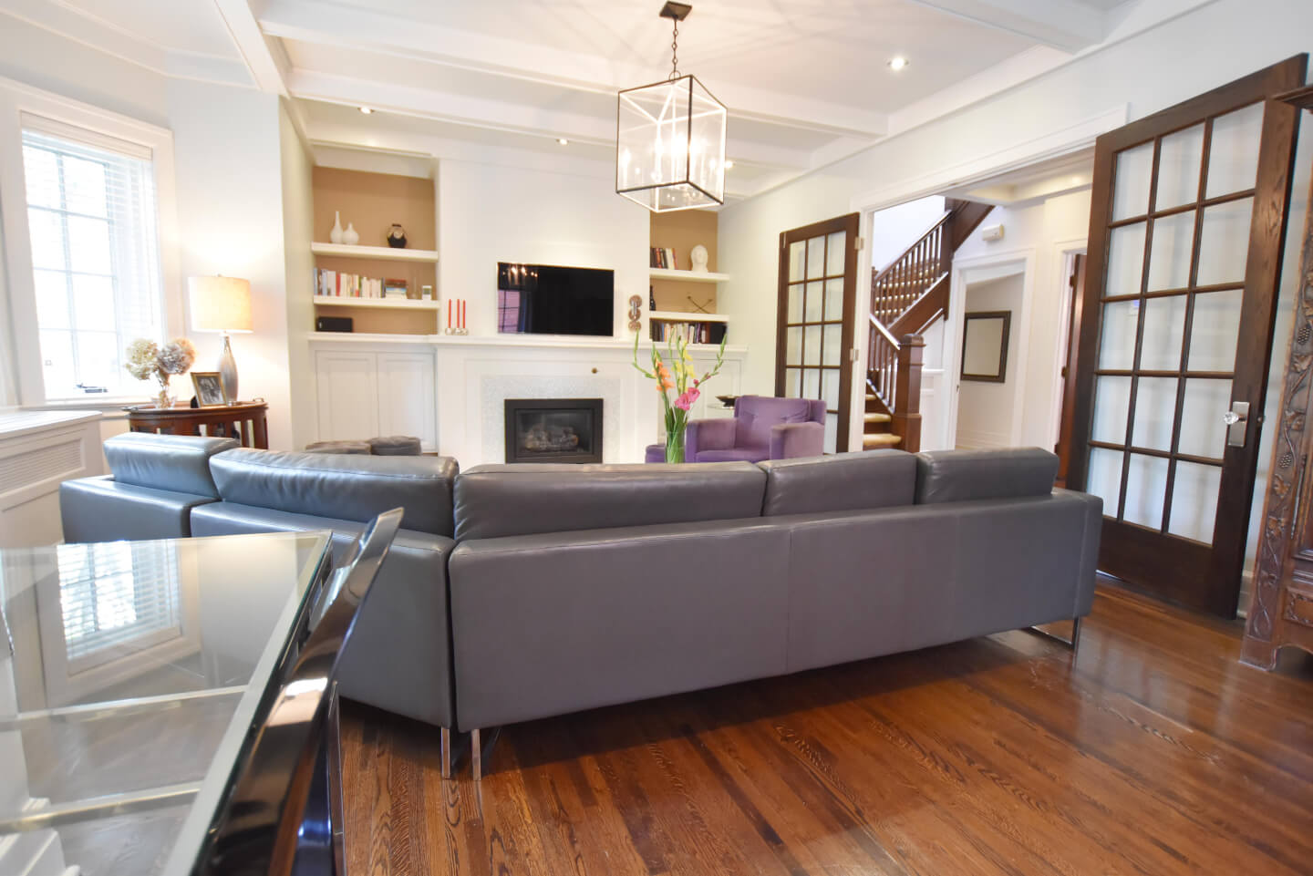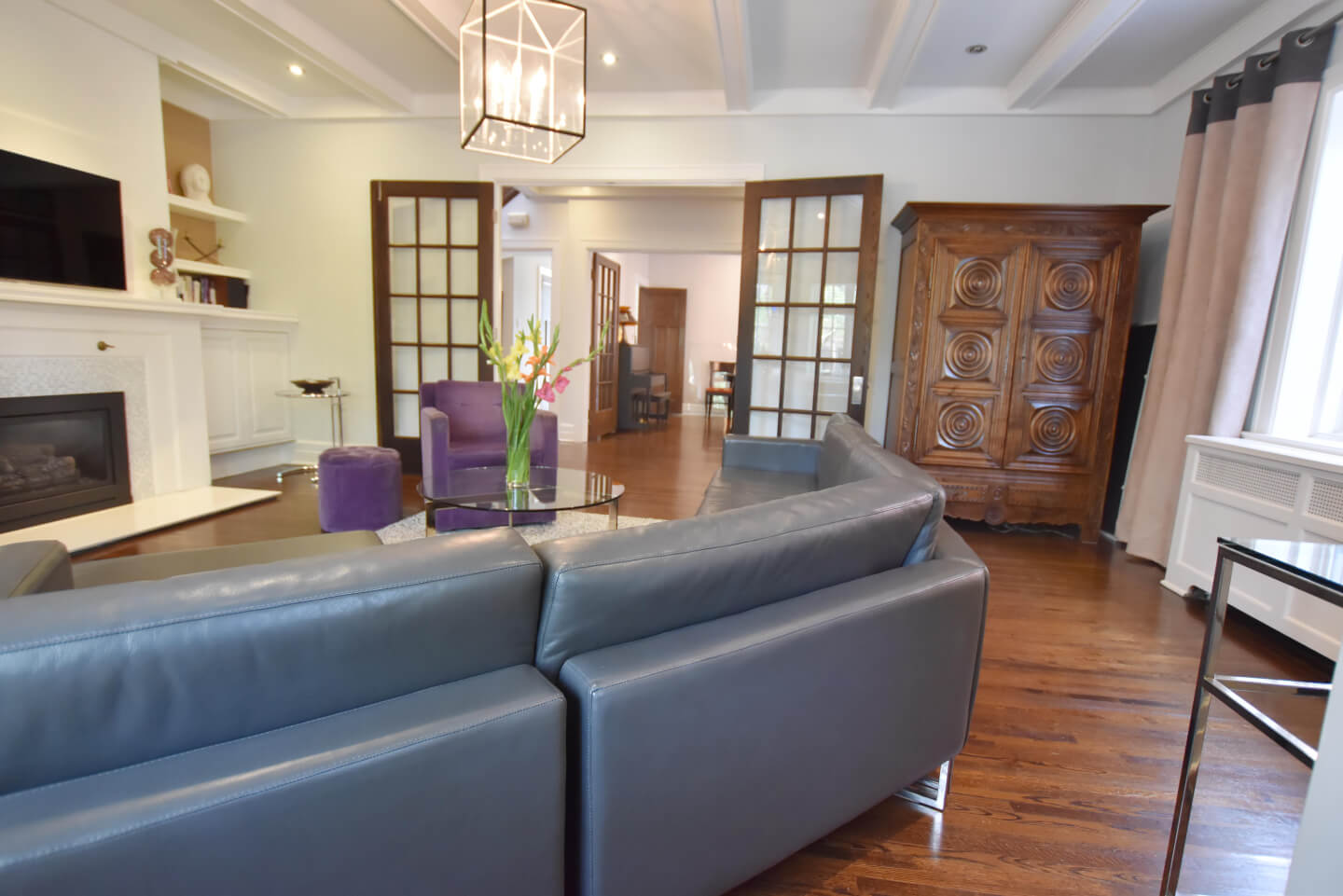 Très grand salon avec poutres, fenestration en baie, foyer au gaz, encastrés