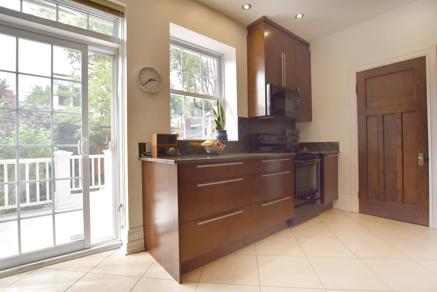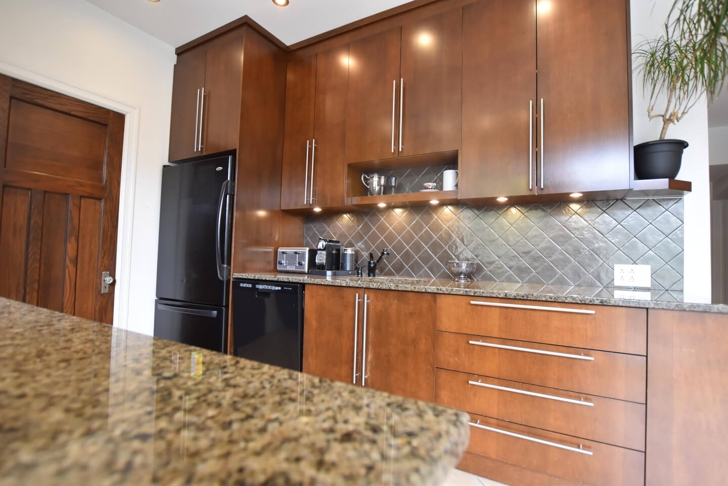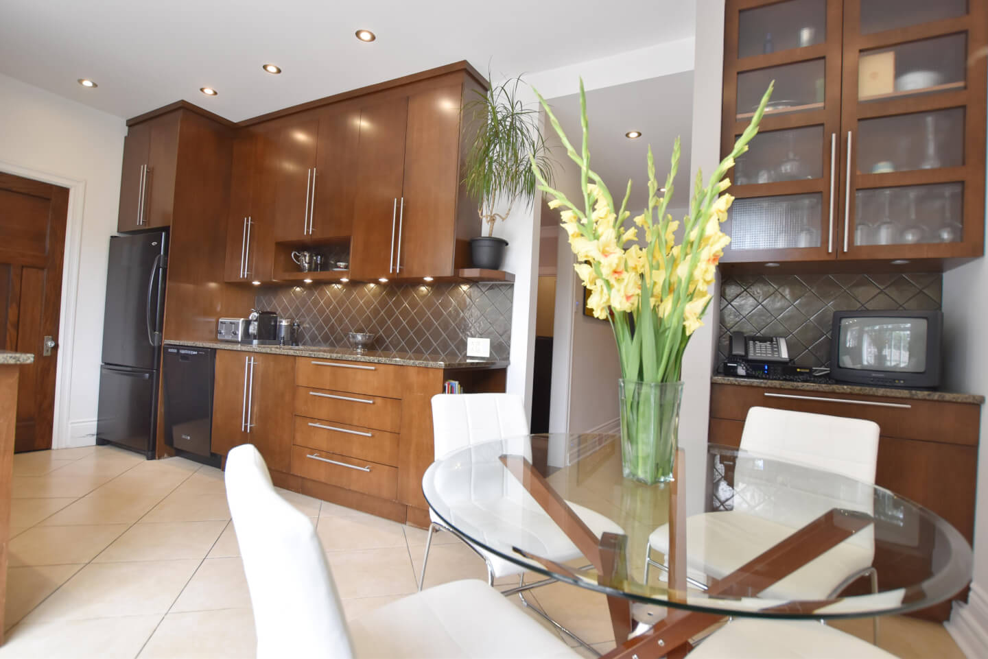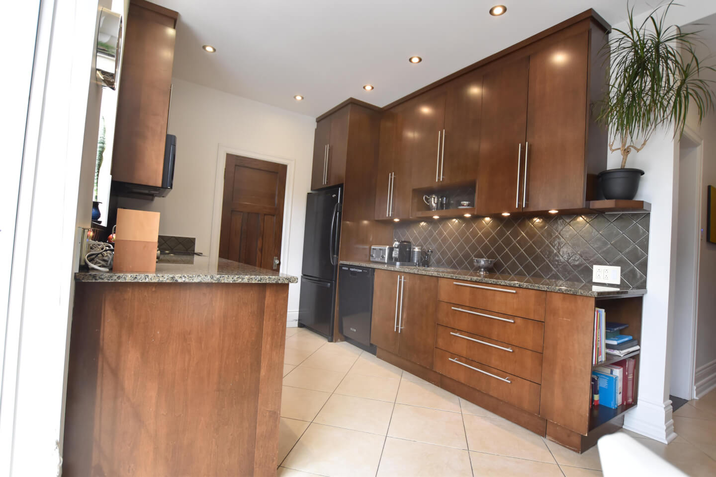 Superbe cuisine design, coin repas, comptoir de granit, armoire en érable teinte chocolat, garde-manger à l'européenne