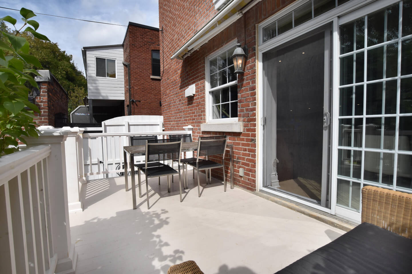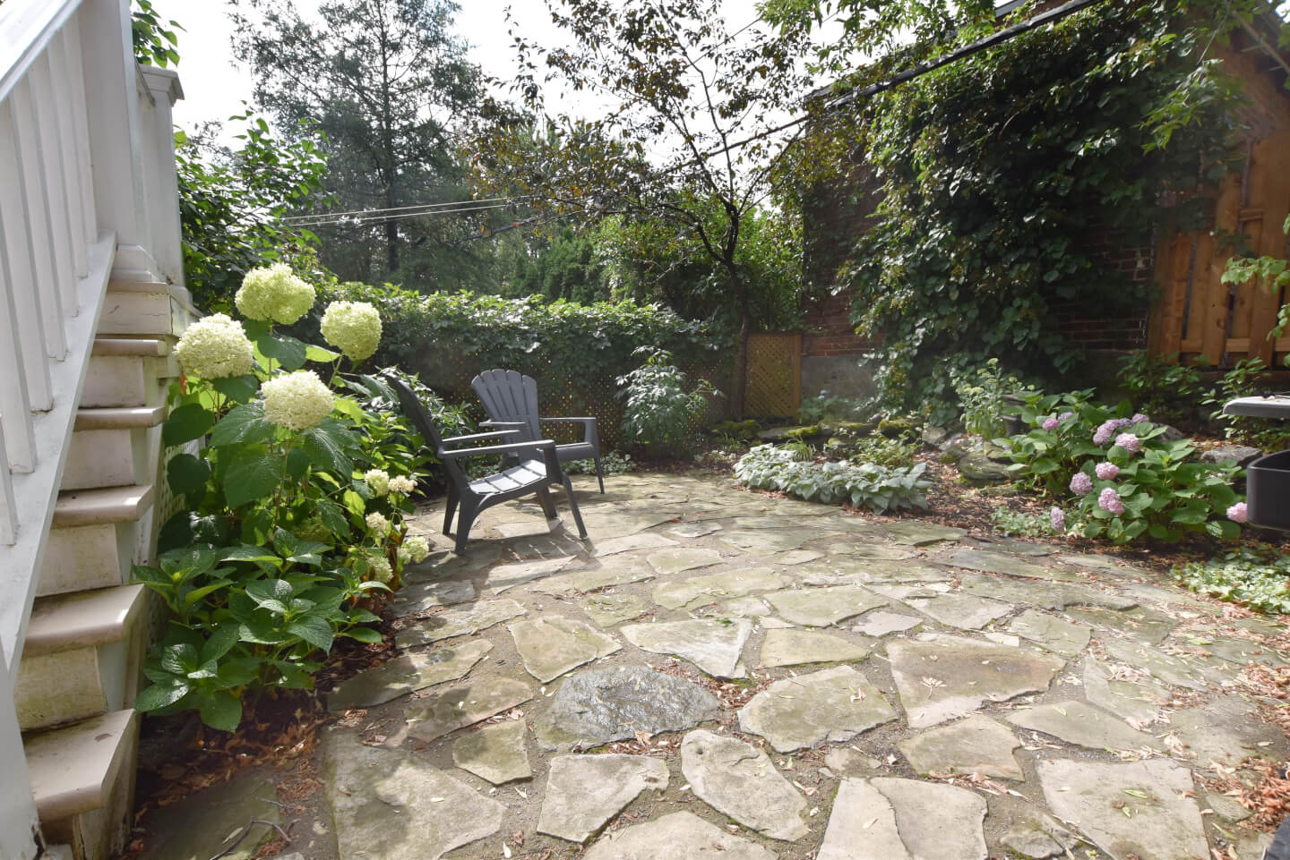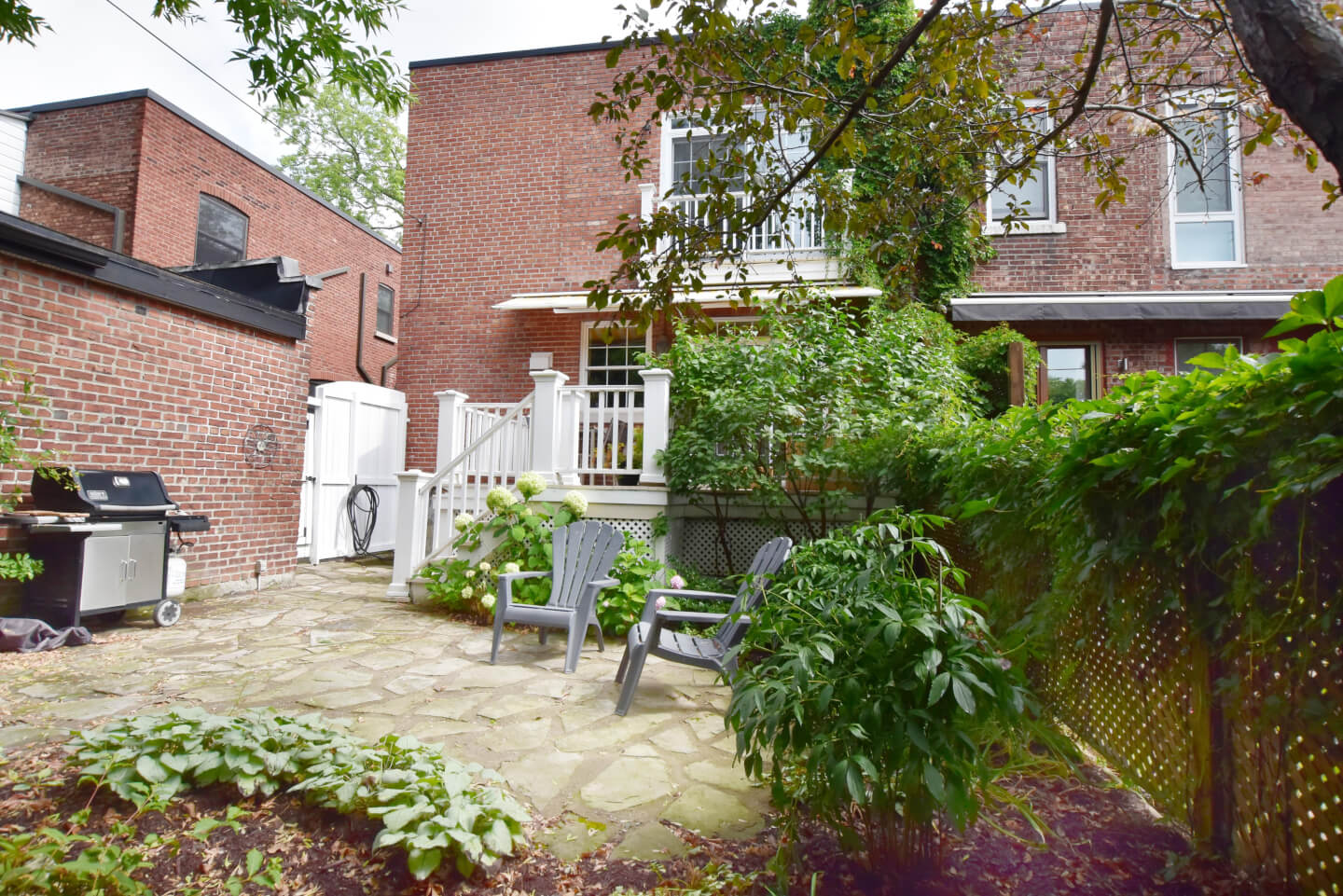 Porte-patio vers grande terrasse abritée d'un auvent et coquet jardin très privé