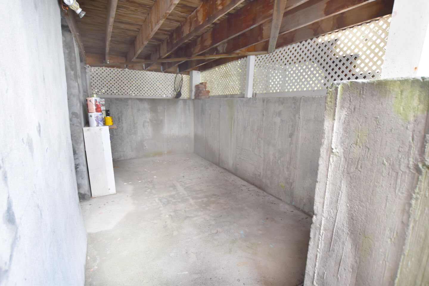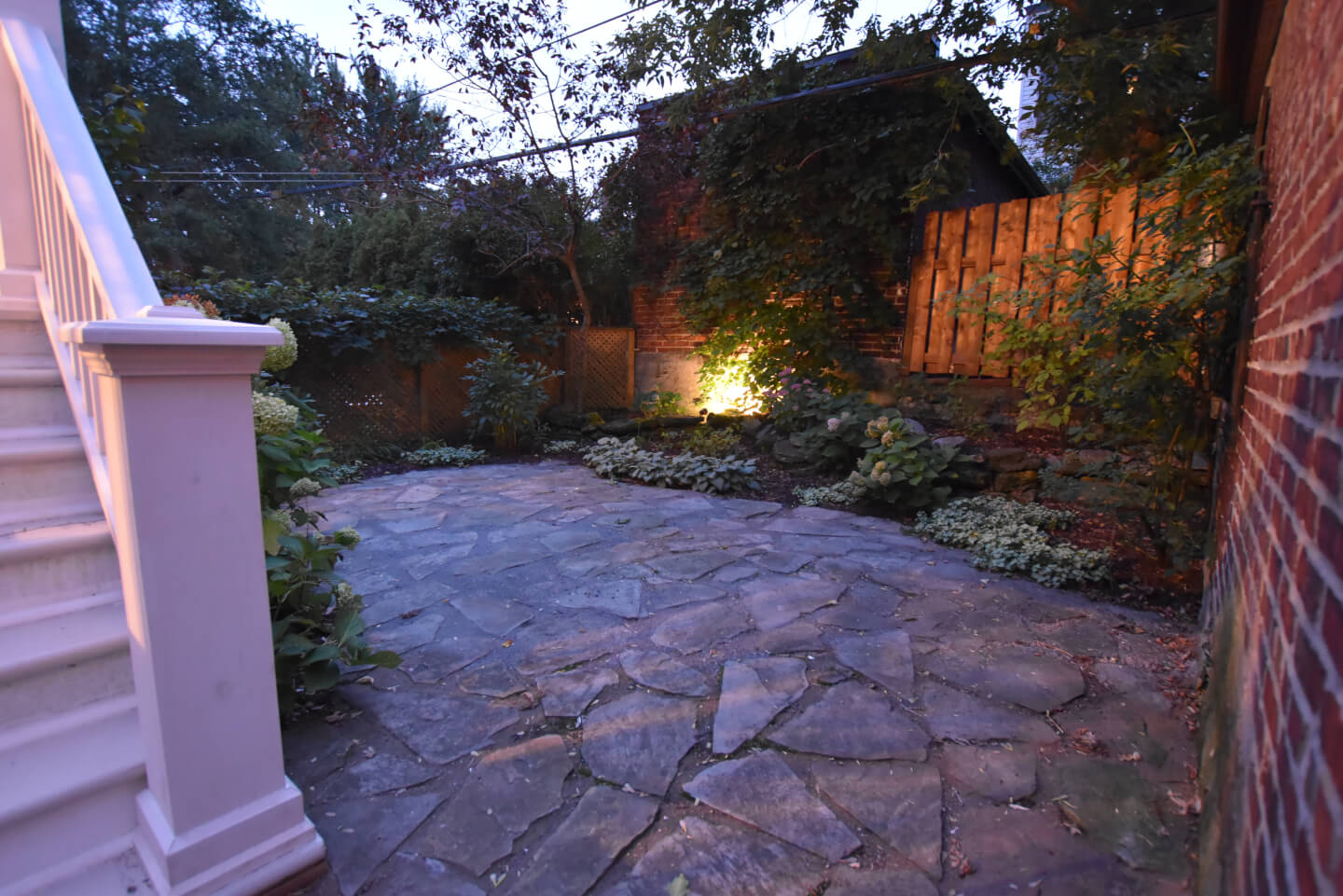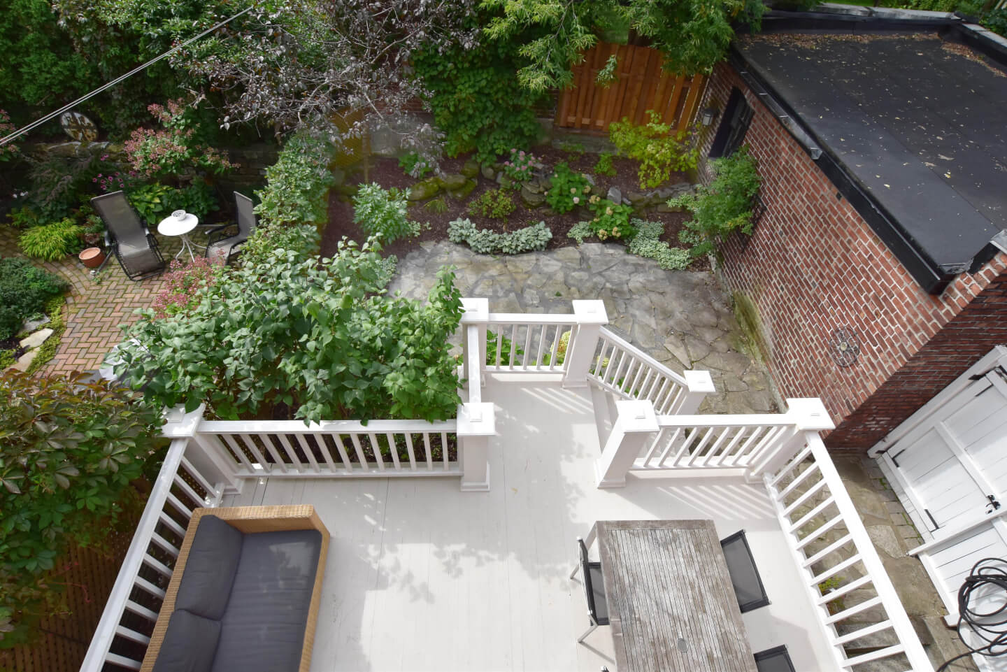Porte-patio vers grande terrasse abritée d'un auvent et coquet jardin très privé
