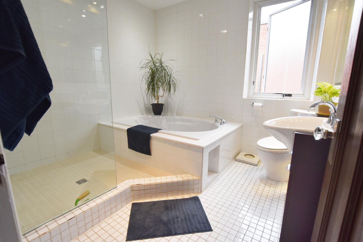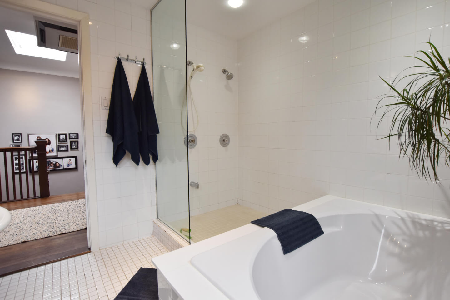 Salle de bain principale avec bain et grande douche vitrée sur céramique blanche