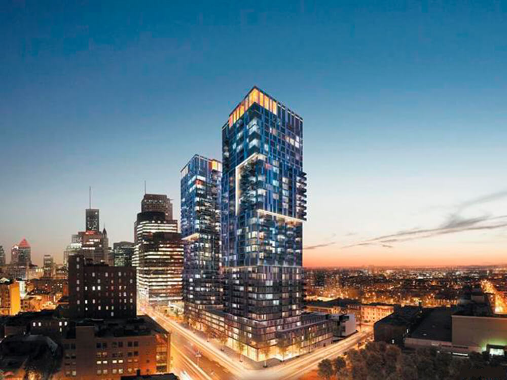CONDOMINIUMS YUL au 28ième étage! Succombez à cette vue spectaculaire de la ville sur plus de 48 pieds fenestrés. Ce luxueux condo de coin à aire ouverte surplombe le Mille Carré Doré, et jouit d’une luminosité maximale en profitant d’une orientation à l’Ouest et au Nord. Finitions hors pair, balcon et loggia, 2 chambres, chacune avec son ensuite, et une salle d’eau, 1 garage (soit le numéro: 69 ou 70) avec possibilité d'une borne électrique. Théâtres, festivals, restaurants, musées et boutiques à deux pas!