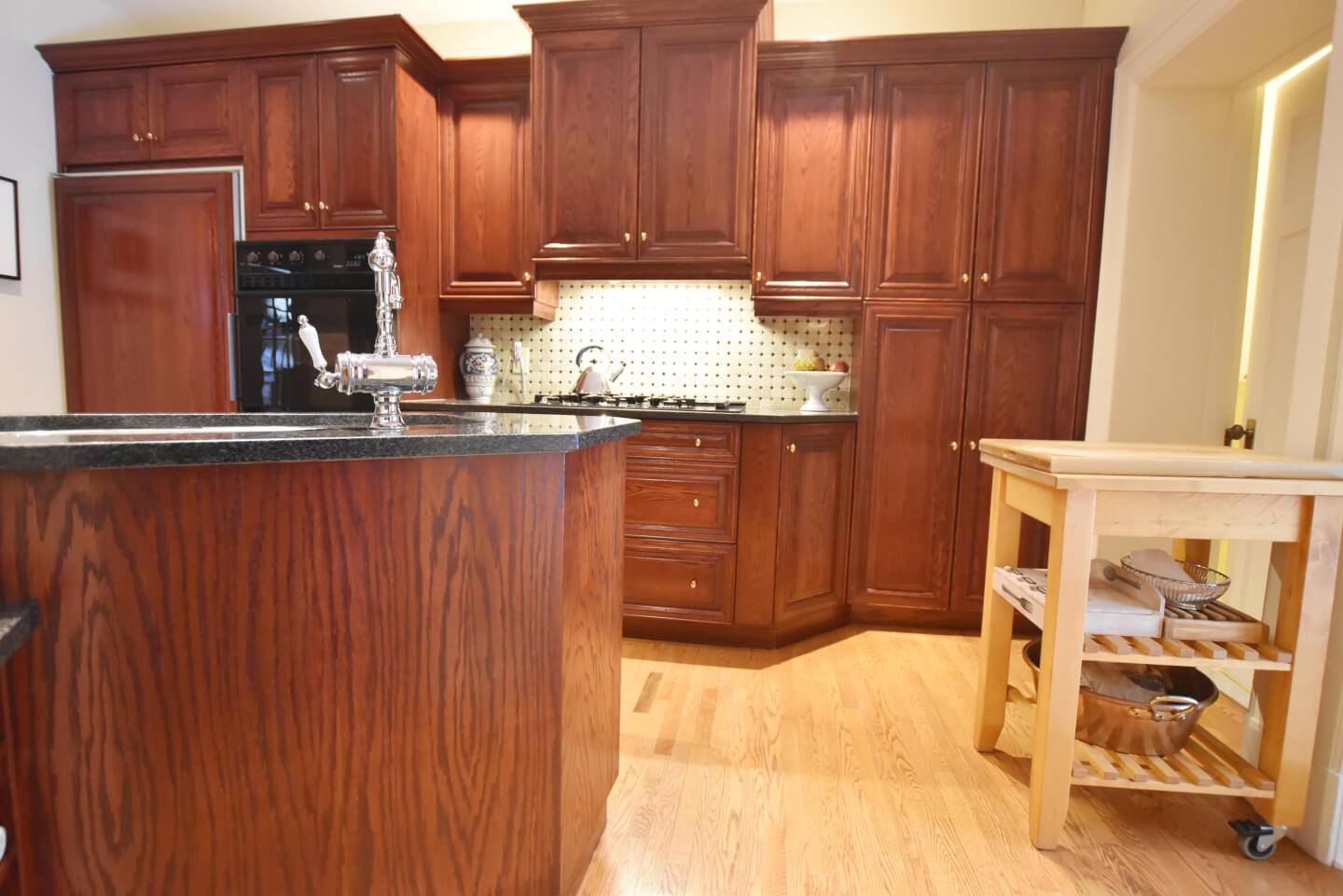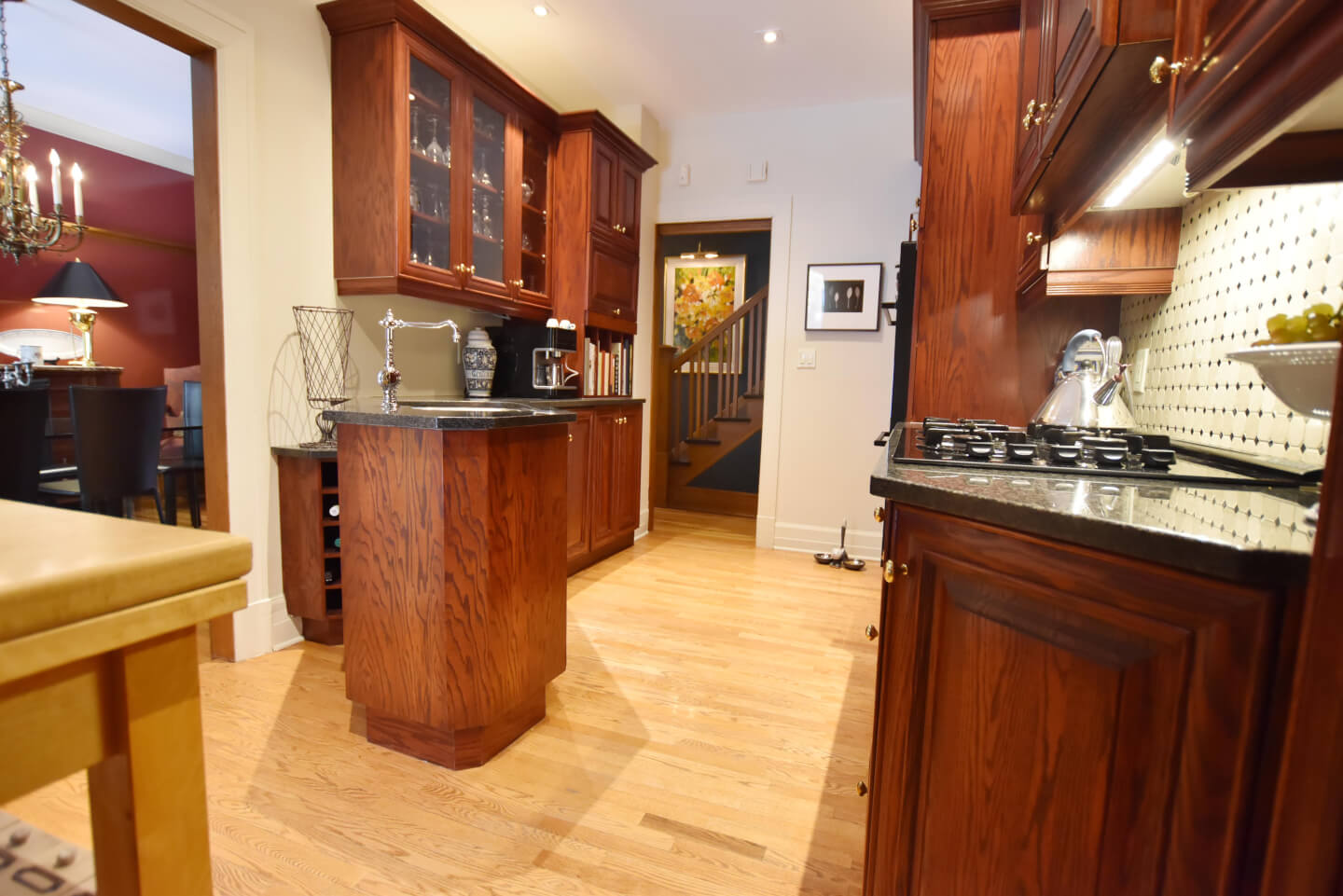 Cuisine d’allure classique, appareils haut de gamme, comptoir de granit, armoires de chêne