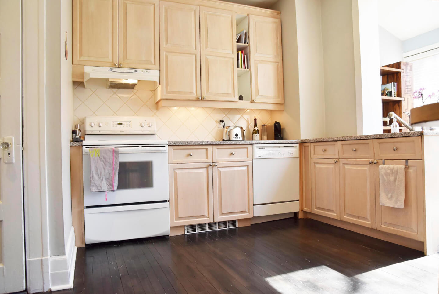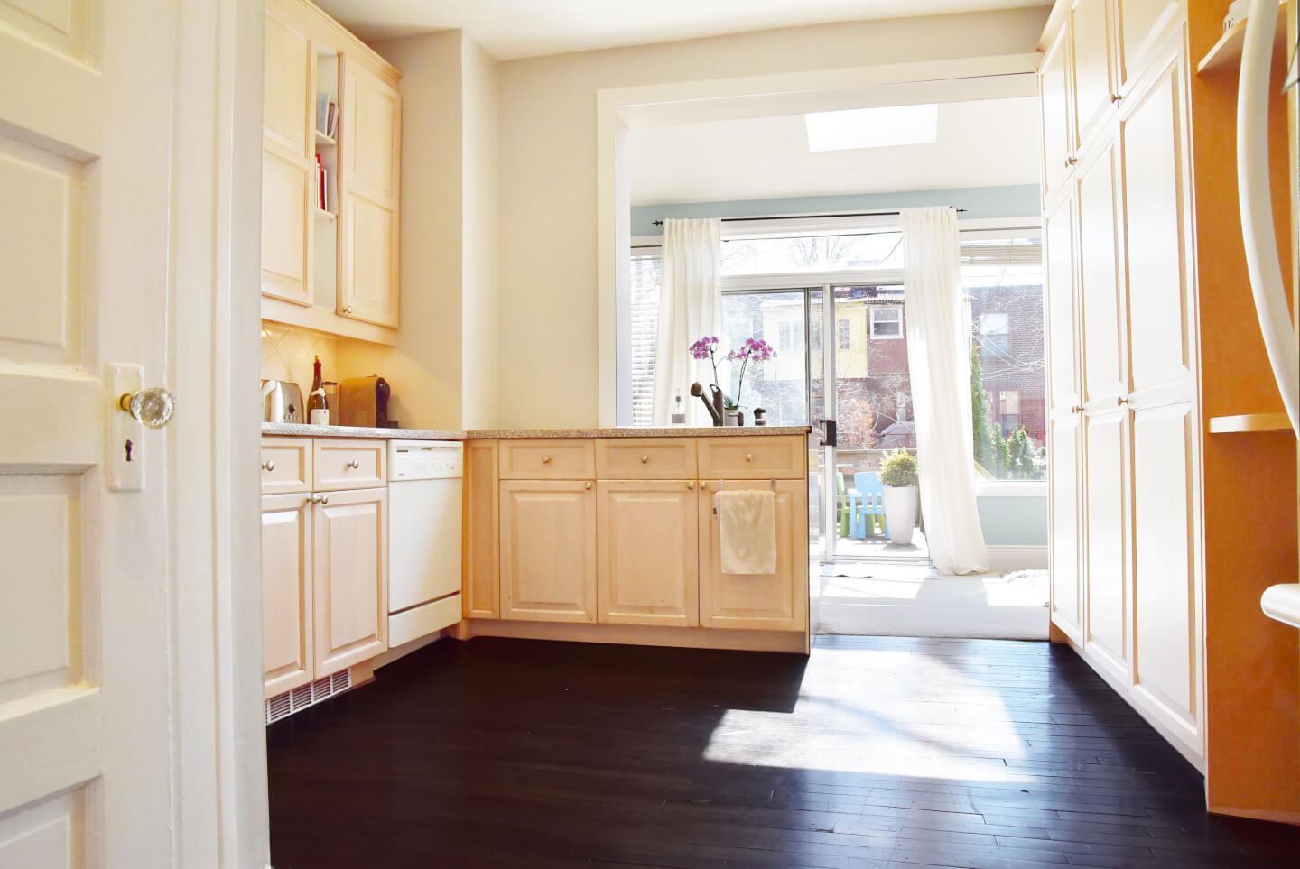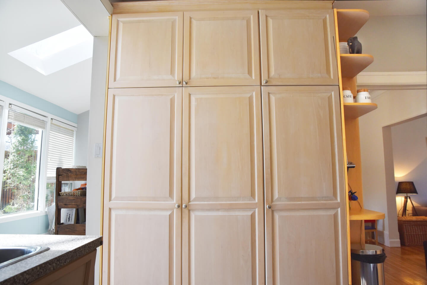 Cuisine 2004 ouverte sur le vivoir solarium; armoire en érable