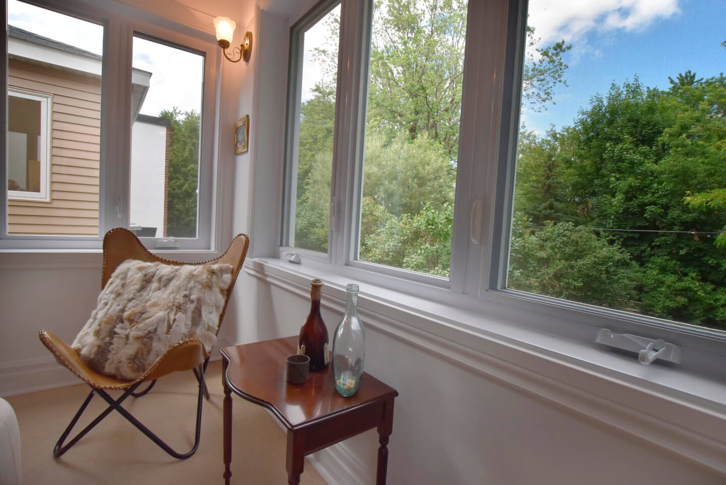 Coin vivoir, 2 vaisseliers encastrés en coin et vue jardin
