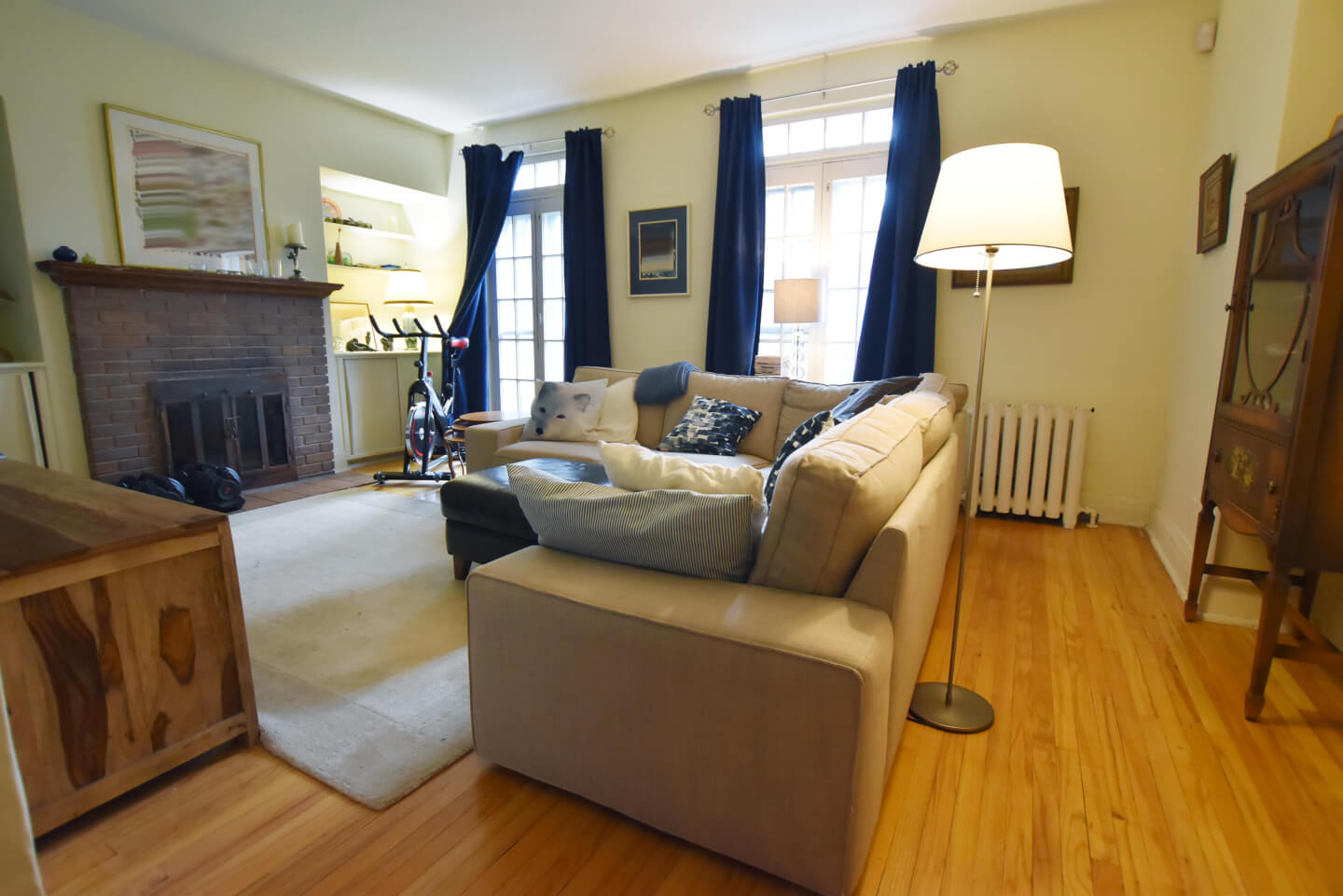 Grand, Salon avec fenestration abondante, foyer décoratif