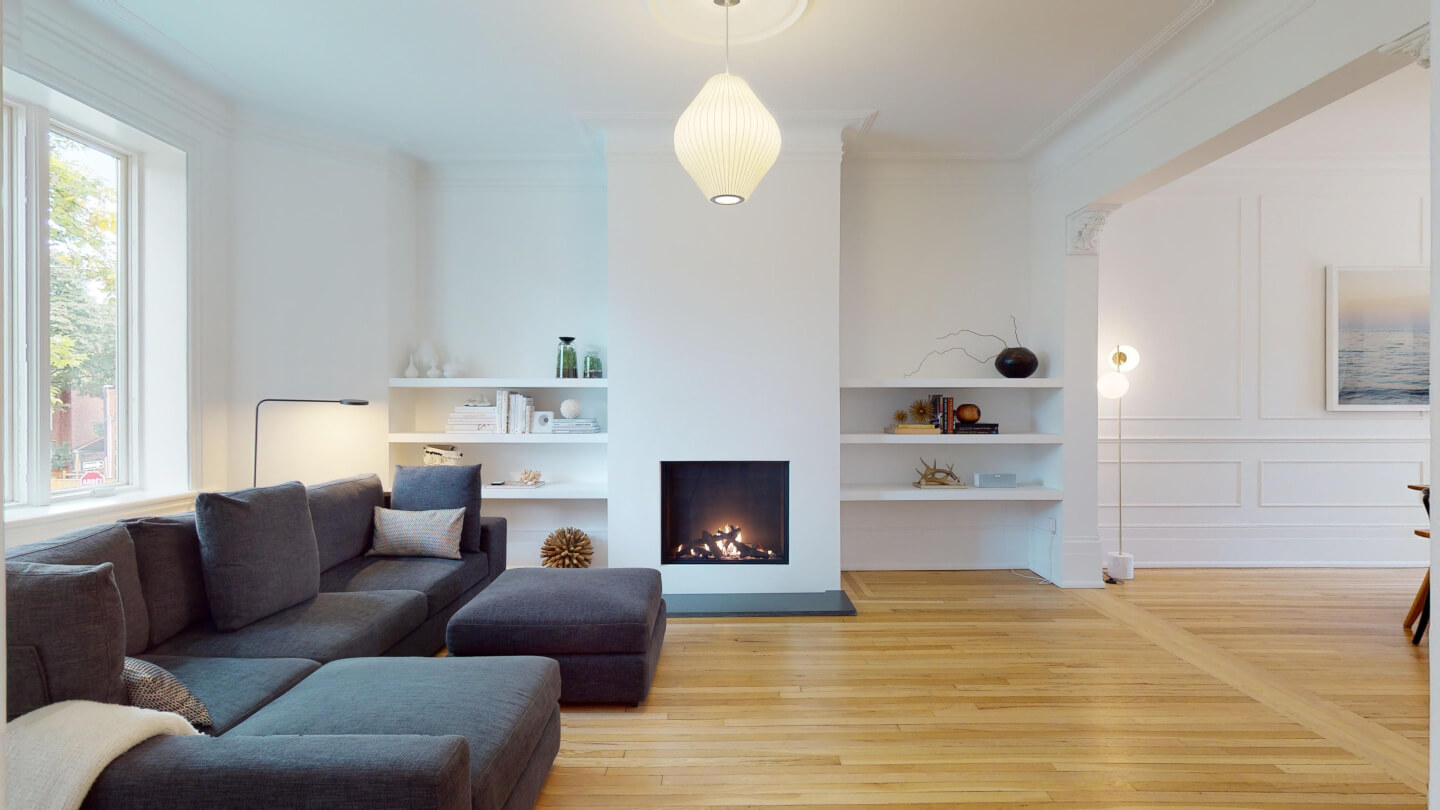 Salon ouvert sur la salle à manger, foyer au gaz propane