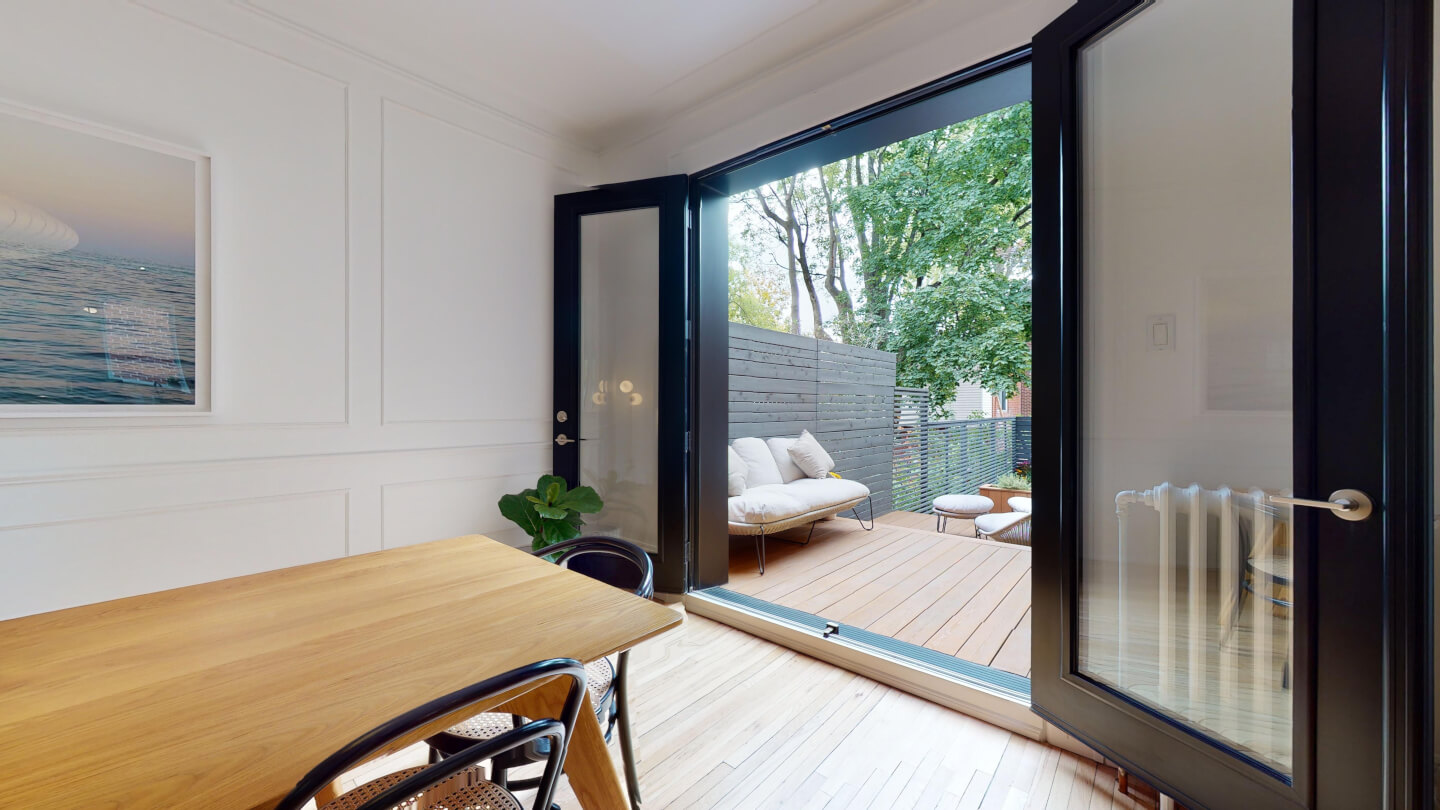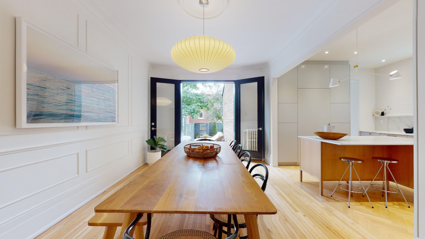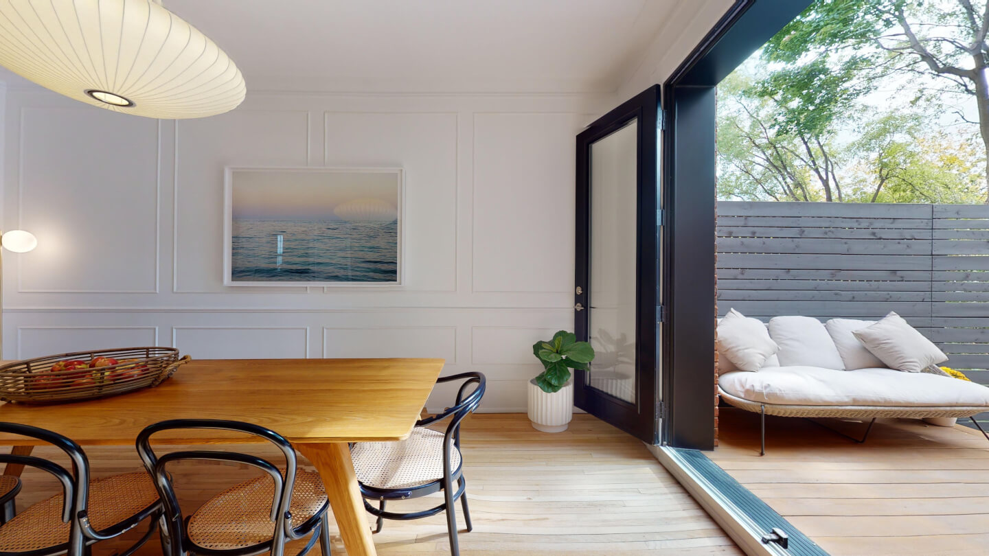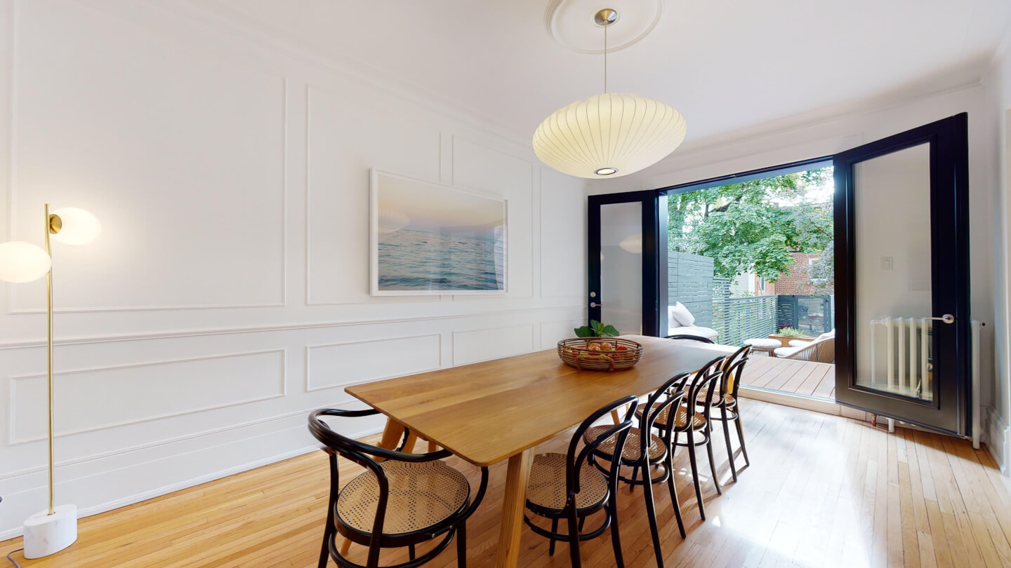 Salle à manger aux murs ornés d’élégantes moulures, celle-ci ouverte sur sa cuisine, porte patio pleine hauteur à la terrasse
