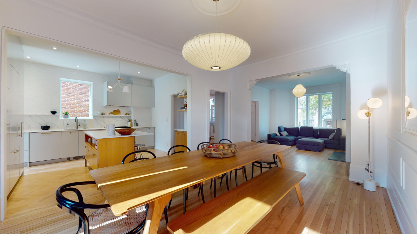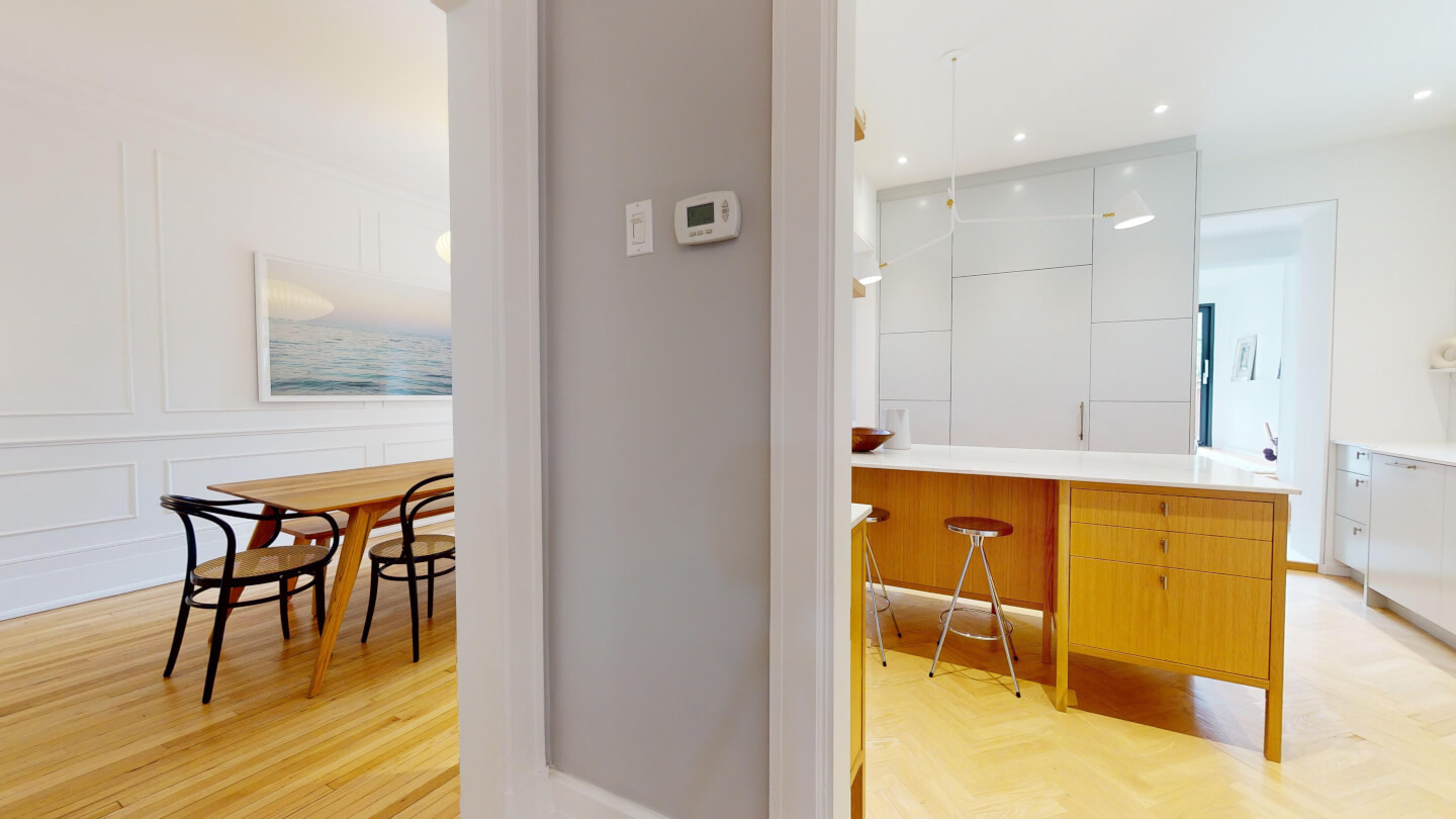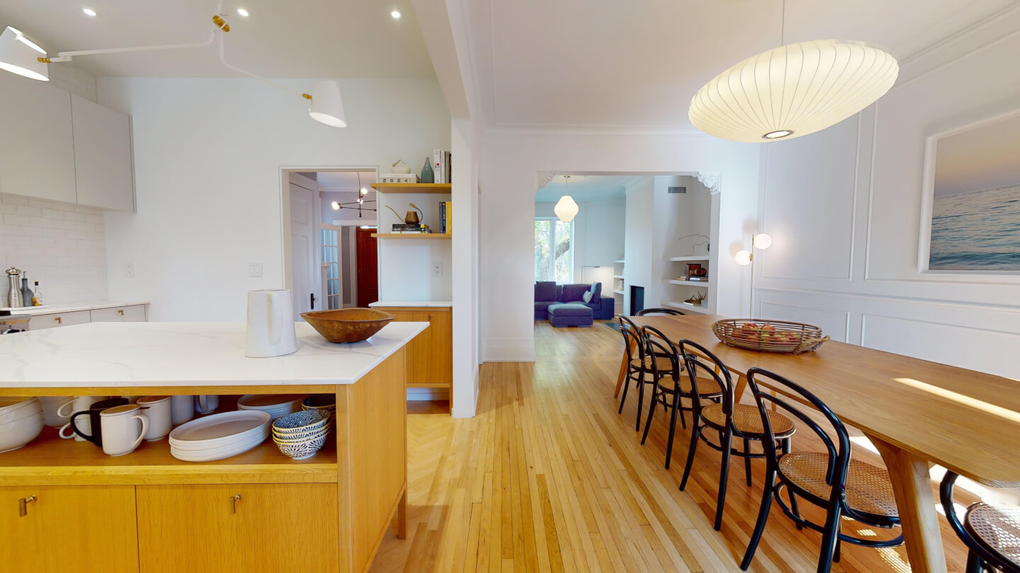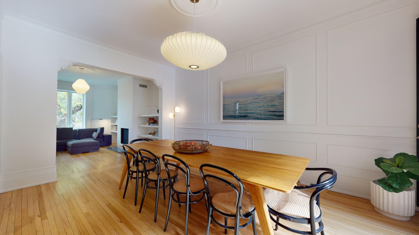 Salle à manger aux murs ornés d’élégantes moulures, celle-ci ouverte sur sa cuisine, porte patio pleine hauteur à la terrasse