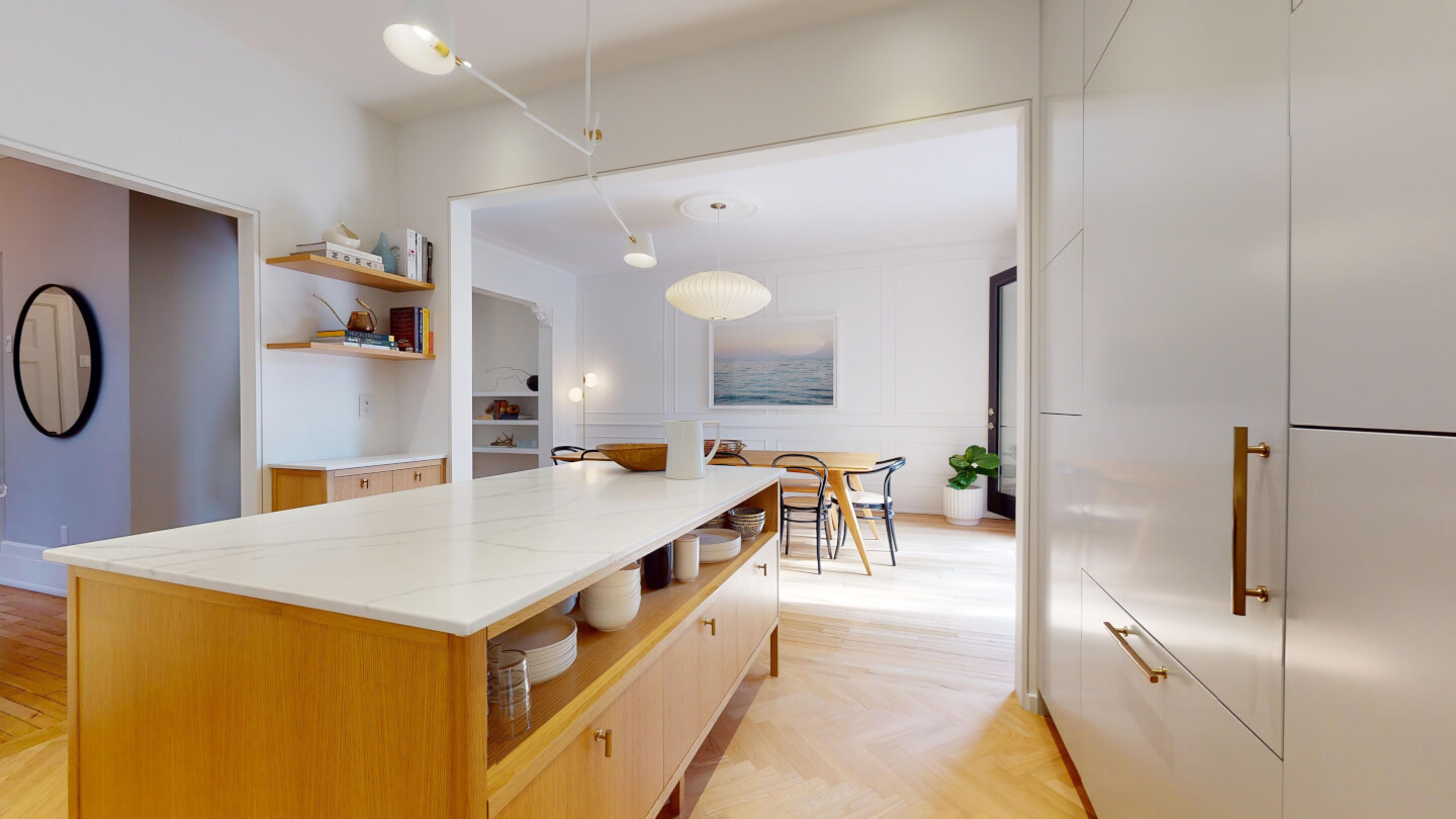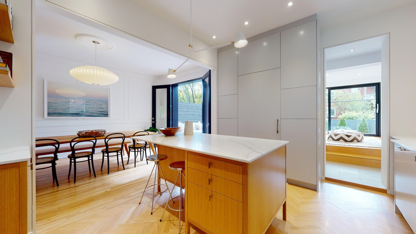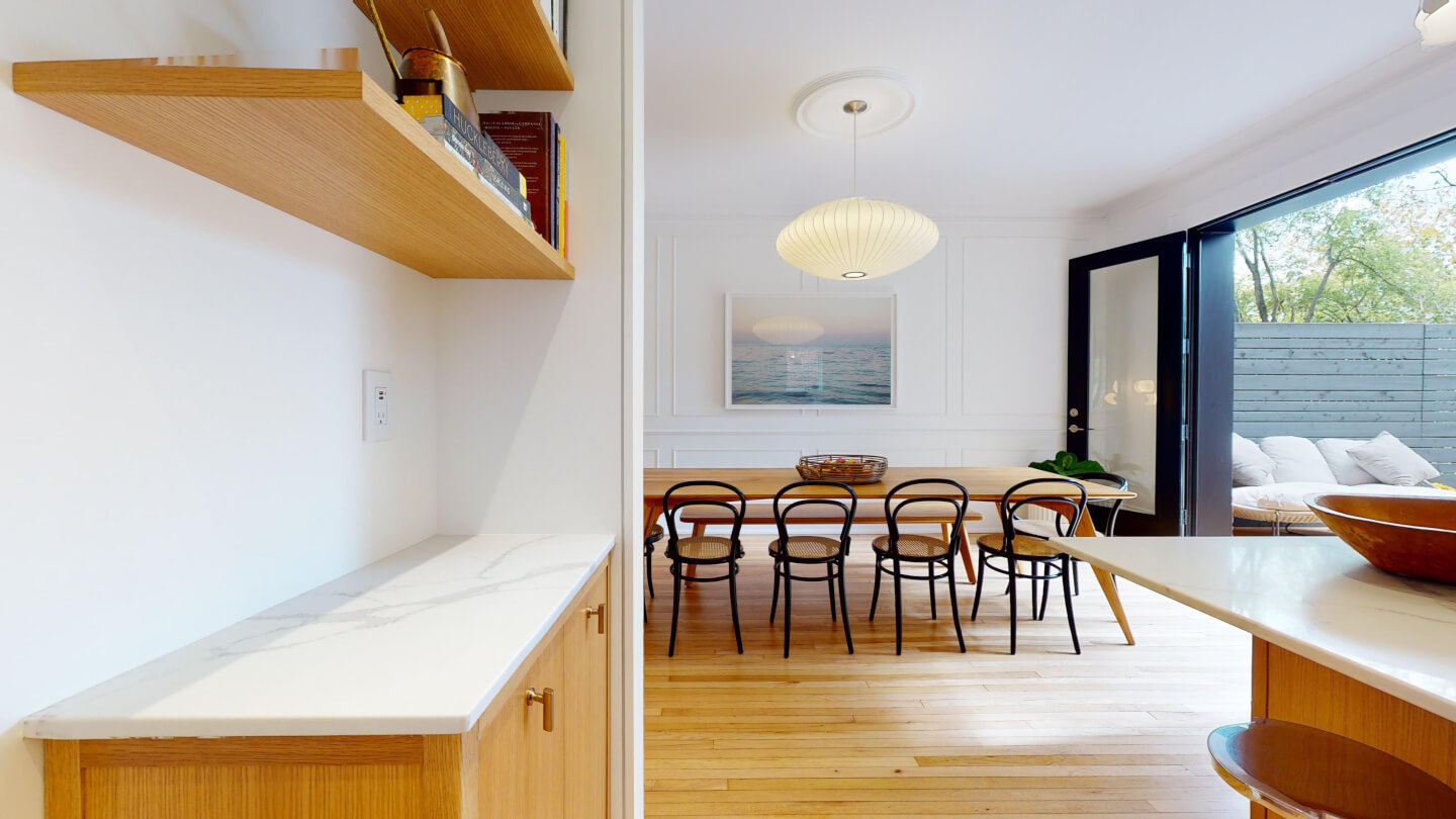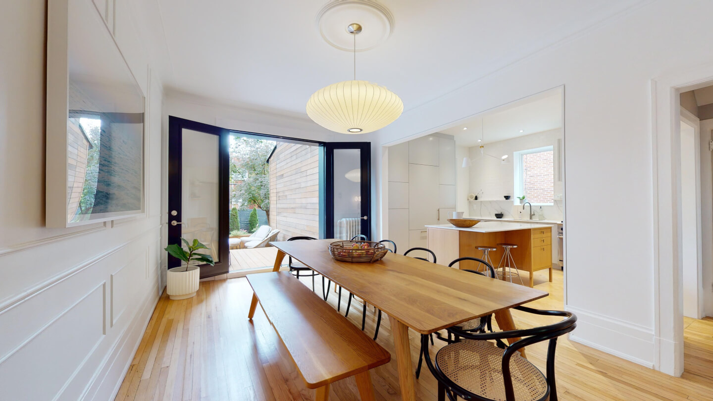Salle à manger aux murs ornés d’élégantes moulures, celle-ci ouverte sur sa cuisine, porte patio pleine hauteur à la terrasse