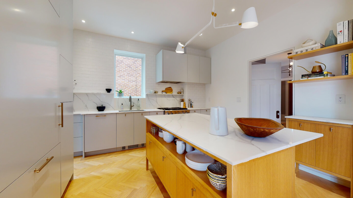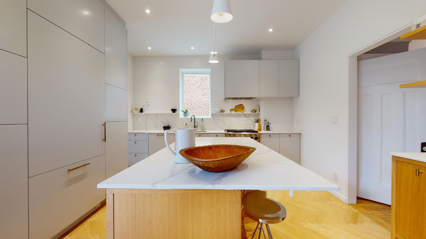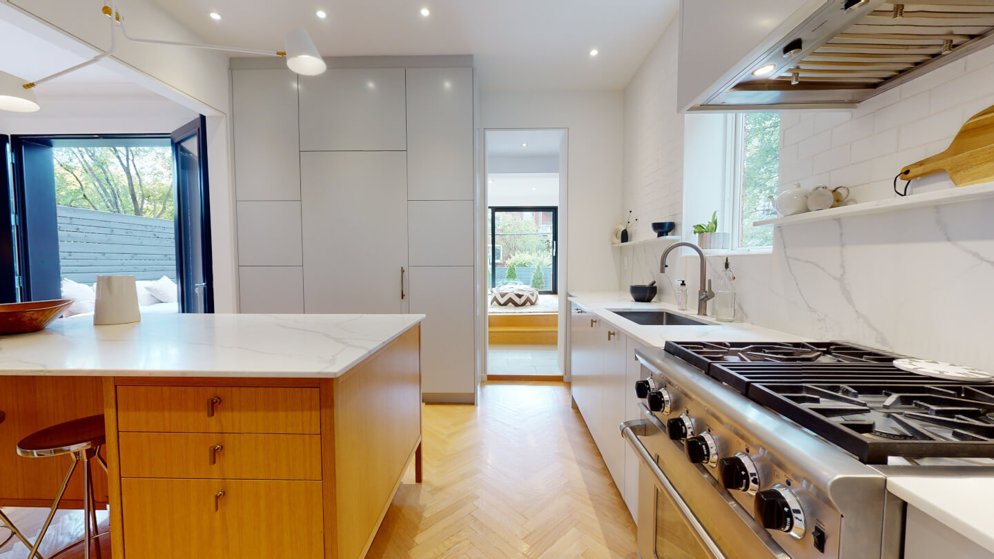Spectaculaire cuisine d’influence Européenne, comptoir de quartz, îlot central, appareils de haute gamme sur plancher de bois de chêne chevronné