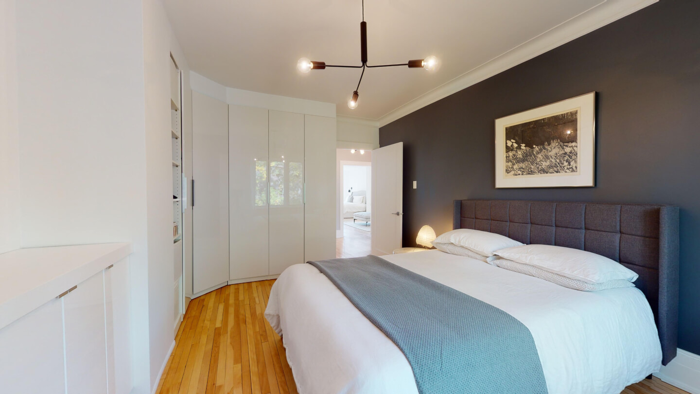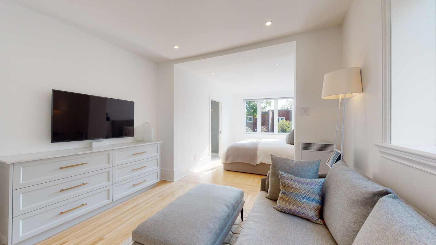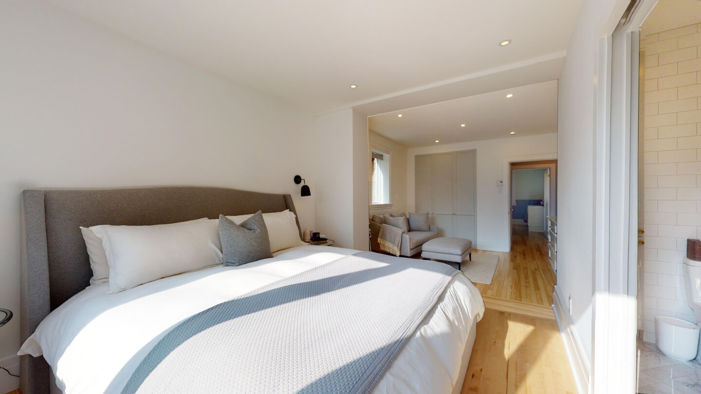 Chambre des maîtres avec vivoir, armoires et meuble sur mesure et salle de bains attenante (Ensuite) sur plancher de marbre radiant