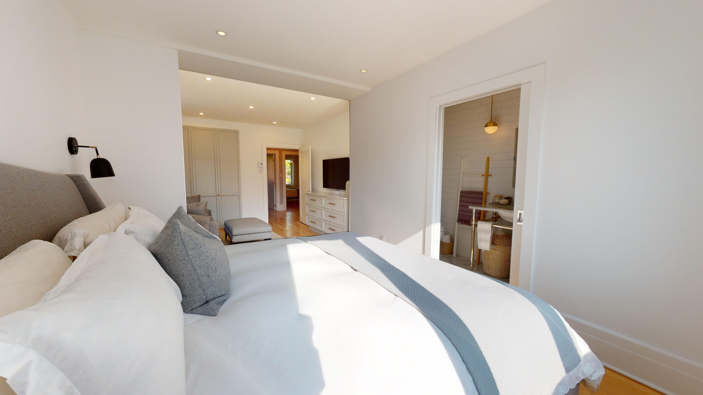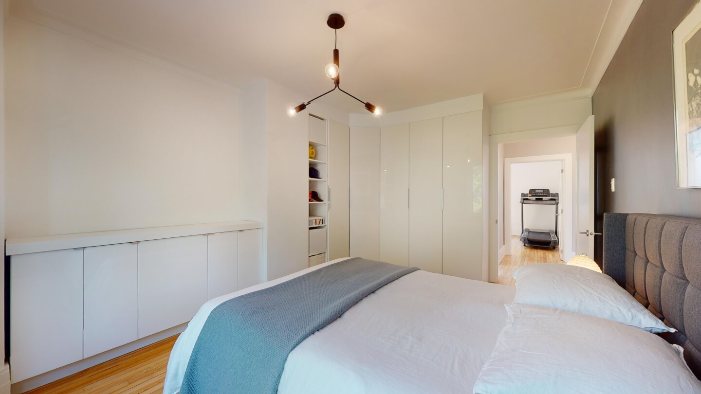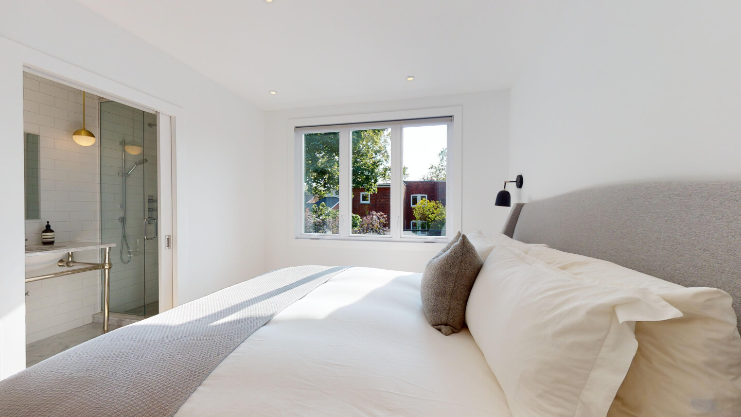 Chambre des maîtres avec vivoir, armoires et meuble sur mesure et salle de bains attenante (Ensuite) sur plancher de marbre radiant