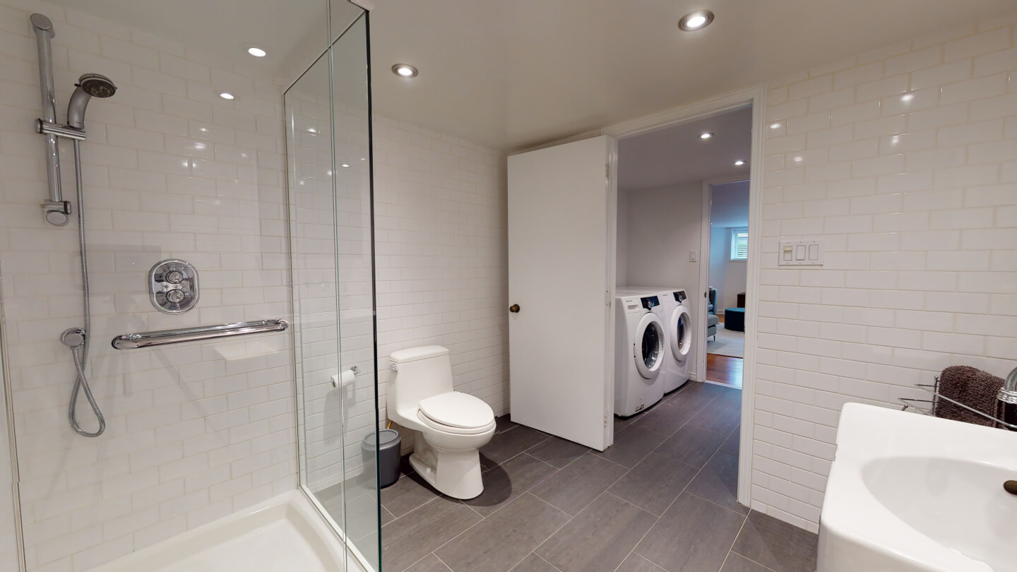 Sous-sol fini, plancher de bambou Hauteur des plafonds 6’-11’’ Salle familiale Salle de lavage Salle de bains avec douche Sous-sol non fini, plancher de béton (salle mécanique & rangement)