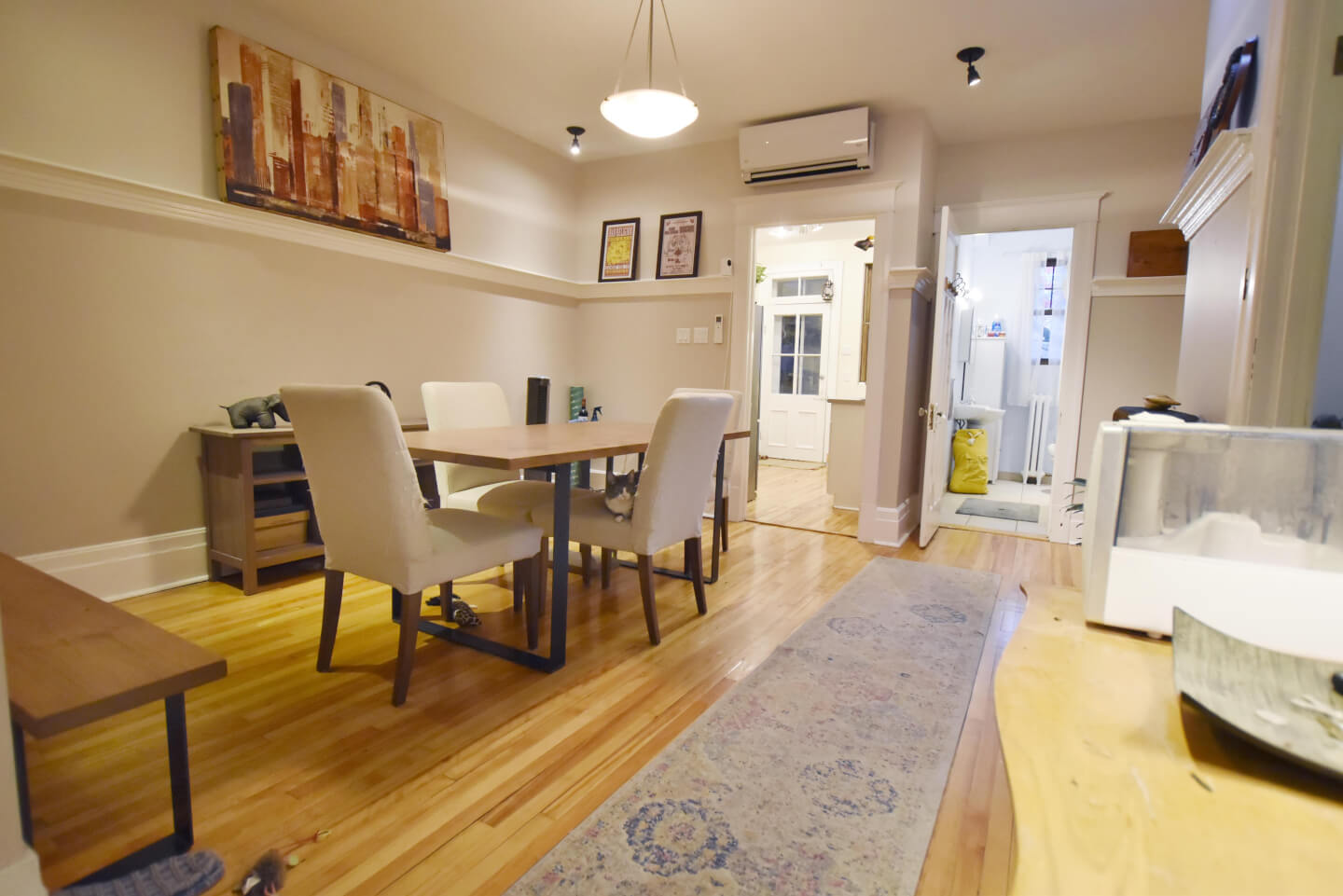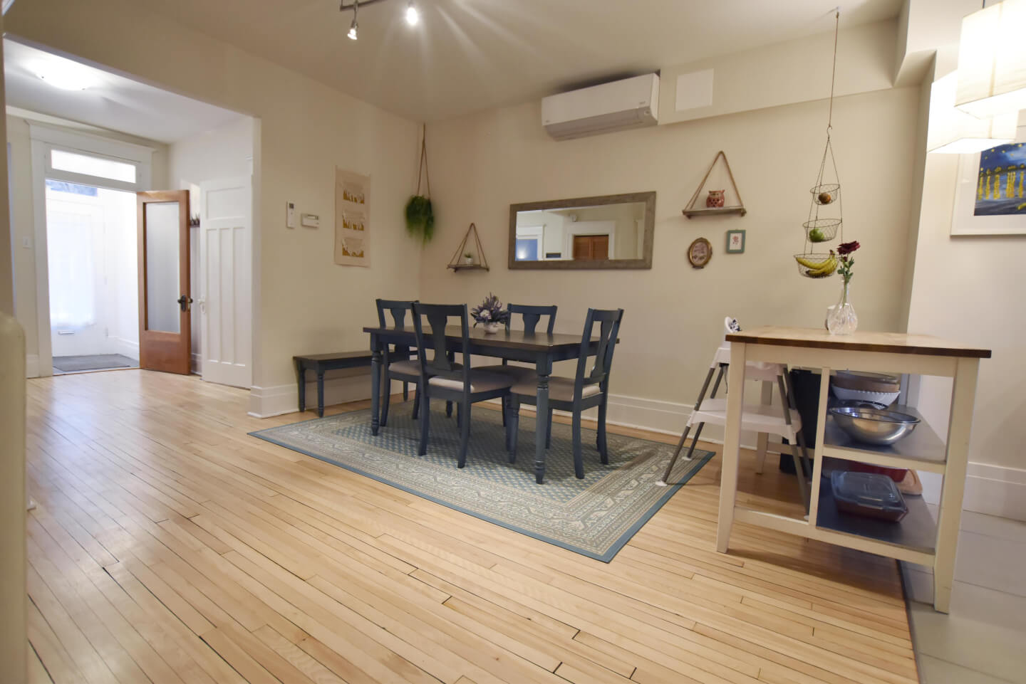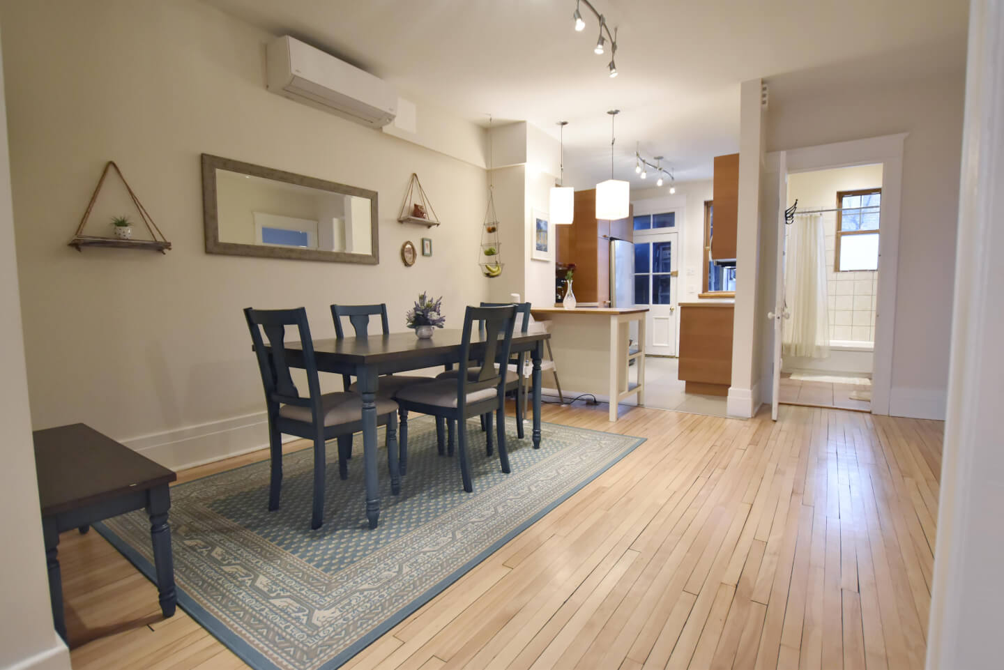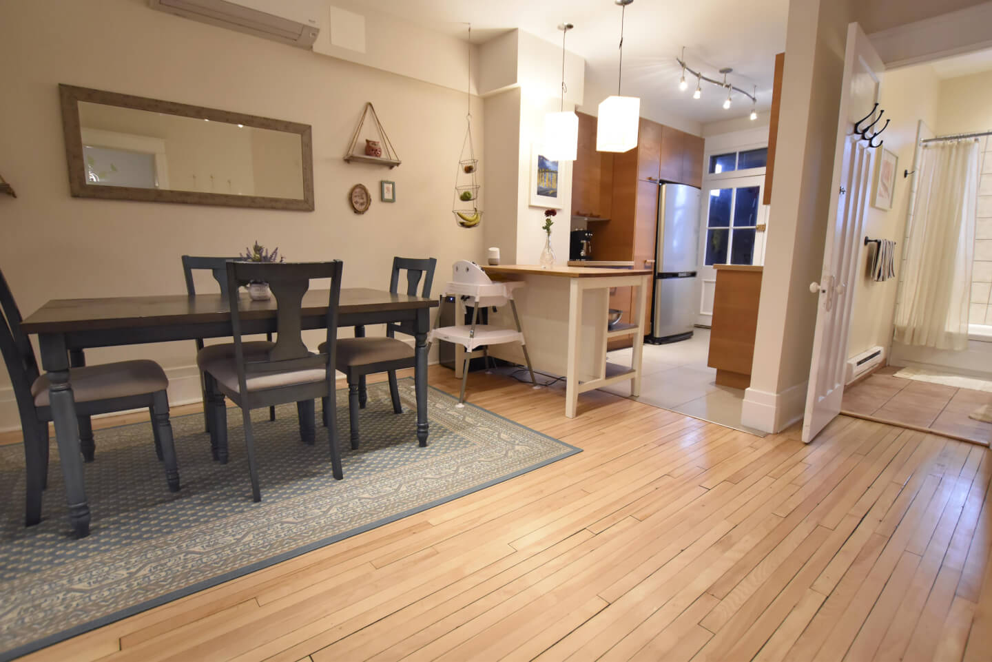Salle à manger au cœur du logement et partiellement ouverte à la jolie cuisine et air climatisé thermo pompe