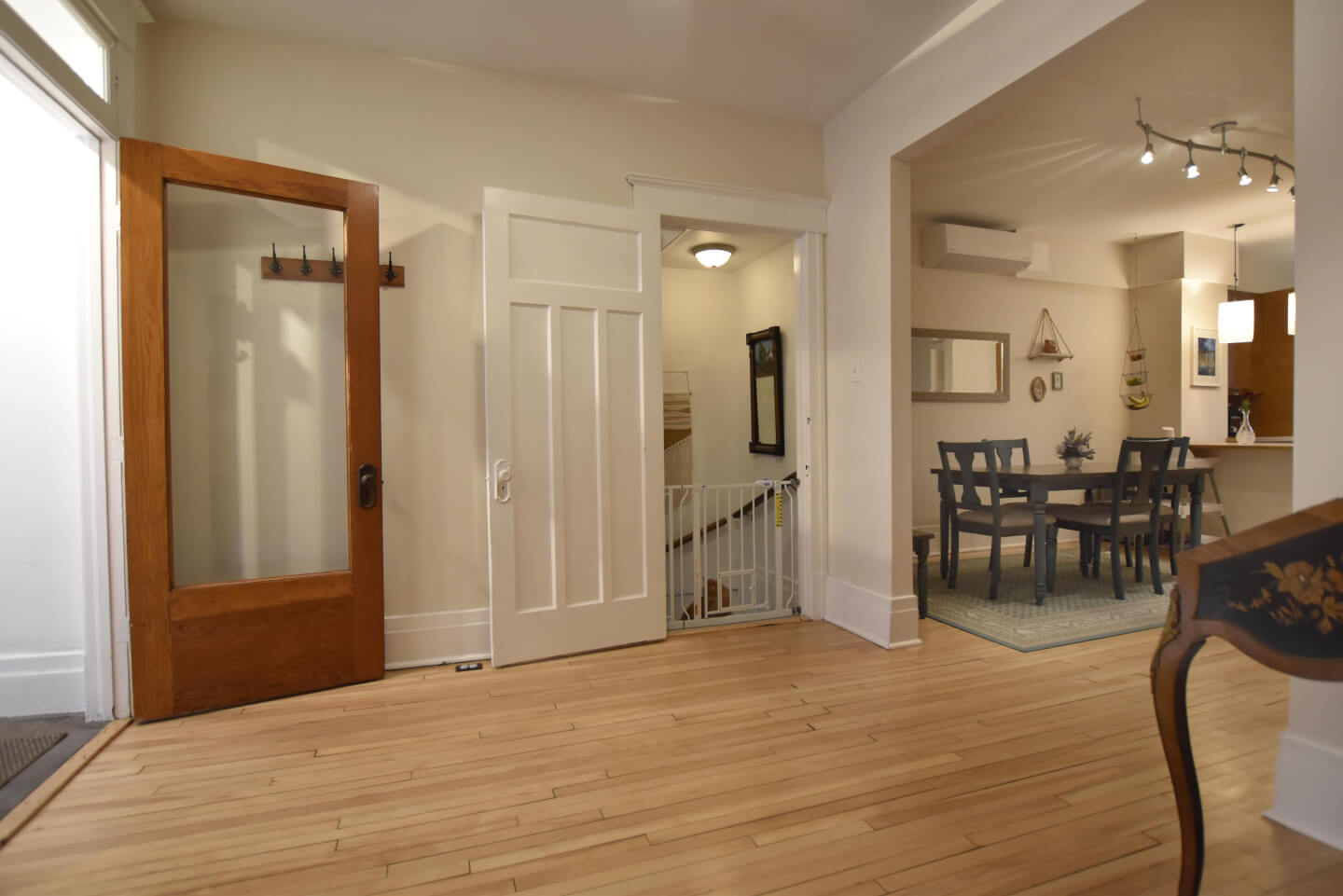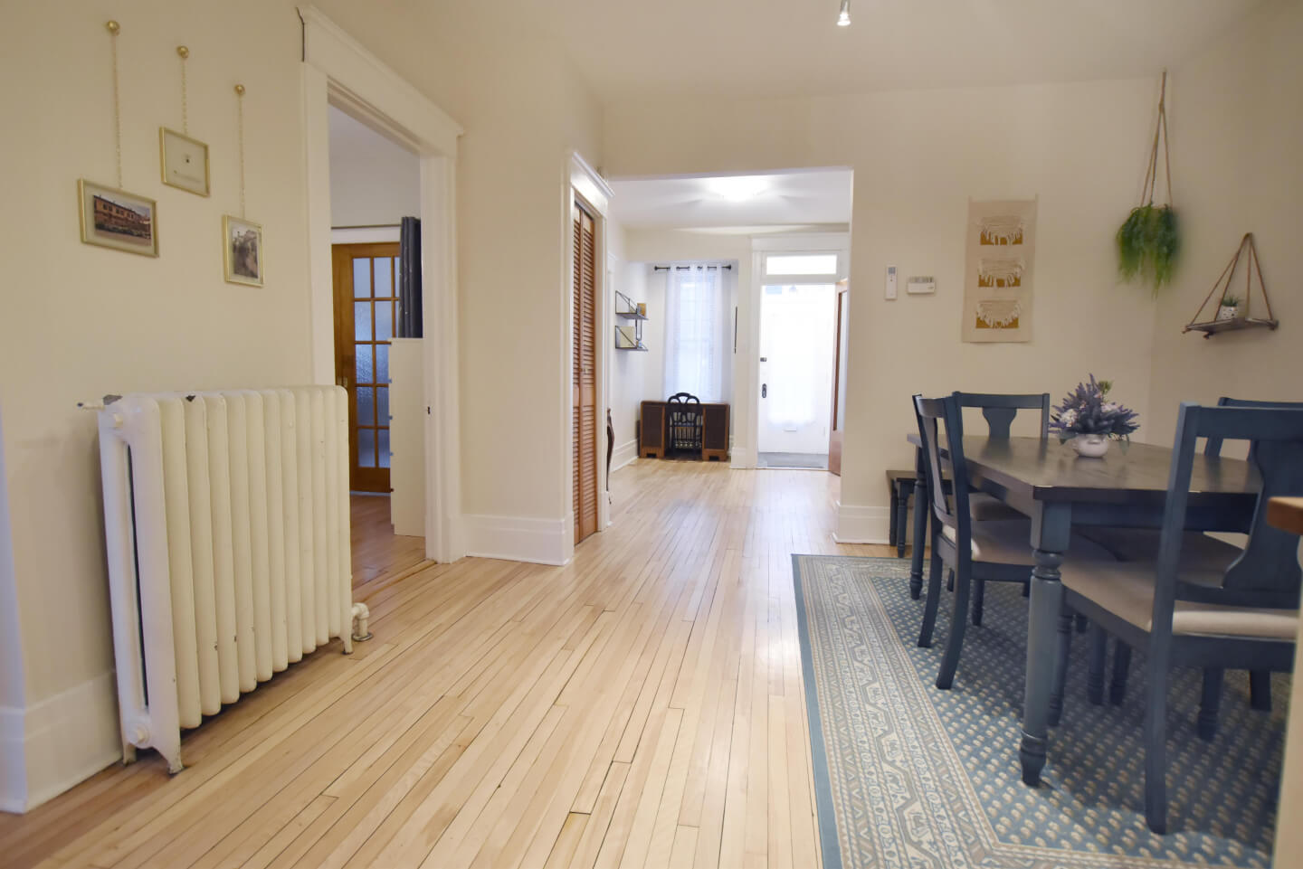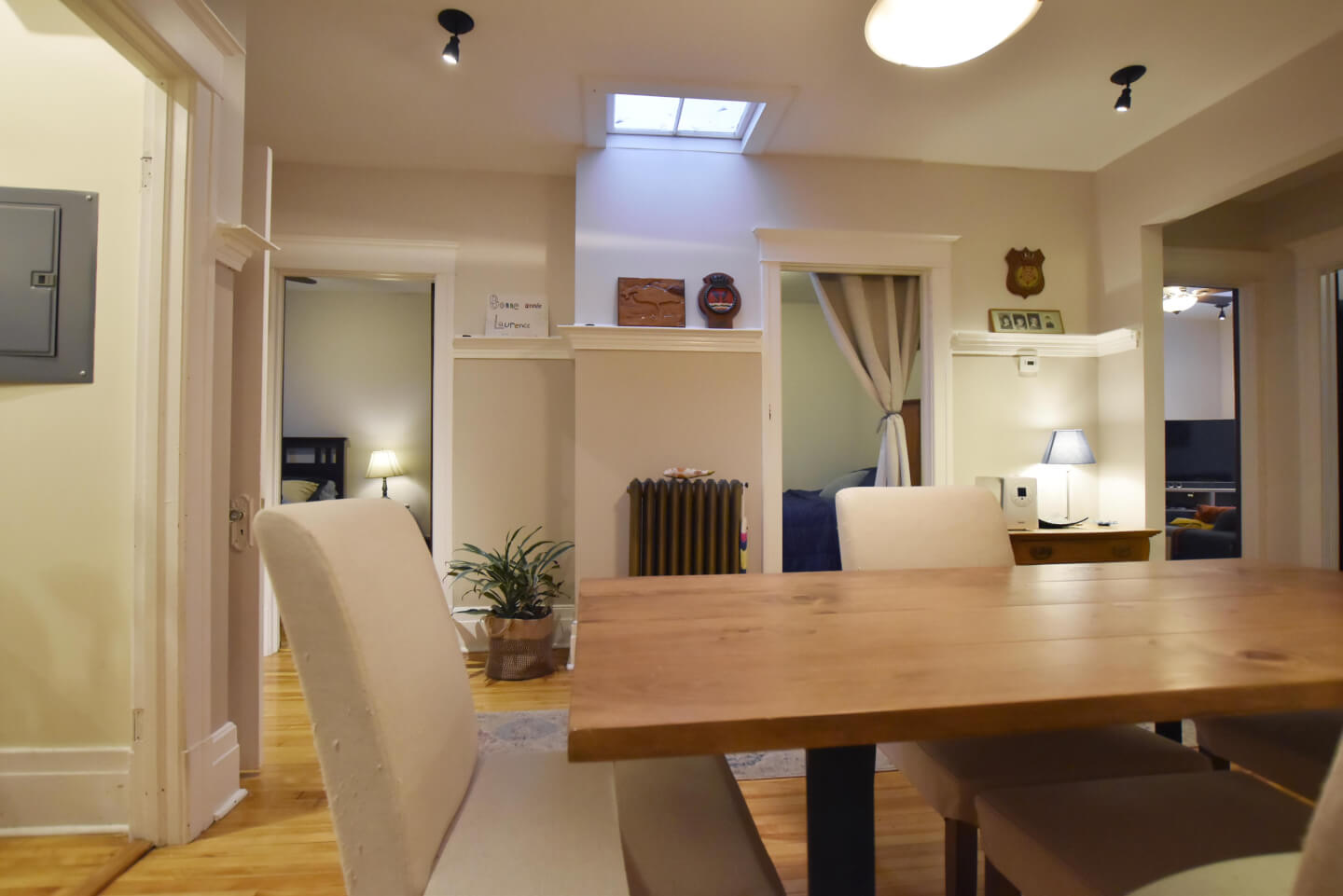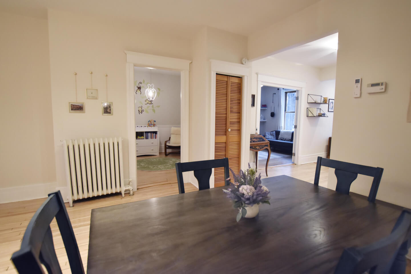 Salle à manger au cœur du logement et partiellement ouverte à la jolie cuisine et air climatisé thermo pompe