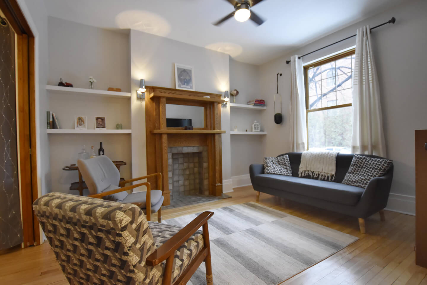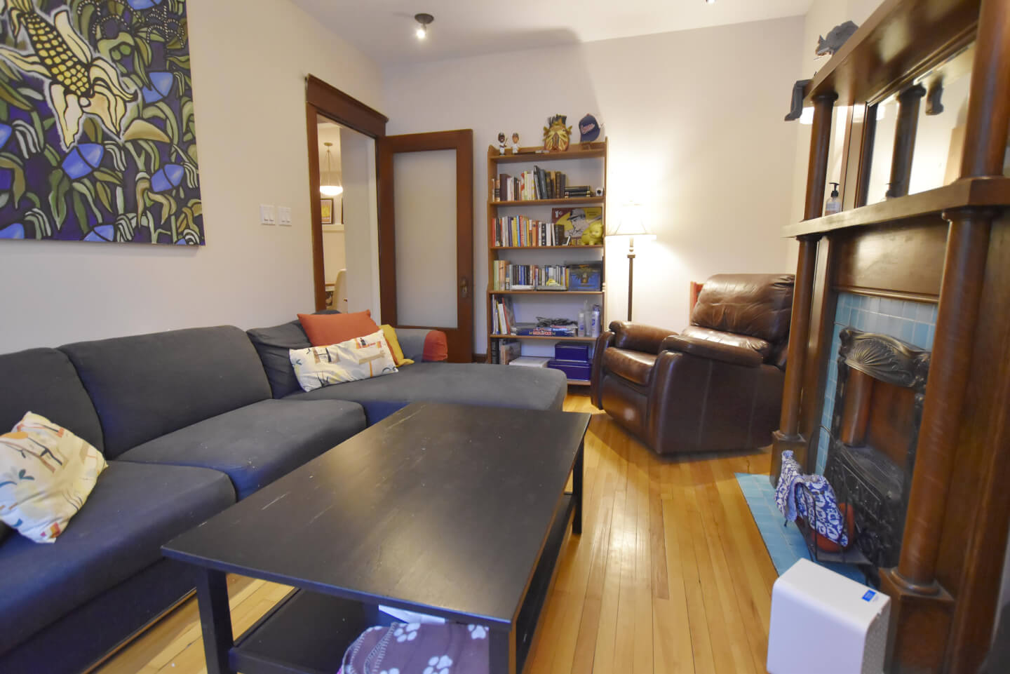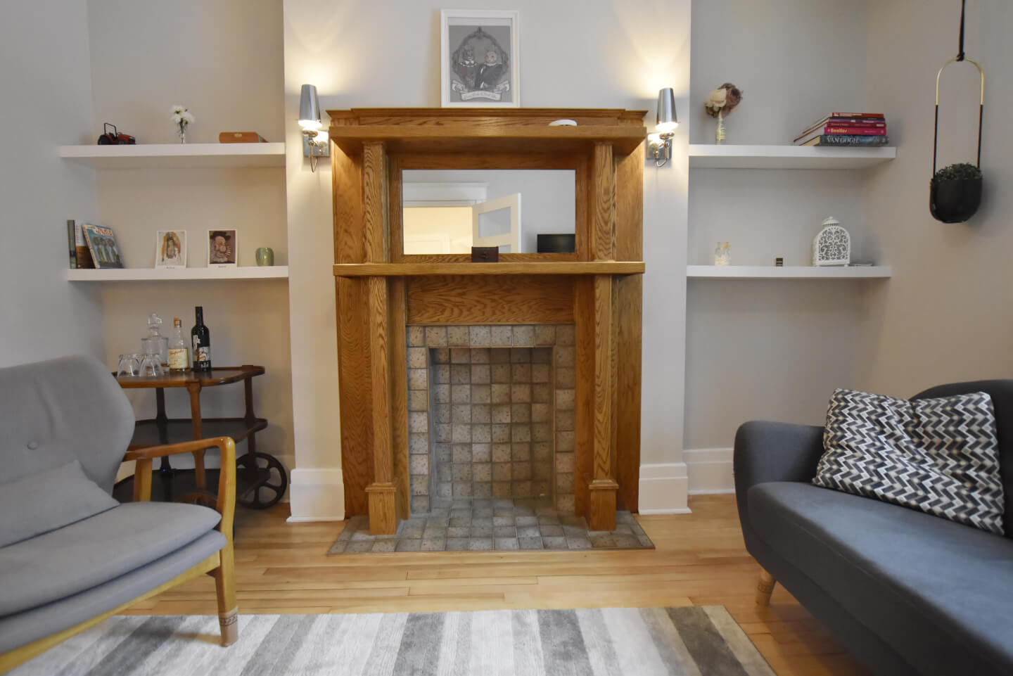 Salon lumineux avec un très joli foyer décoratif d’origine