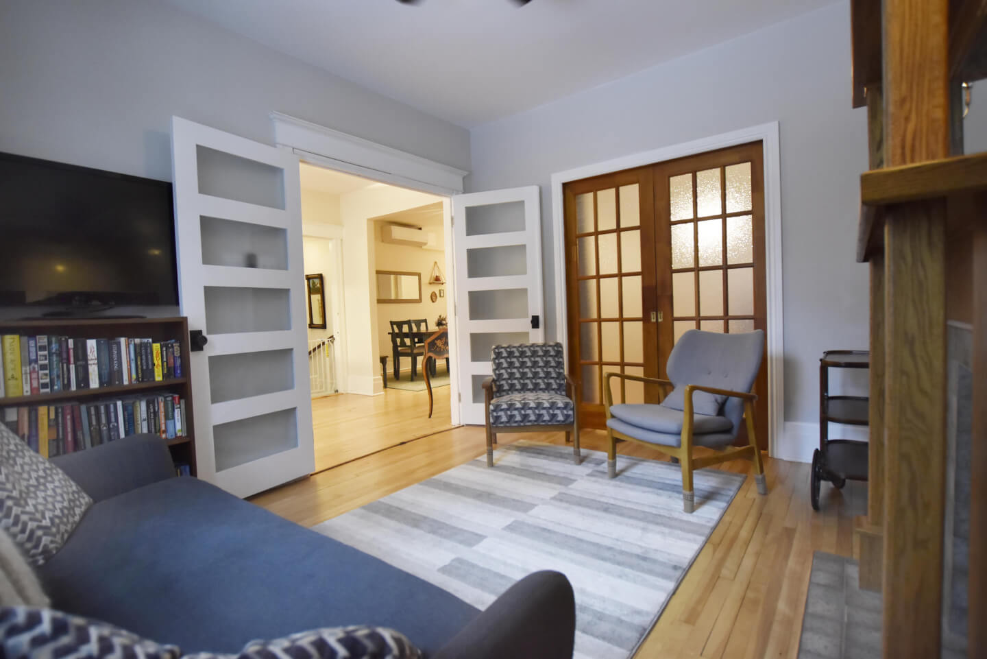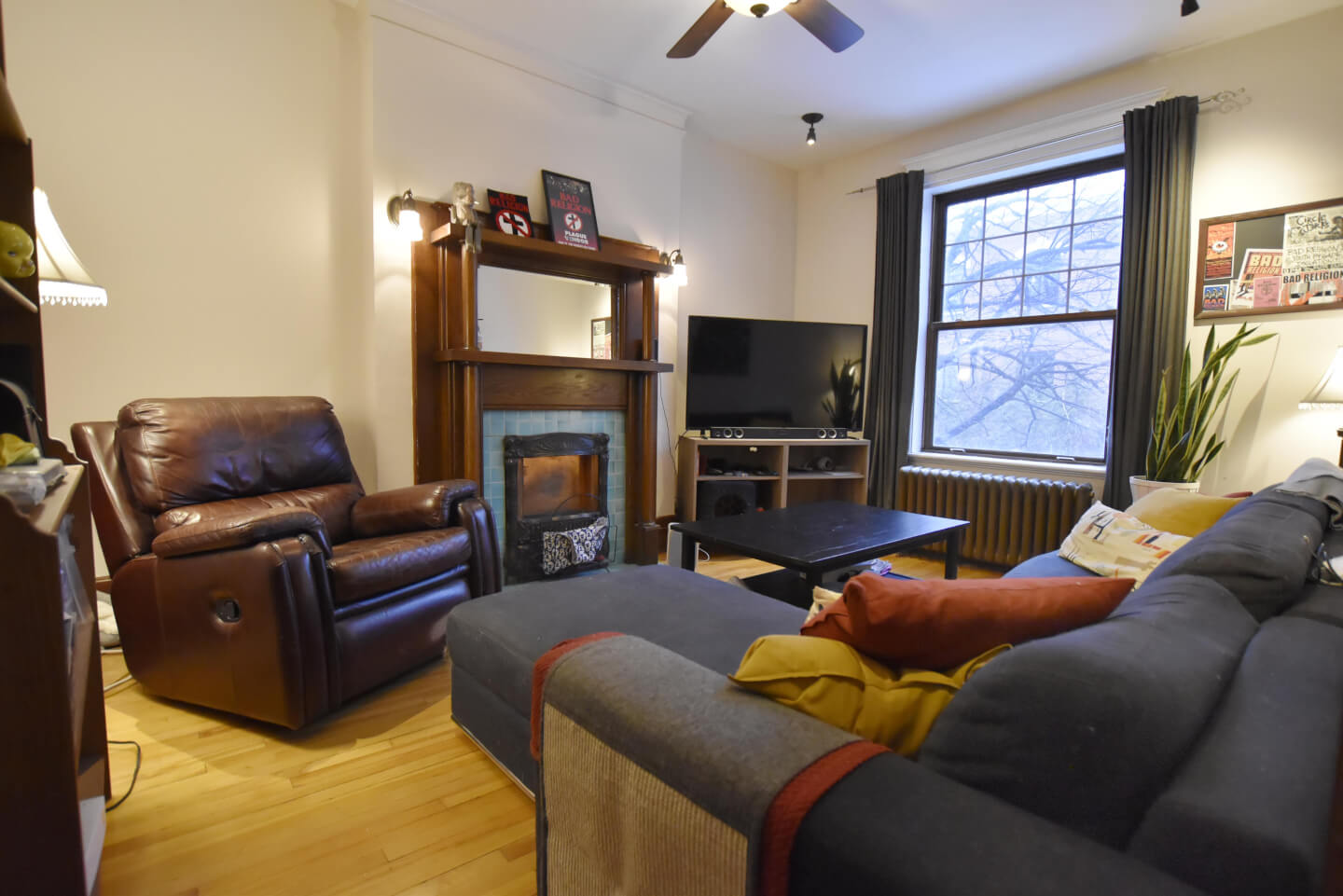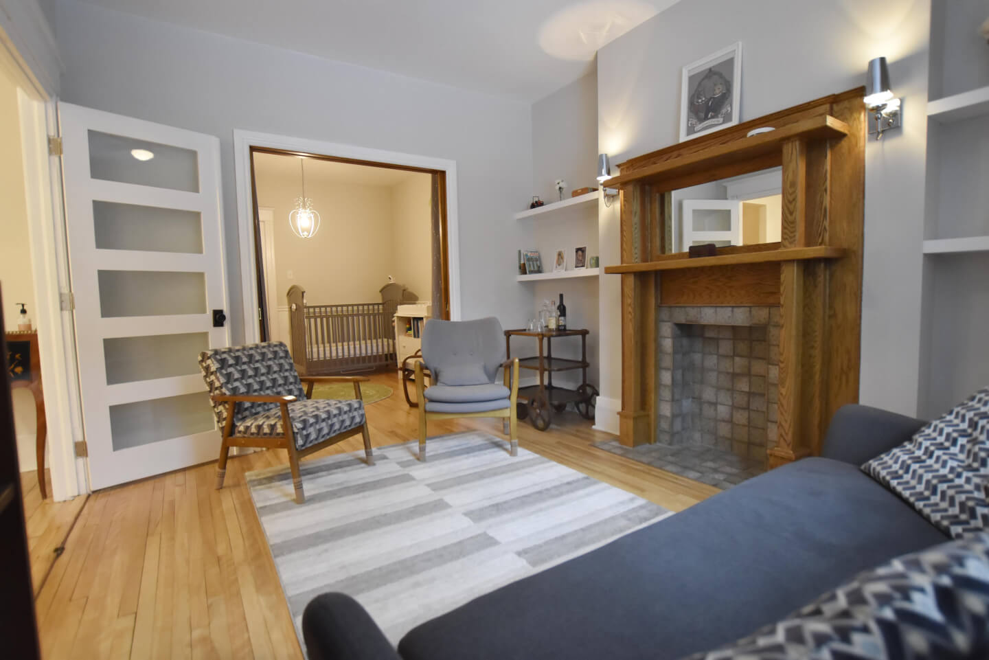 Salon lumineux avec un très joli foyer décoratif d’origine