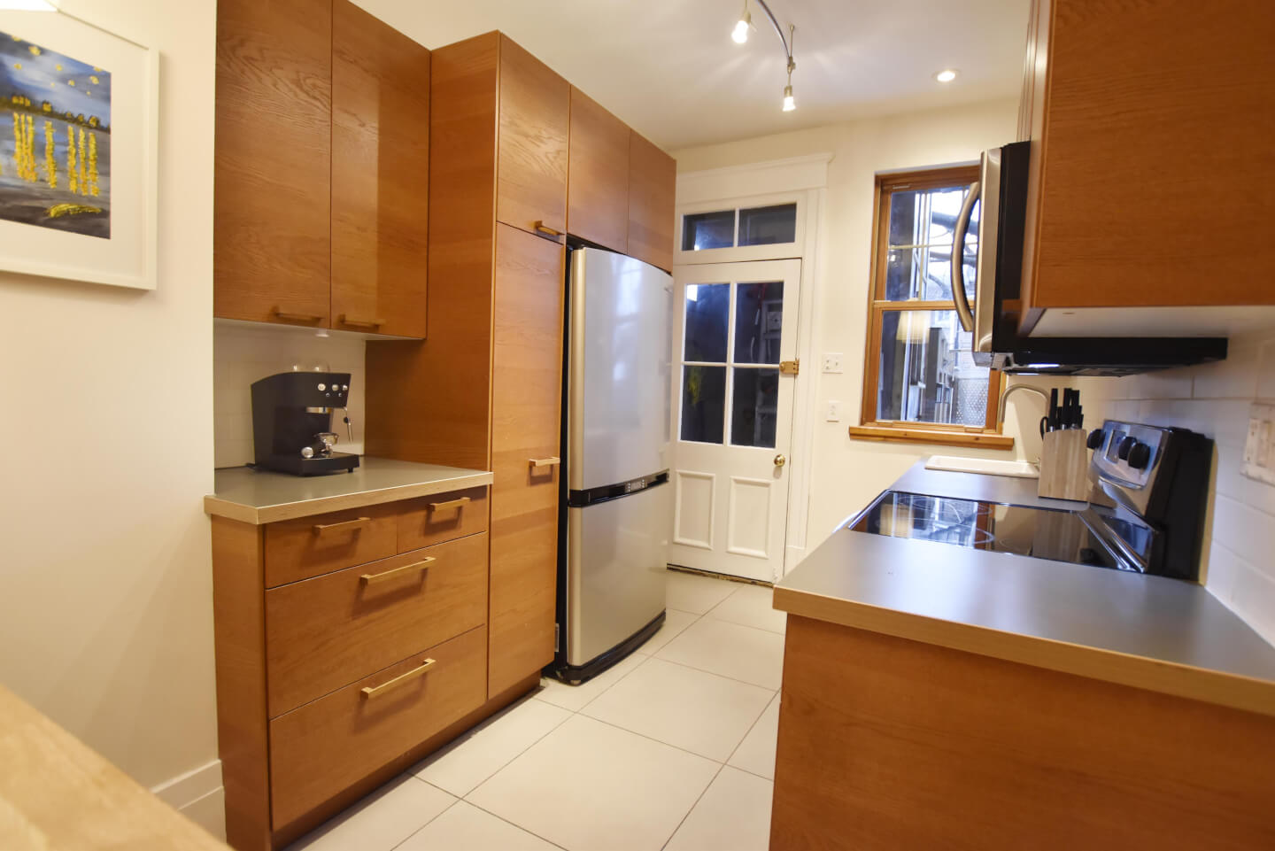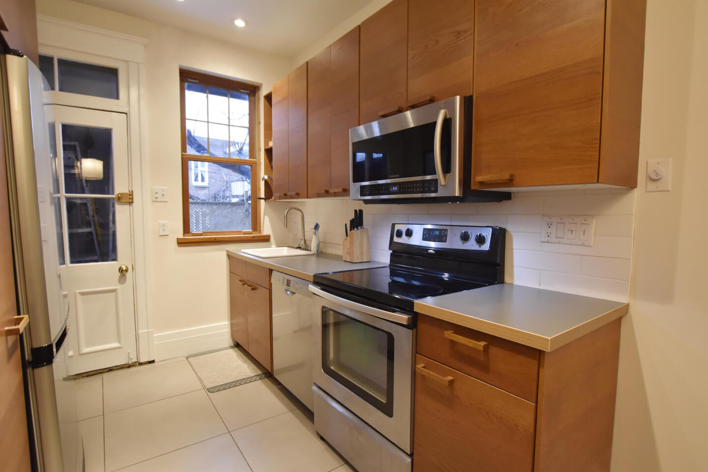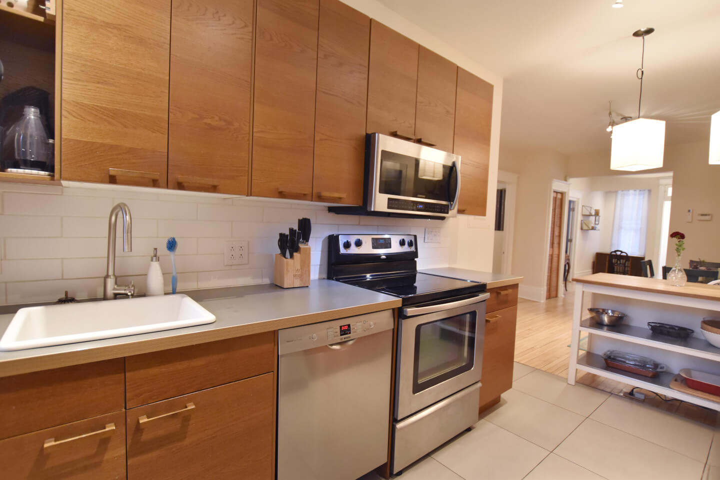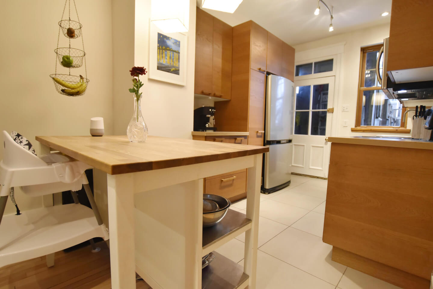 Très jolie cuisine, armoires en bois, plancher de céramique, accès au grand patio en bois/ jardin urbain clôturé