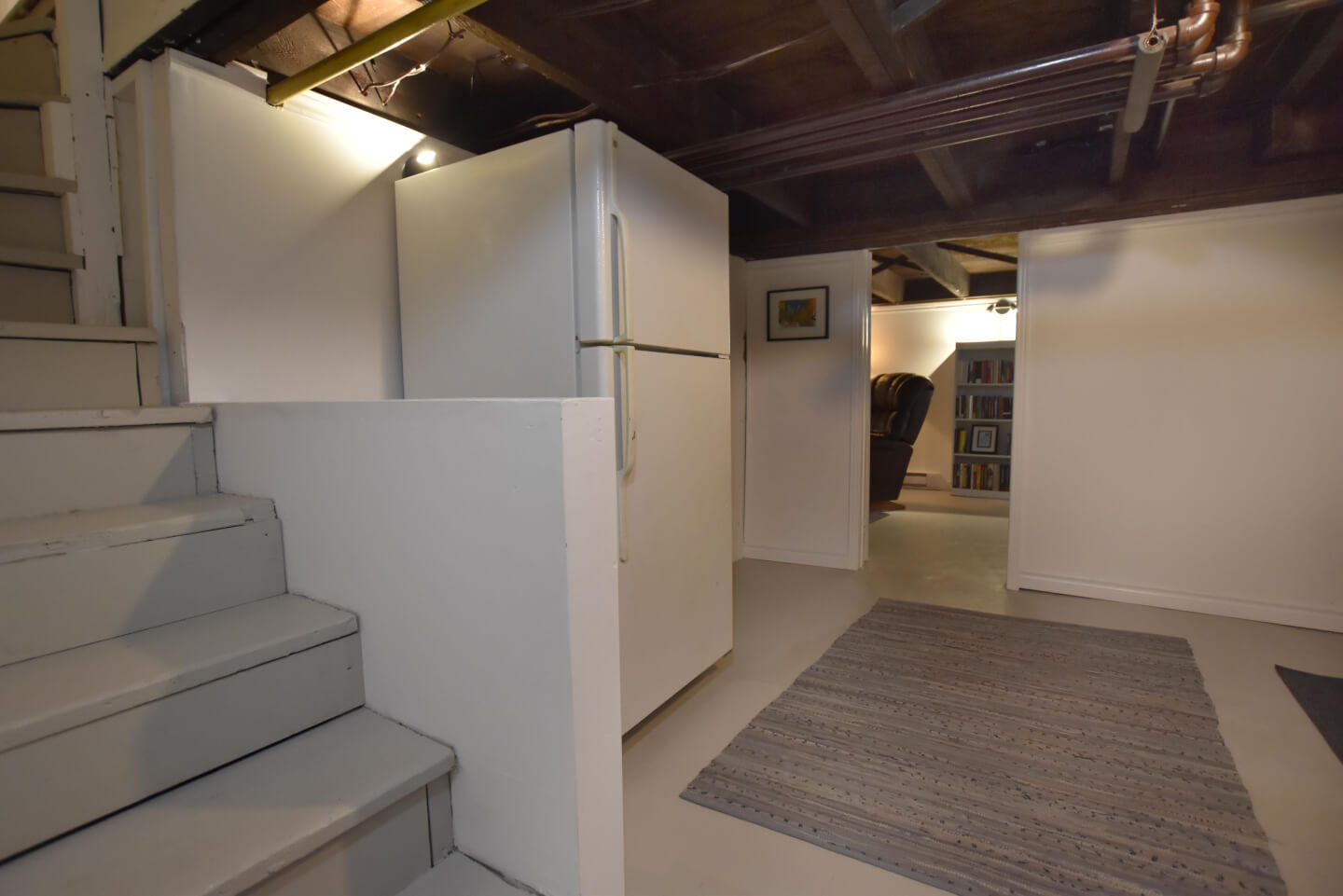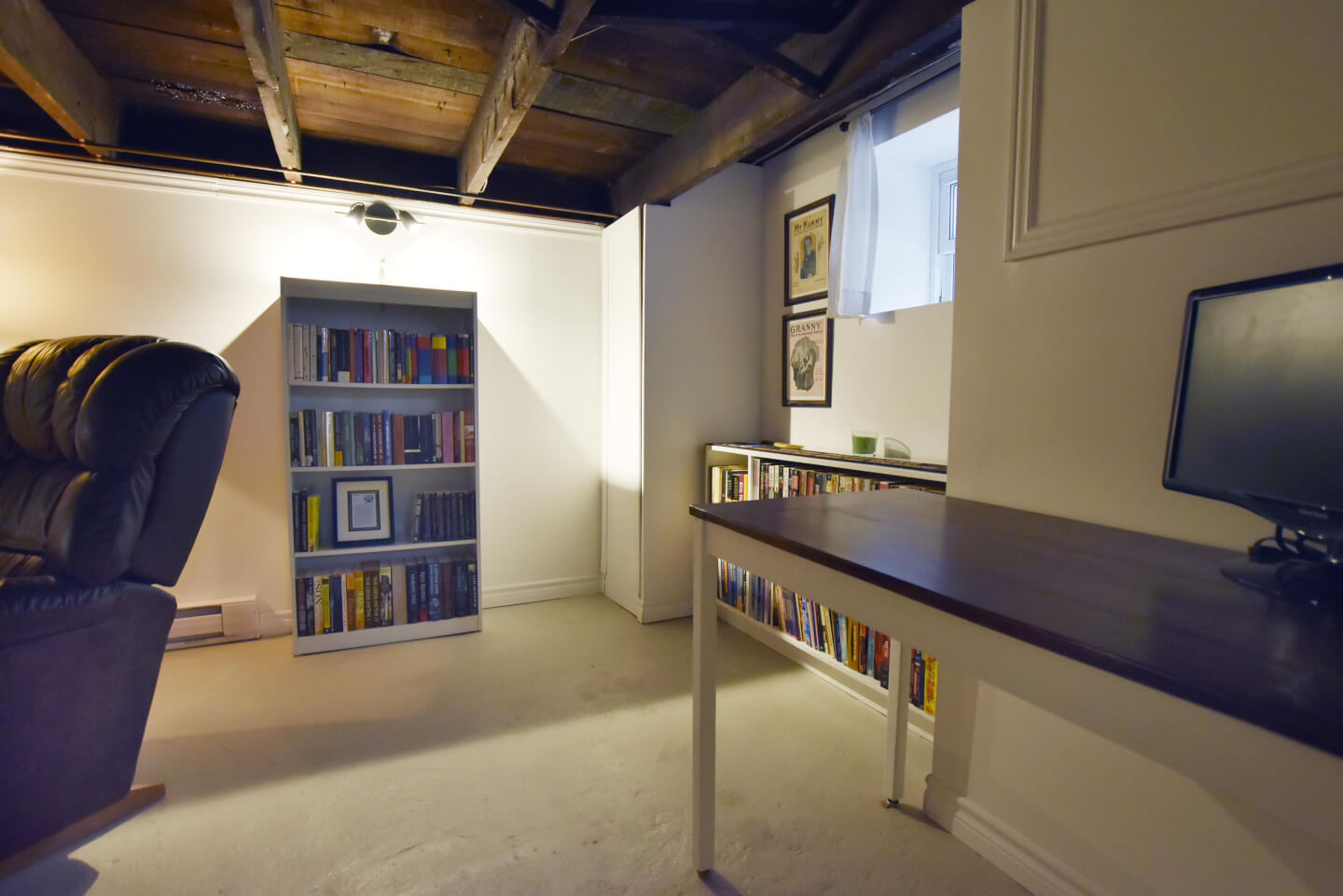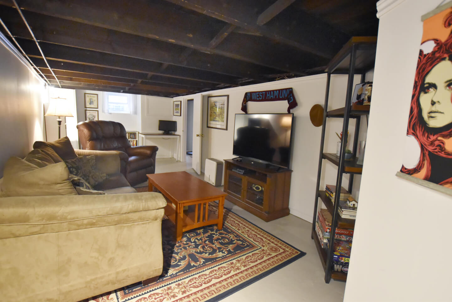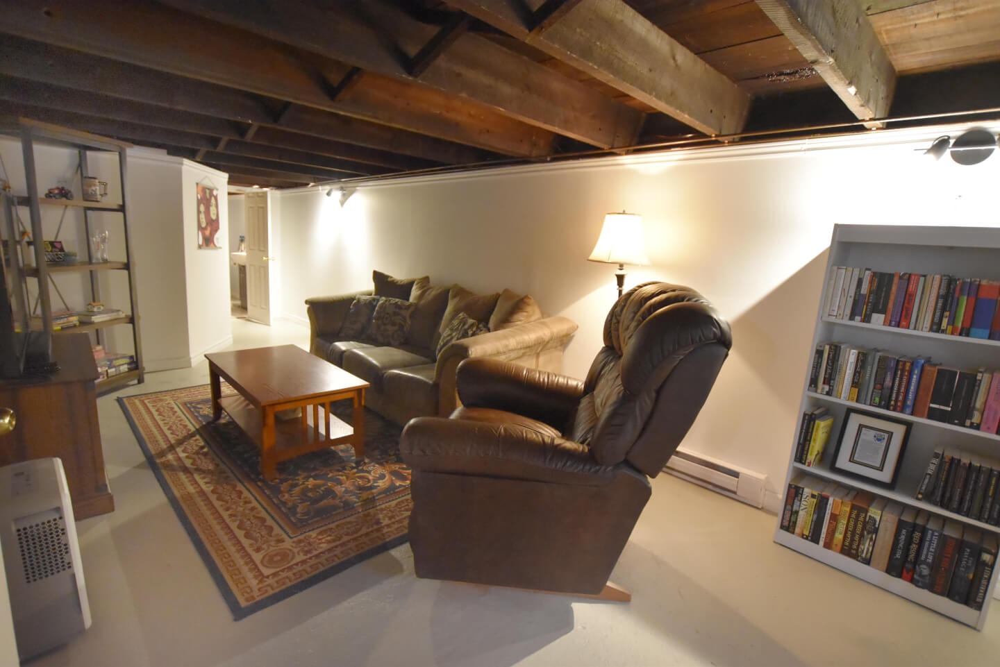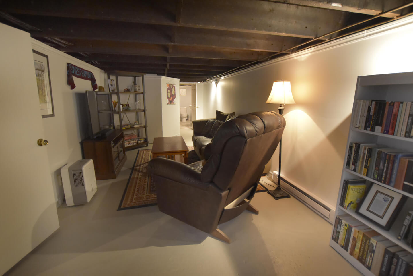 Sous-sol fini, plancher de béton avec solives exposées