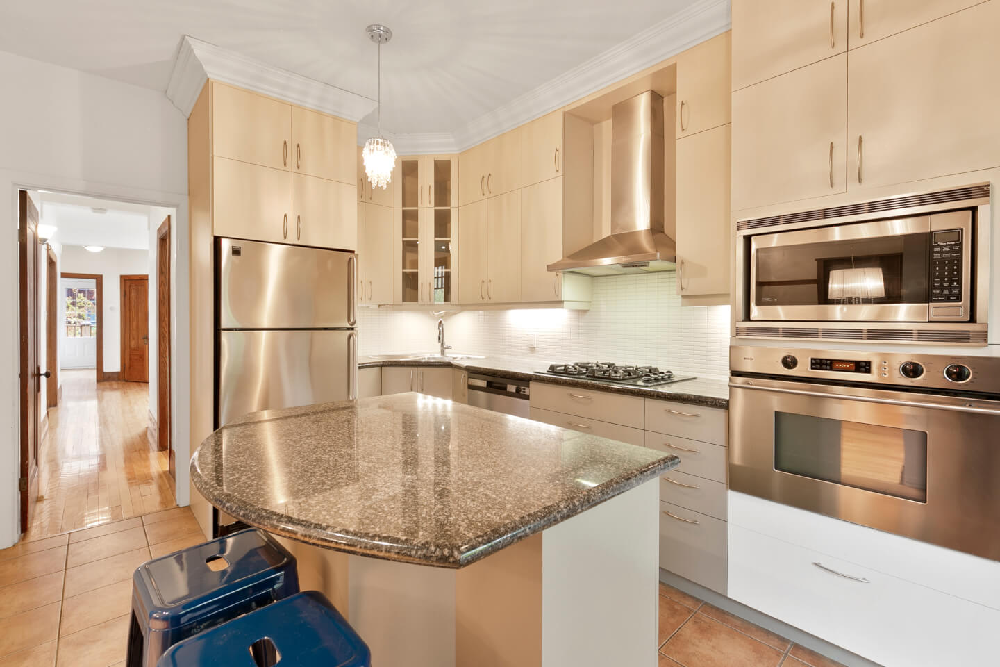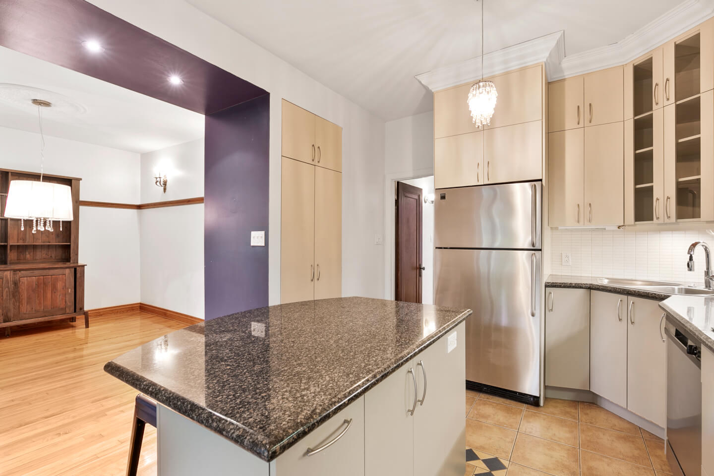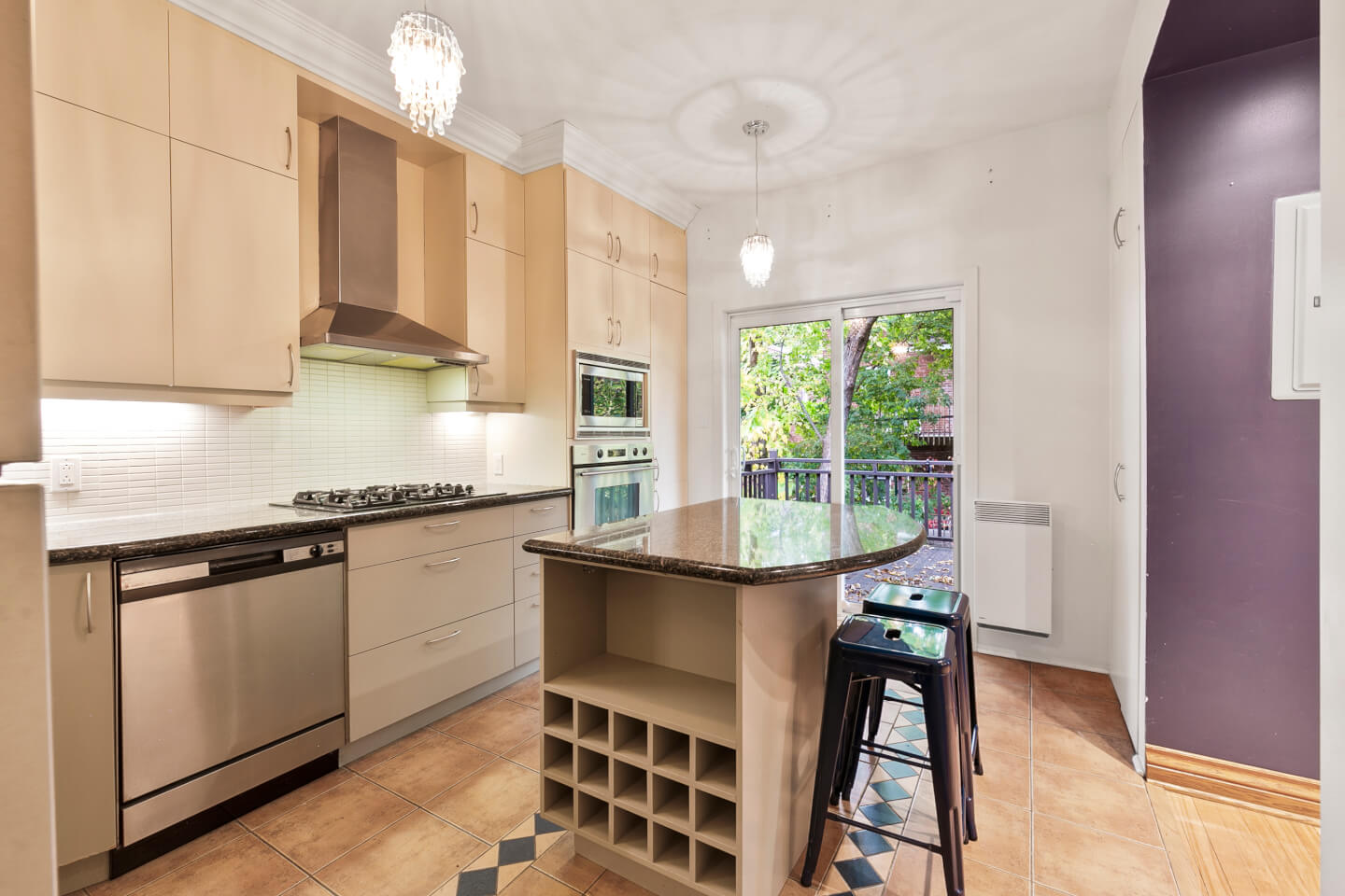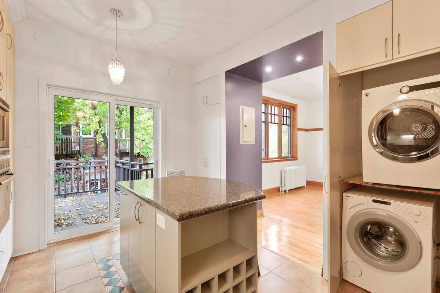 Cuisine, armoires de mélamine, comptoirs de granit, plancher céramique, lavoir, accès à la terrasse arrière