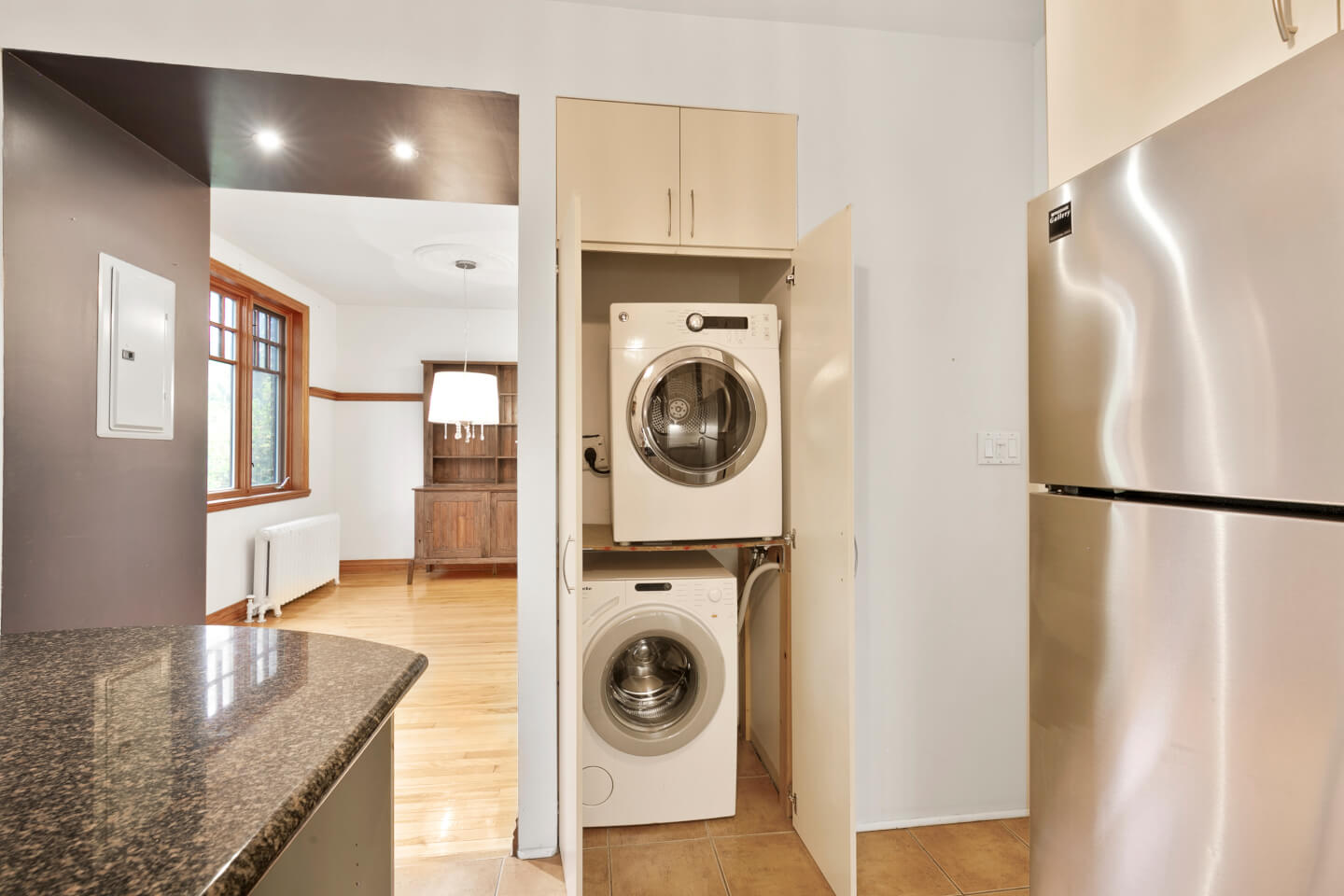 Inclusions : Luminaires, fixtures murales à la salle à manger, ventilateur, four encastré, four micro-ondes encastré, lave-vaisselle, réfrigérateur, laveuse, sécheuse, stores, support à télé au salon, tous tels quels