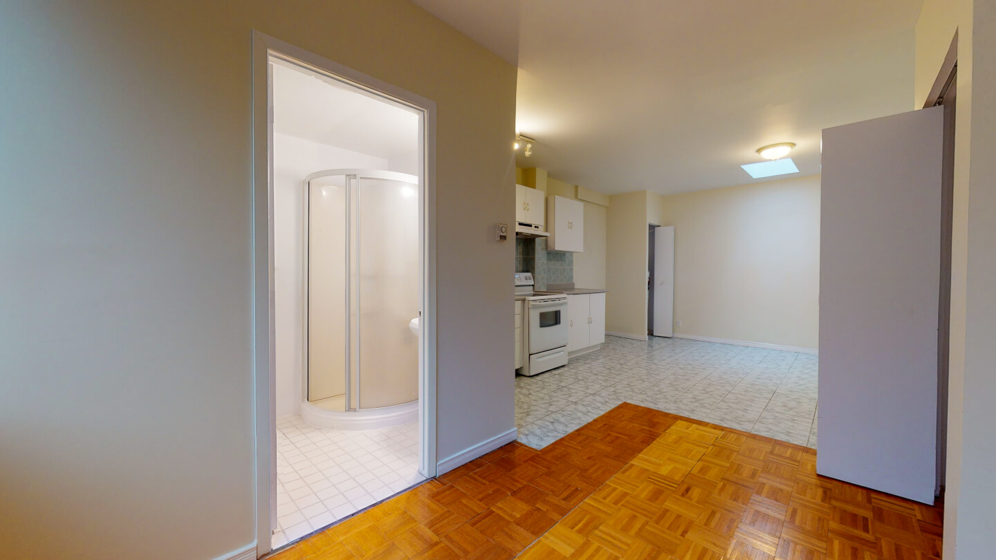 Cuisine complète avec électroménagers et espace repas, ainsi qu’une salle de bains avec douche
