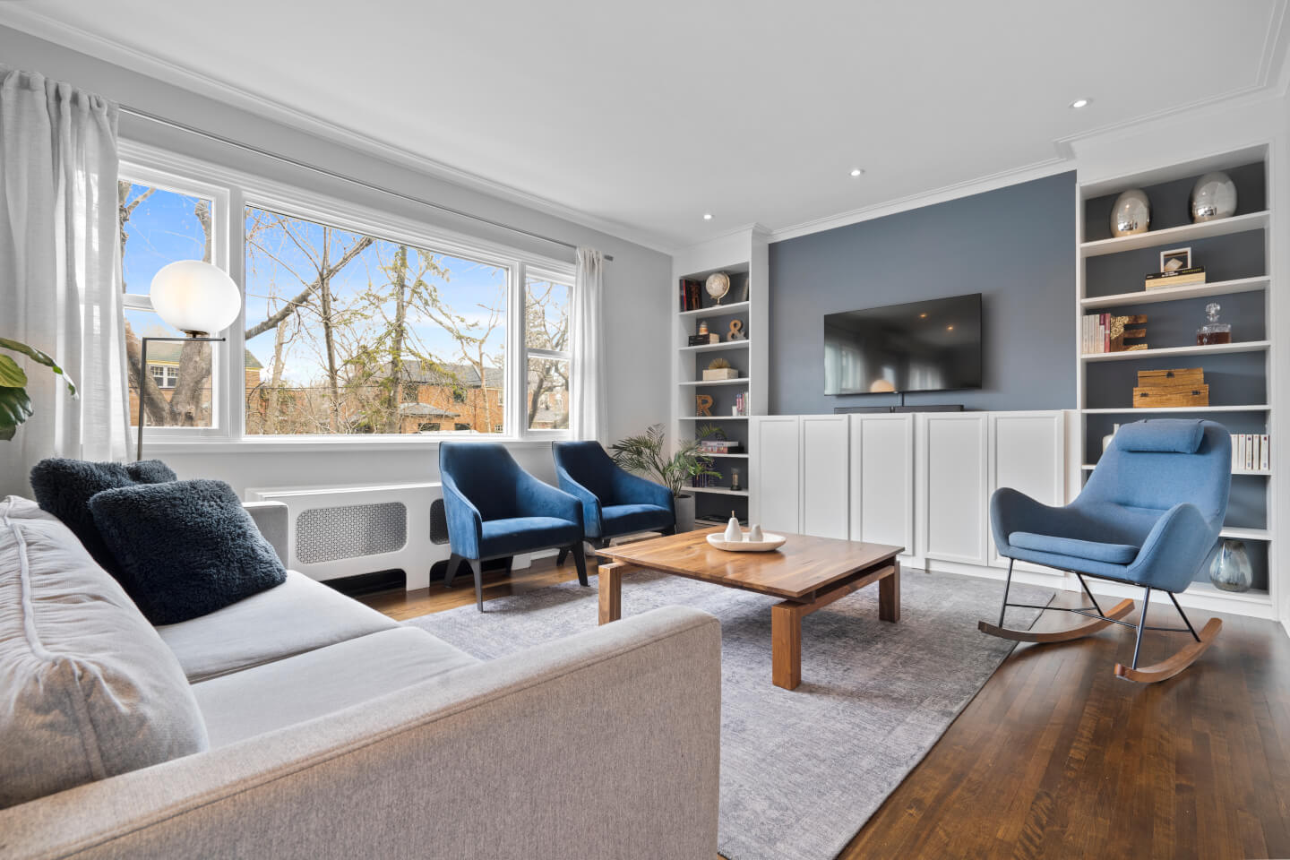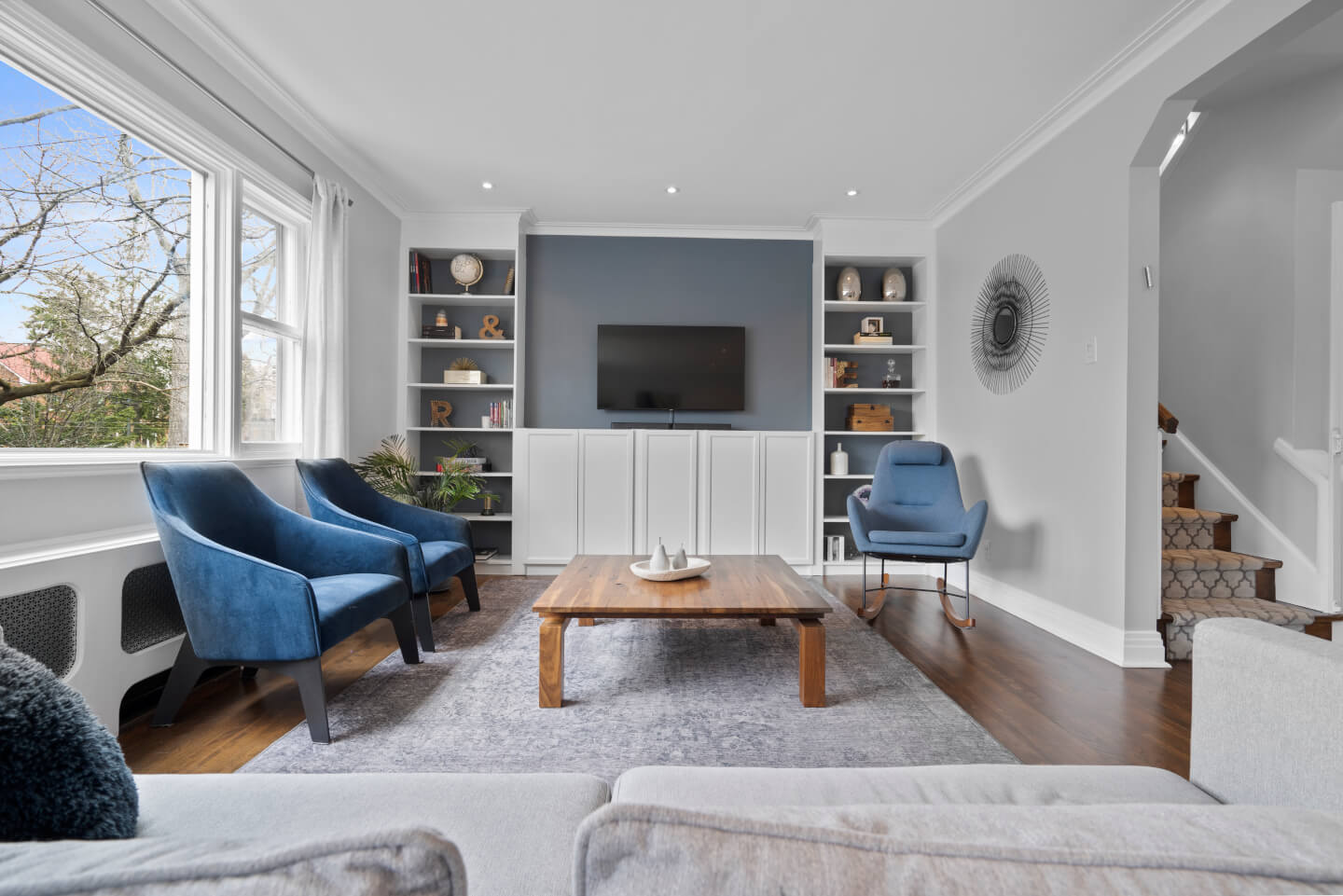 Salon avec meuble multimédia style bibliothèque sur mesure ouvert sur la salle à manger et cuisine
