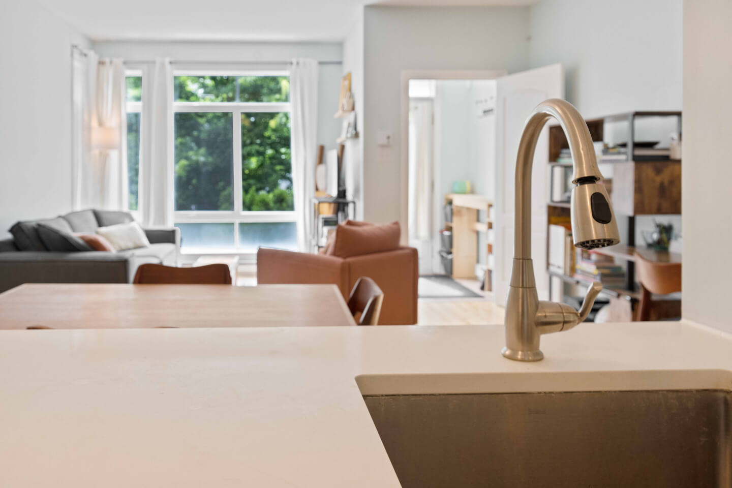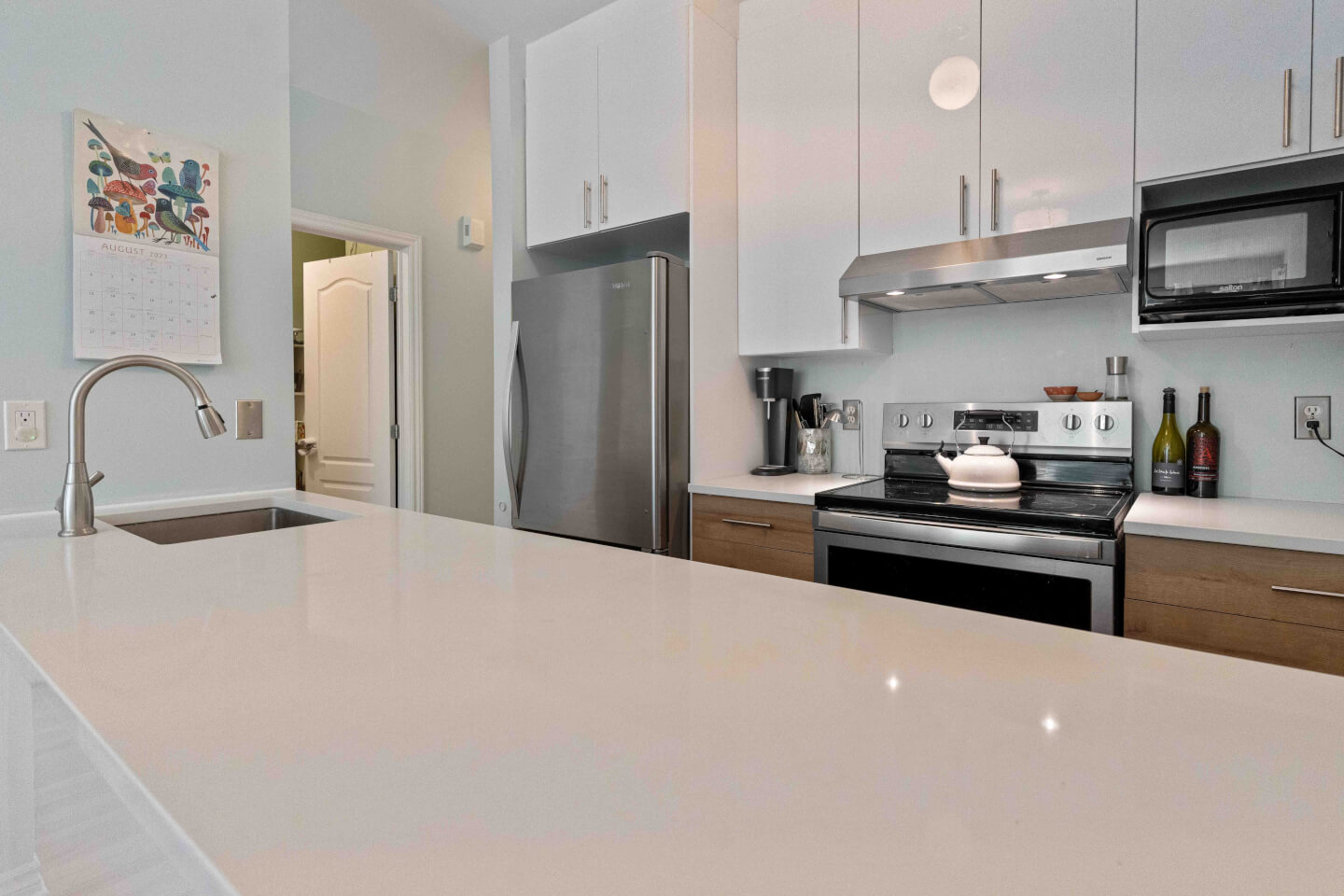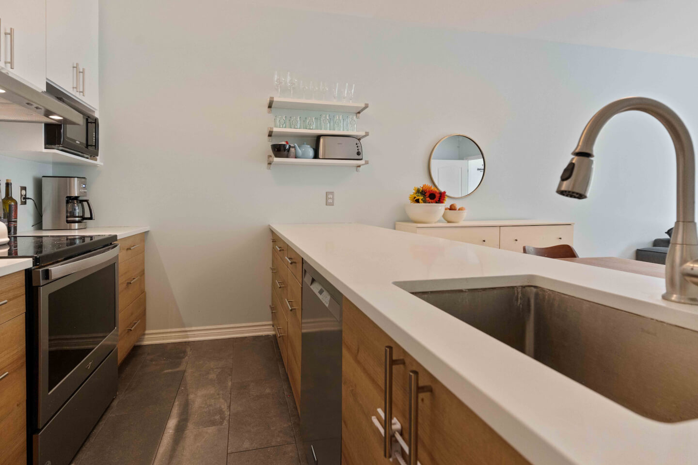 Cuisine rénovée 2021, comptoir de quartz avec comptoir-déjeuner et plancher en céramique