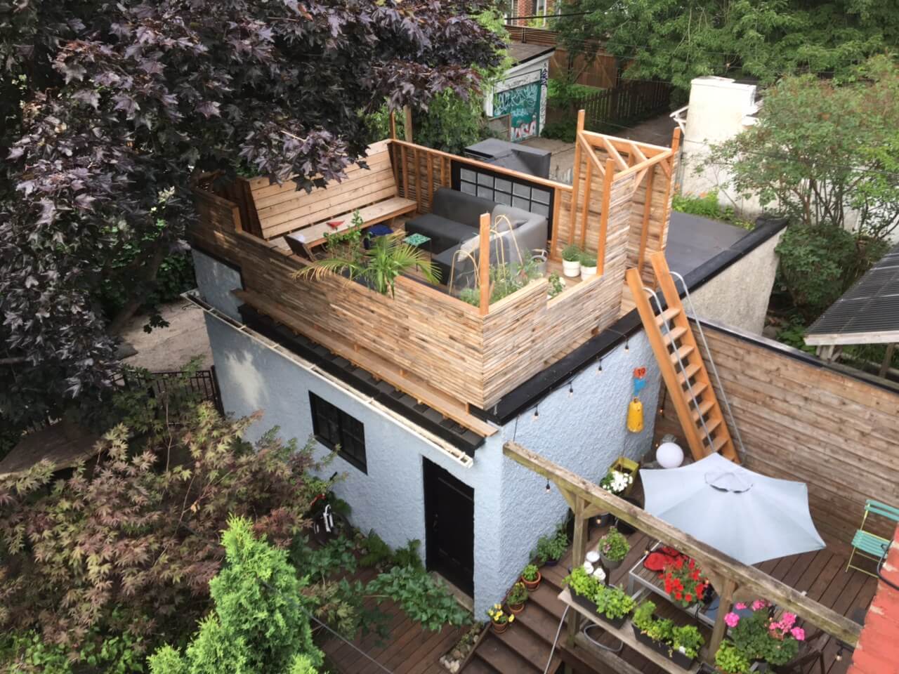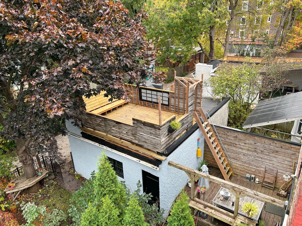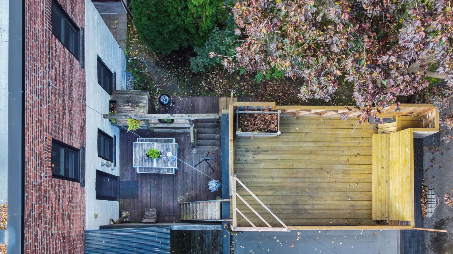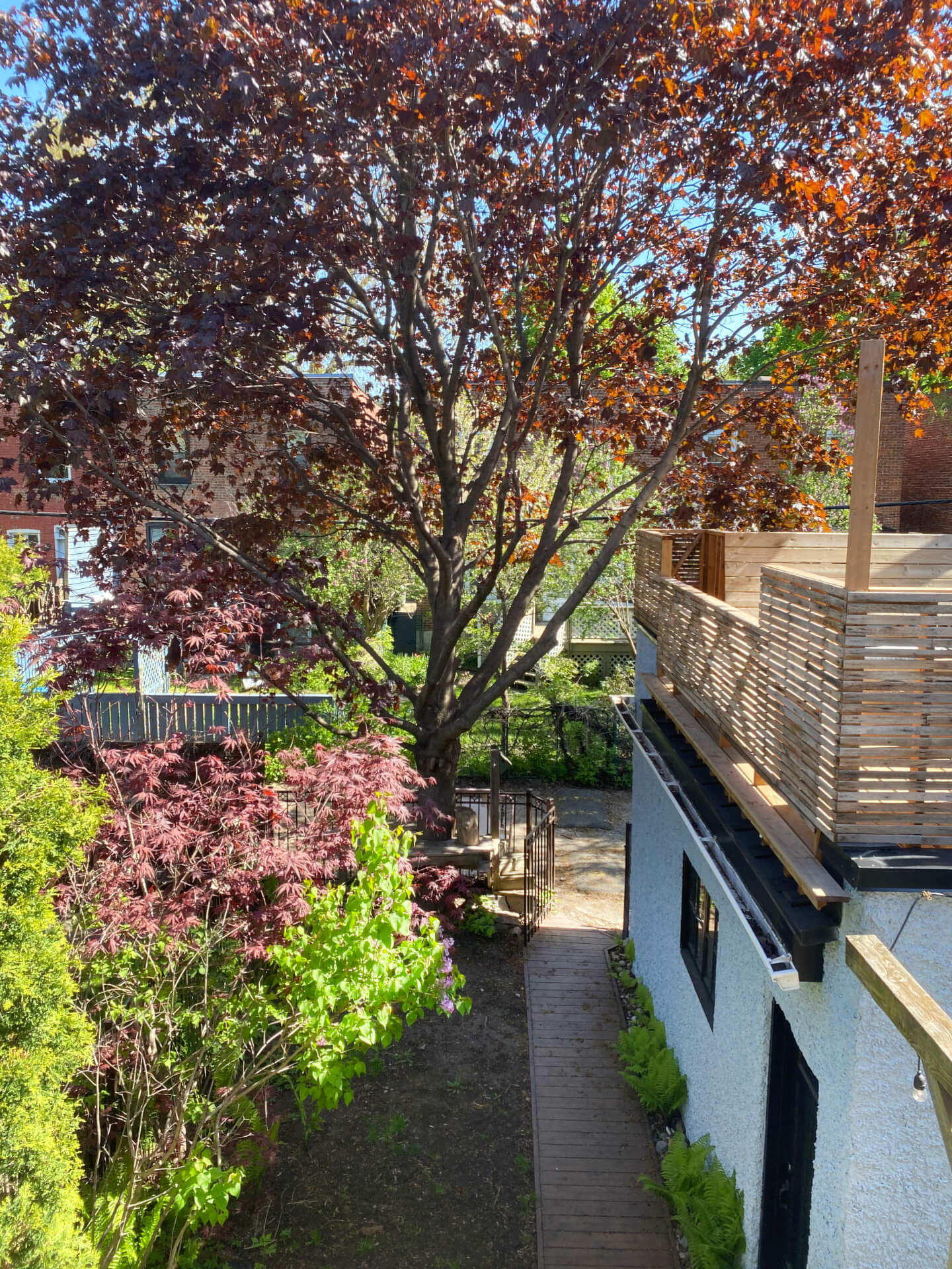 Accès à la terrasse et celle sur le garage, le petit jardin aménagé et accès à la ruelle