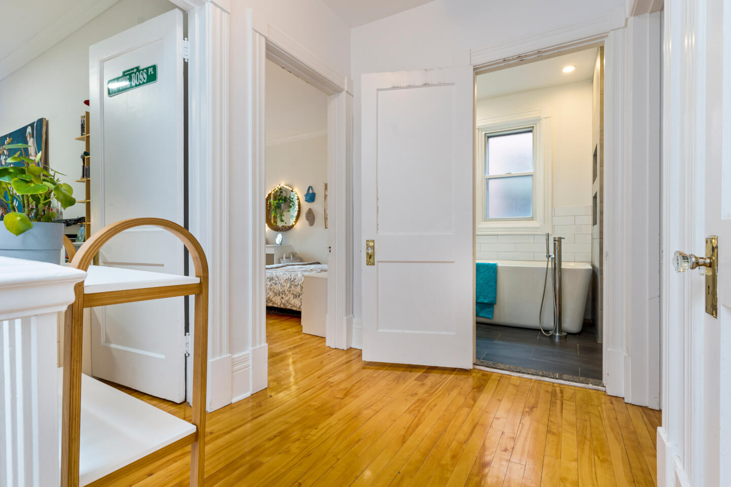 Planchers de bois franc, boiseries peintes, poutres au plafonds et cimaises