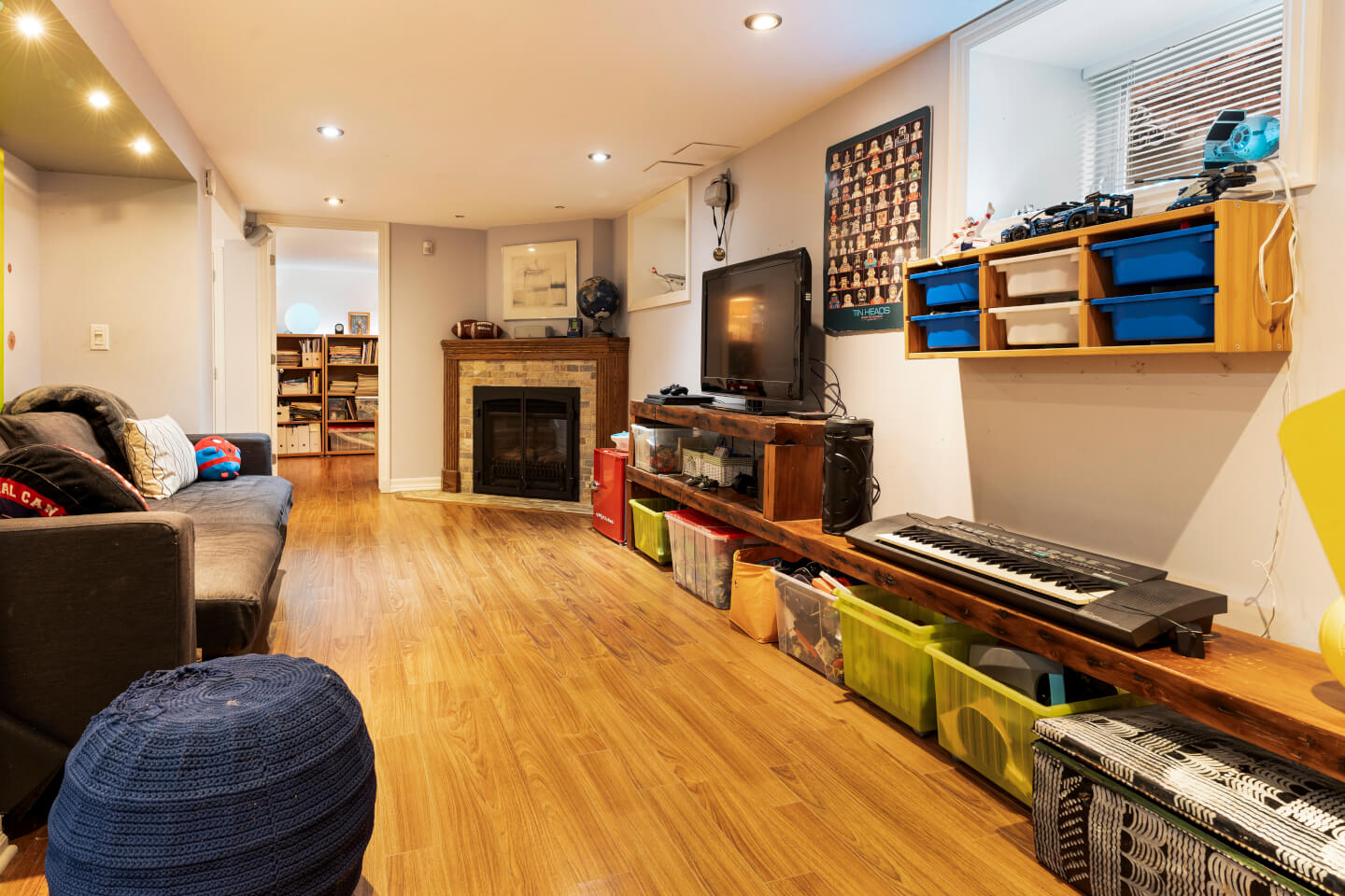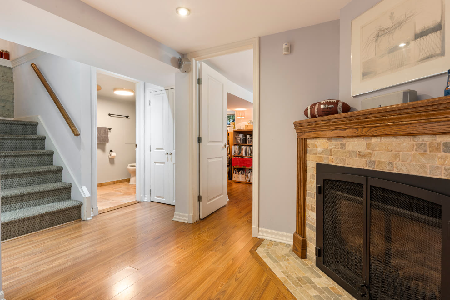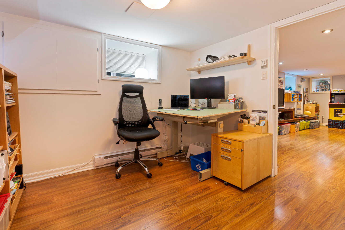 Sous-sol très bien fini sur plancher flottant Hauteur des plafonds 6’-8’’ Salle familiale avec foyer au gaz Bureau ou 4 ième chambre Salle de bains (douche) sur plancher chauffant Lavoir, rangement Accès – sortie* au jardin