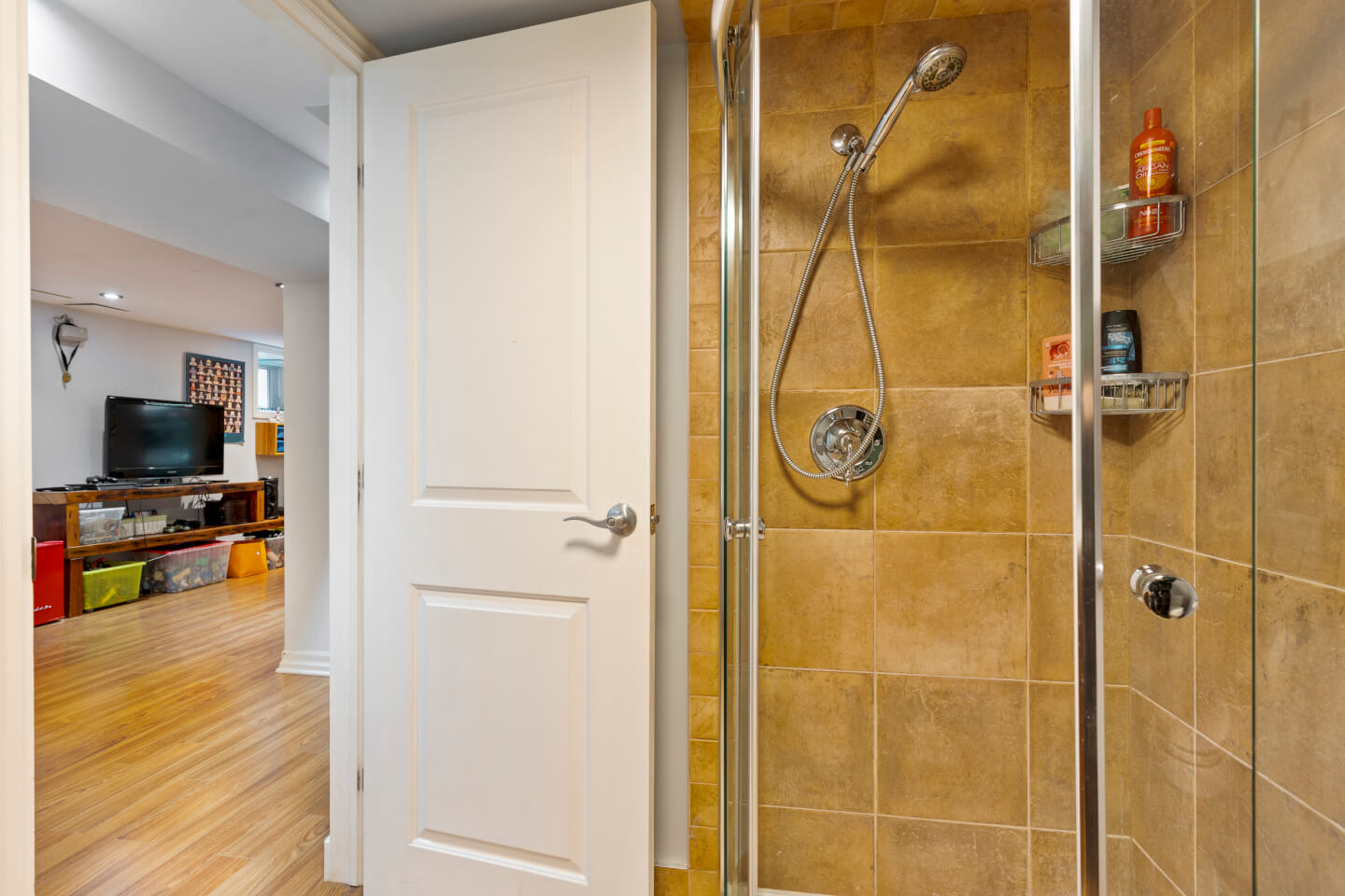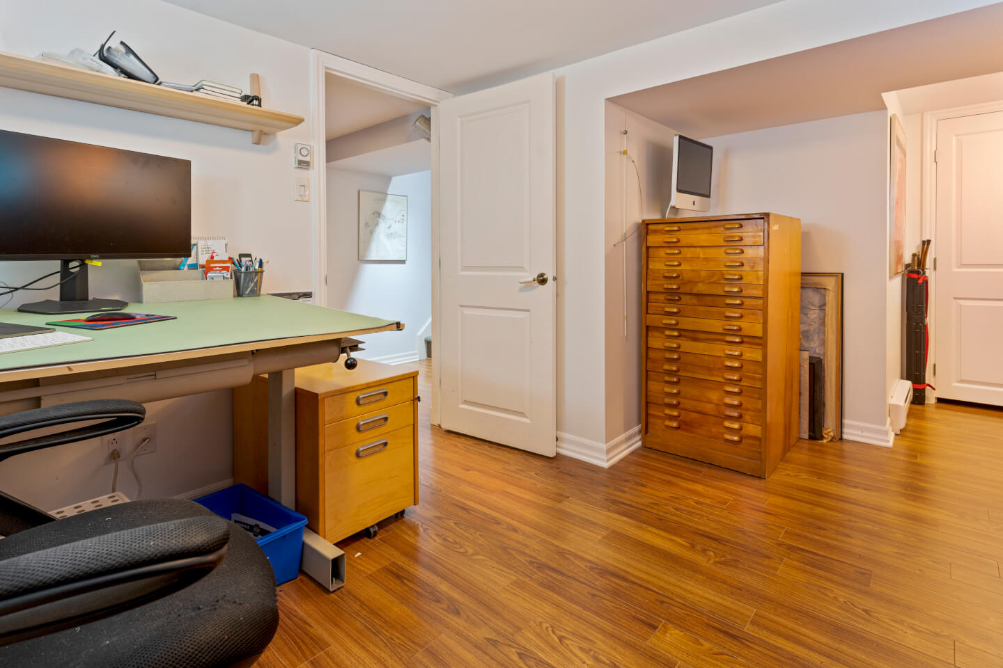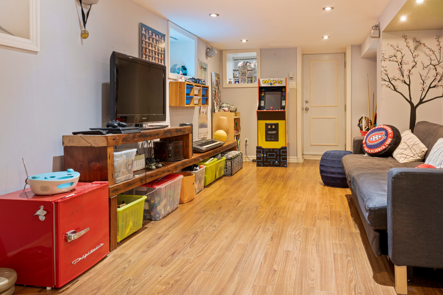 Sous-sol très bien fini sur plancher flottant Hauteur des plafonds 6’-8’’ Salle familiale avec foyer au gaz Bureau ou 4 ième chambre Salle de bains (douche) sur plancher chauffant Lavoir, rangement Accès – sortie* au jardin
