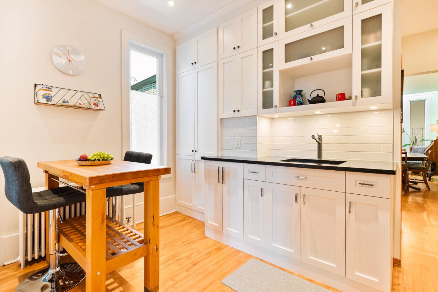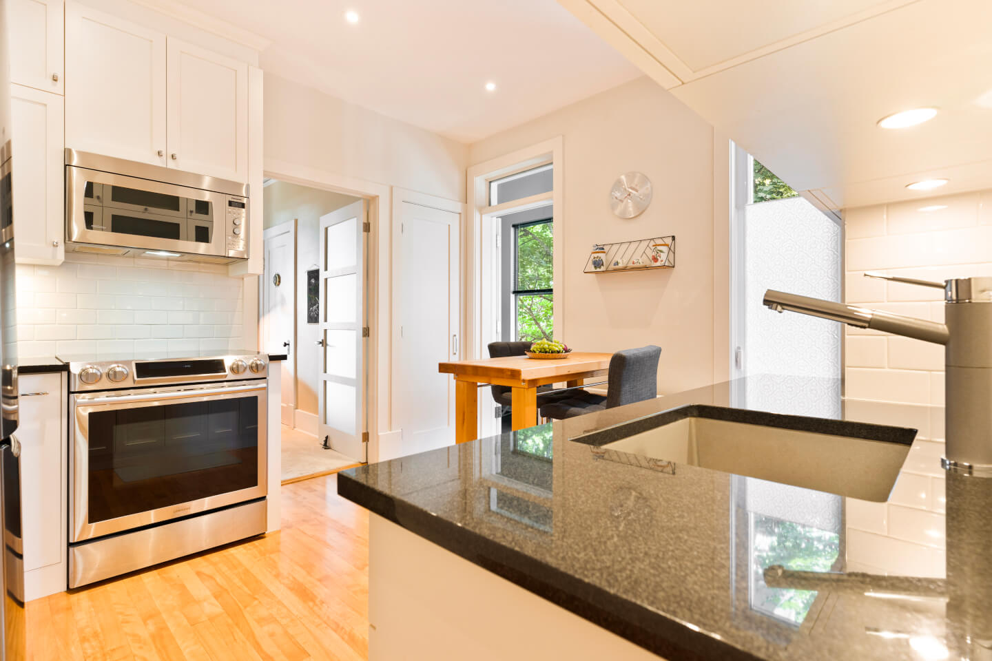 Superbe petite cuisine rénovée & petit coin repas donnant sur un solarium privé entouré d’arbres.