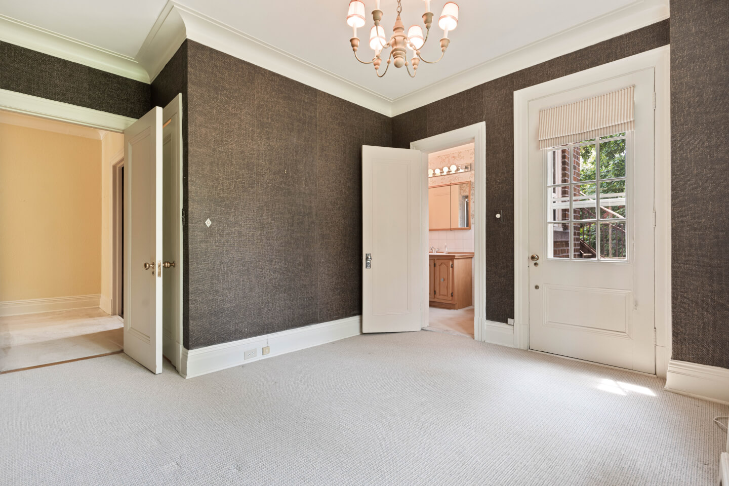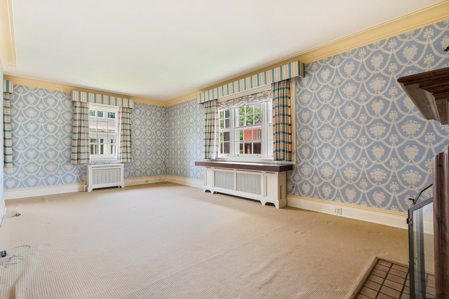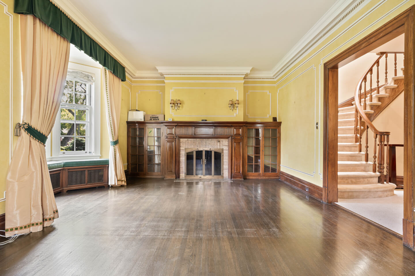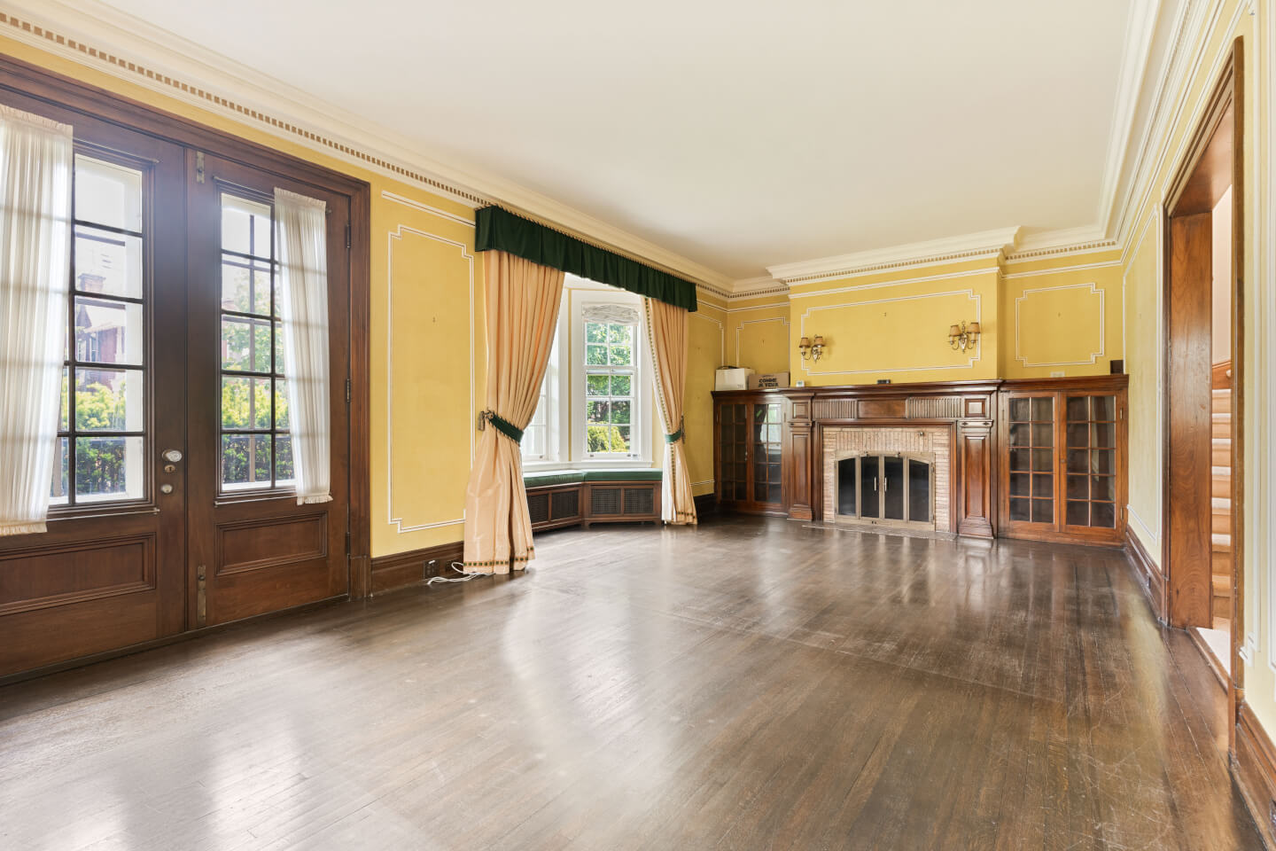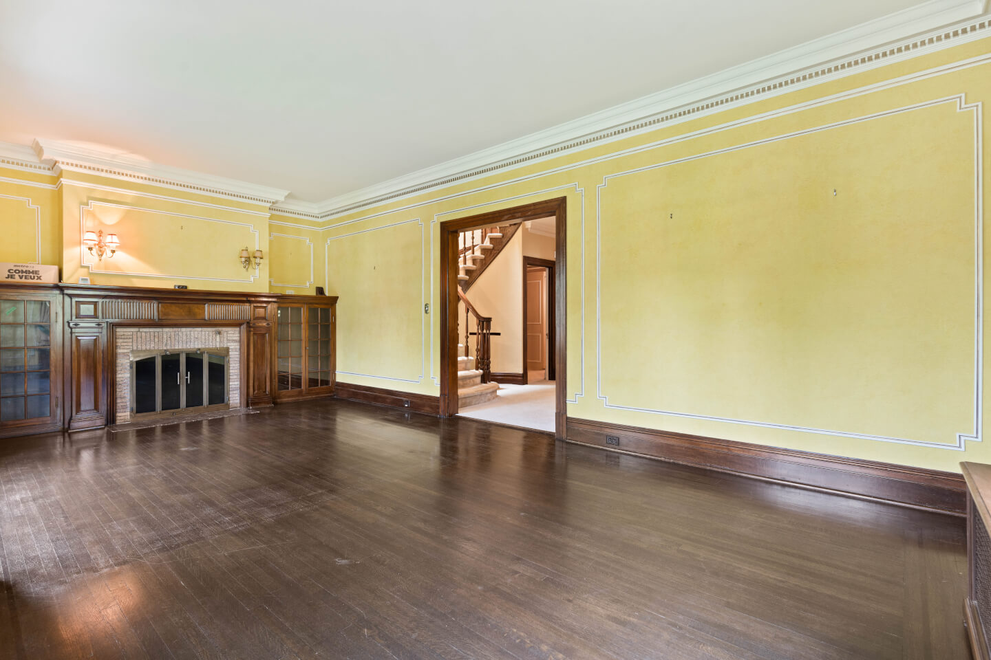 Salon élégant avec foyer d’origine, fenestration en baie, encastrés et portes françaises