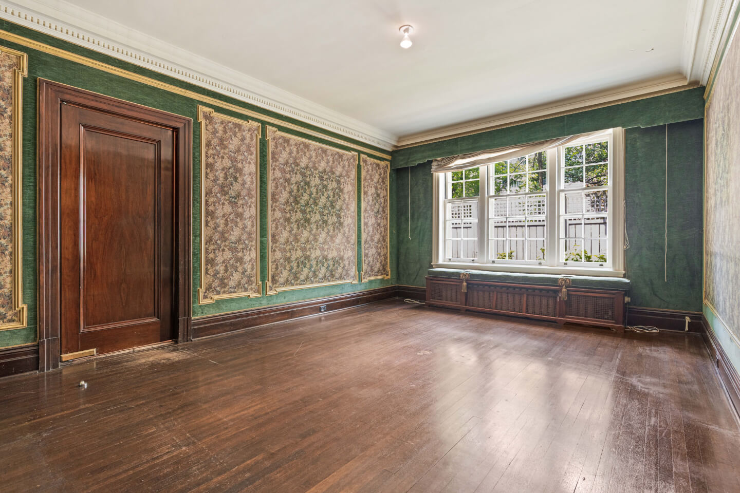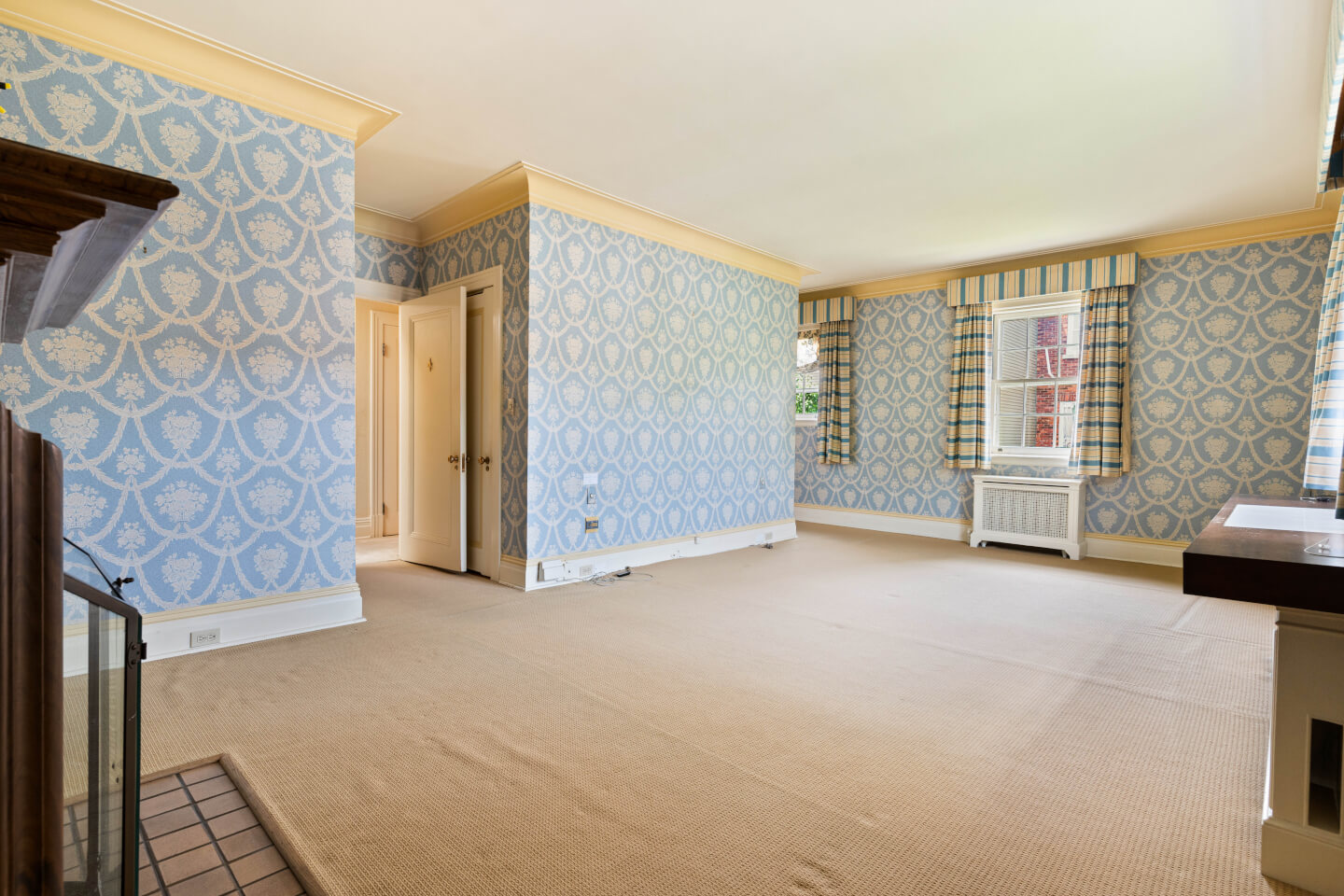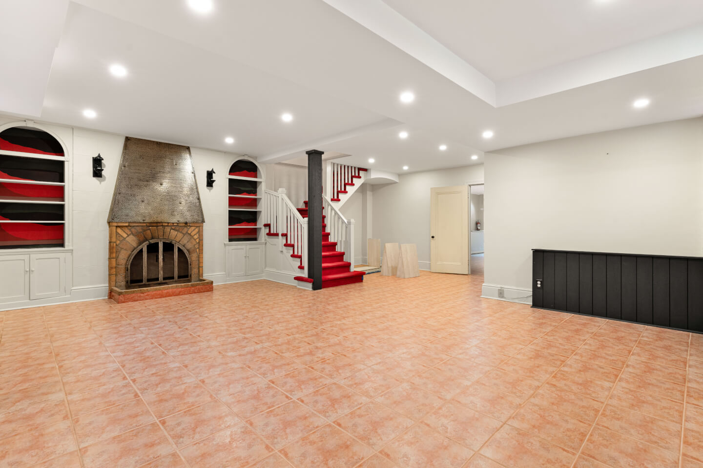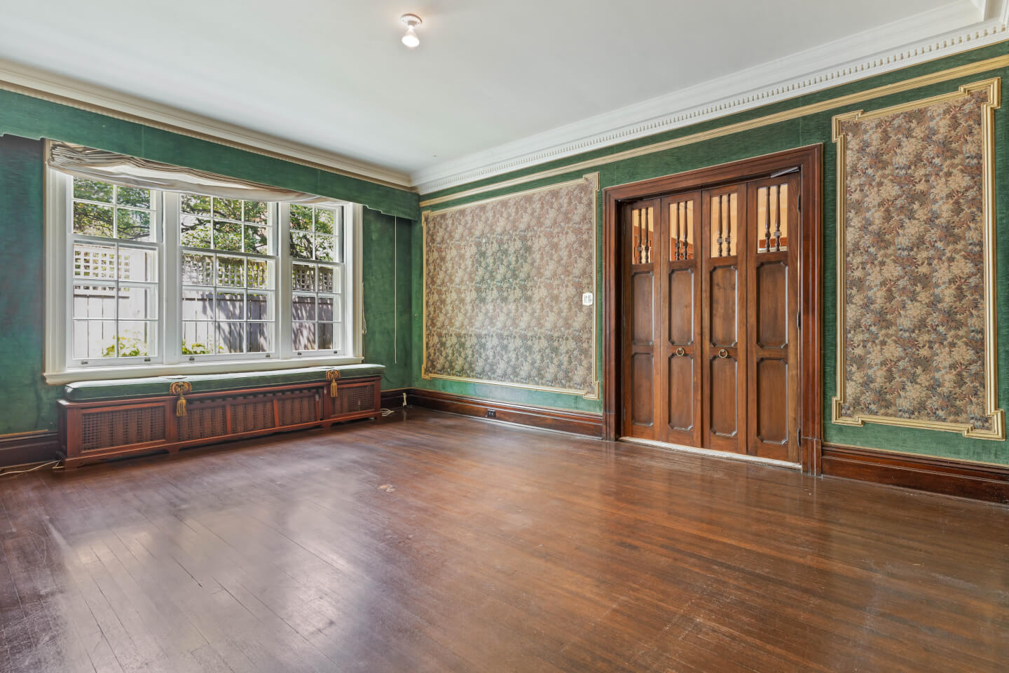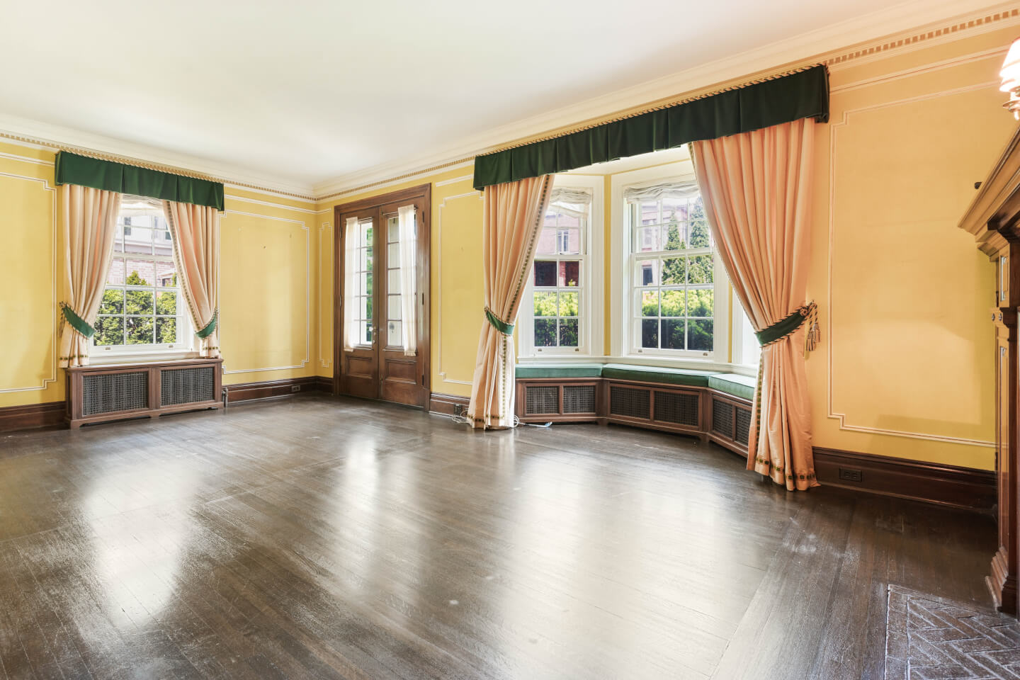 Salon élégant avec foyer d’origine, fenestration en baie, encastrés et portes françaises