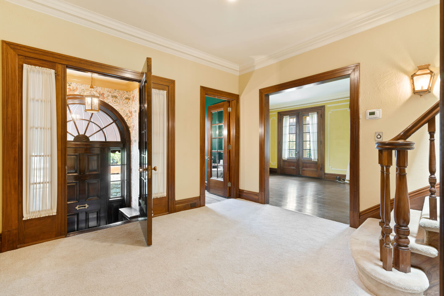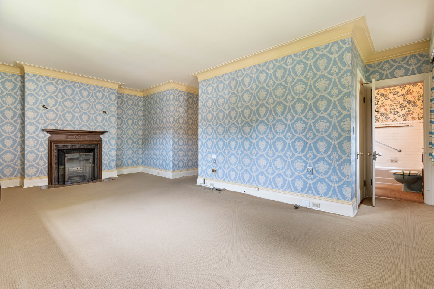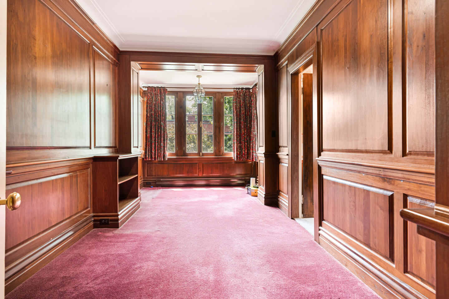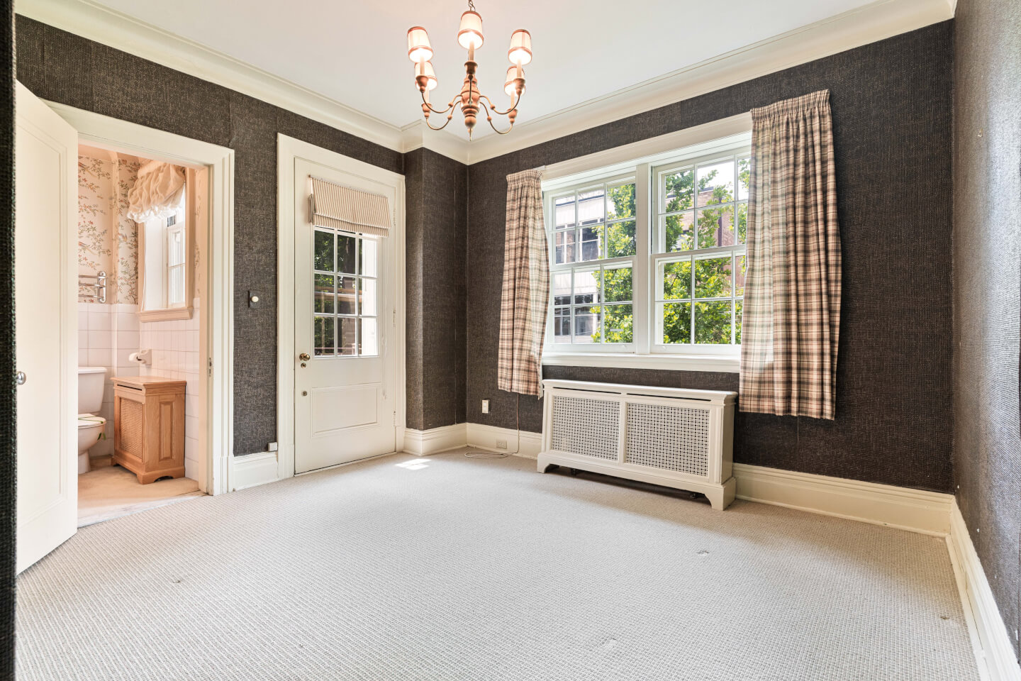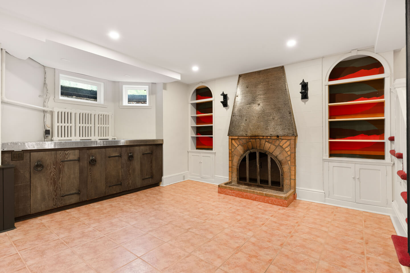 Salon élégant avec foyer d’origine, fenestration en baie, encastrés et portes françaises