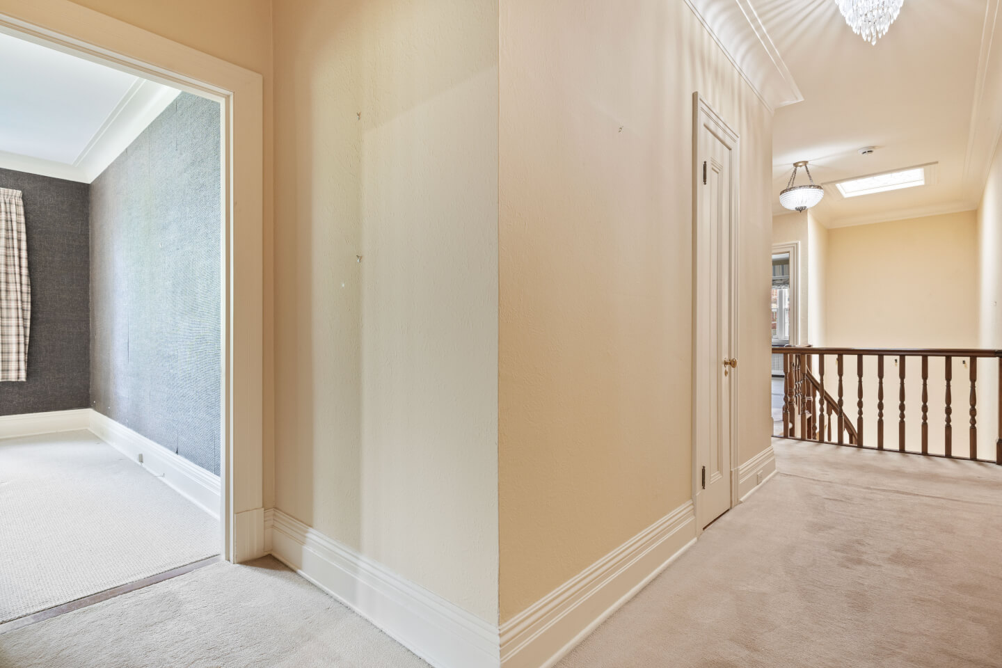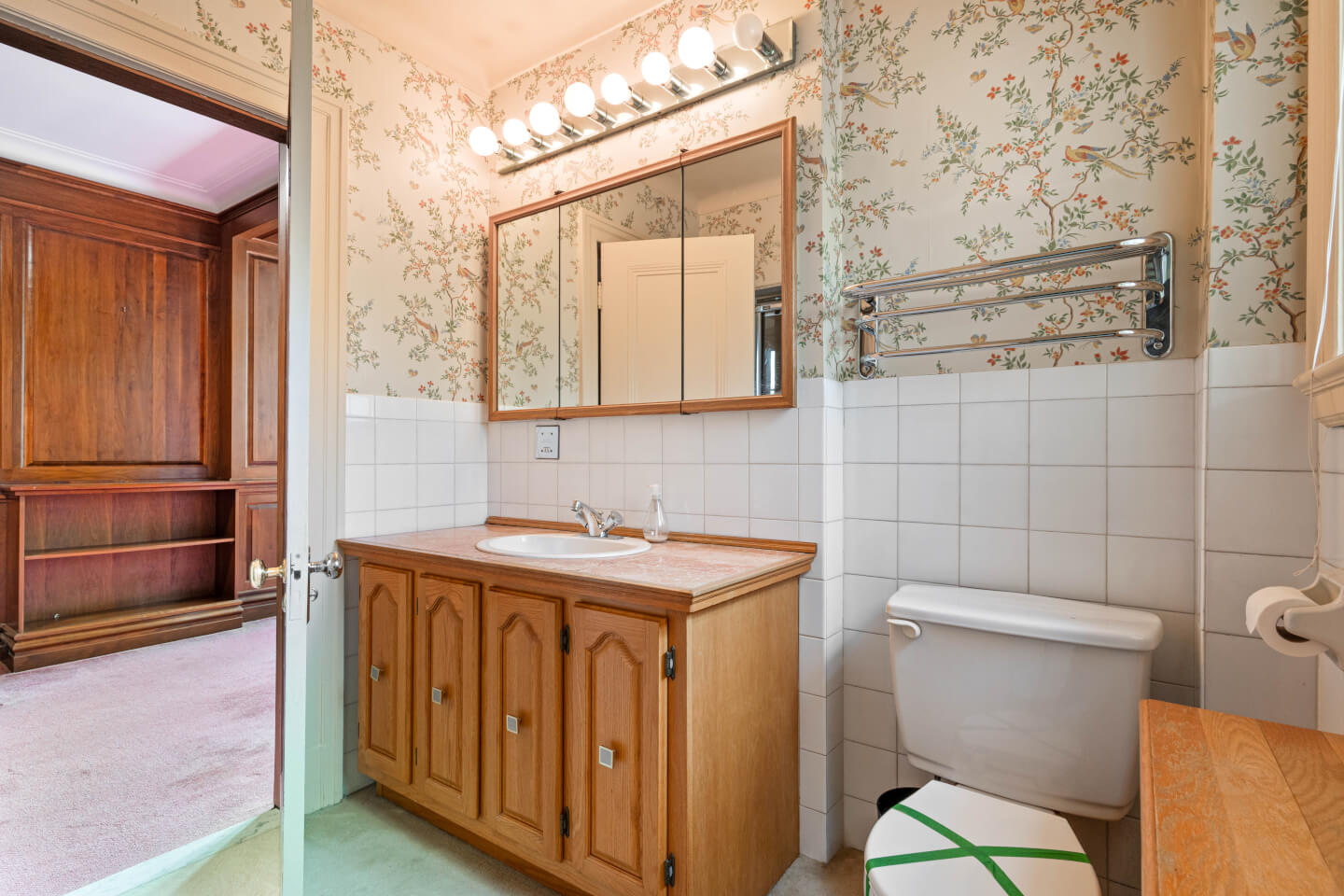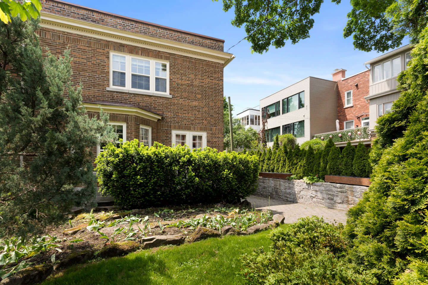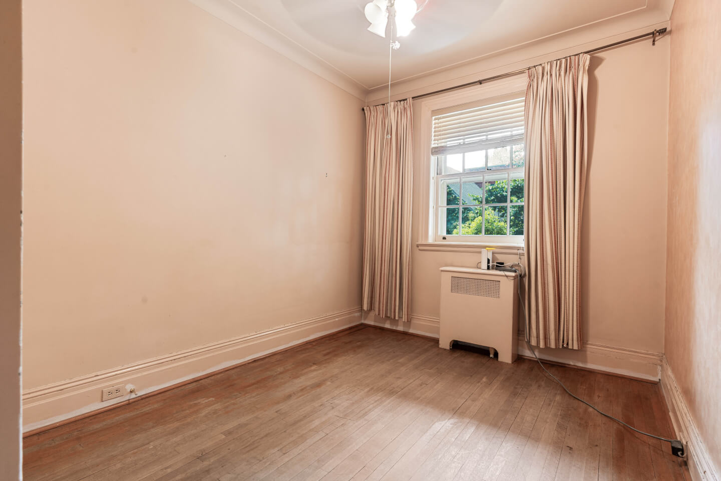 Salon élégant avec foyer d’origine, fenestration en baie, encastrés et portes françaises